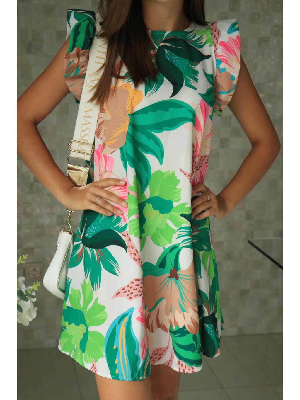 💃 Stylové dámské šaty vyrobené z kvalitního materiálu v kombinaci barviček (bílá, tmavá a světlá zelená, růžová, béžová...). Šaty mají áčkový střih a jsou ozdobeny volánkem na rukávu pro dámský vzhled.