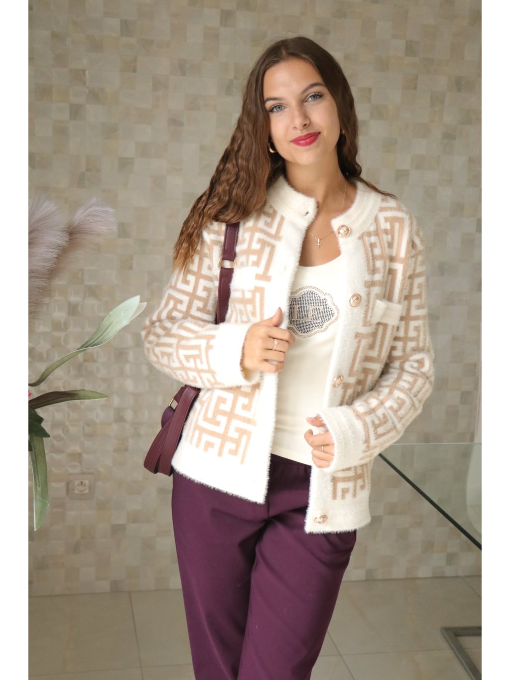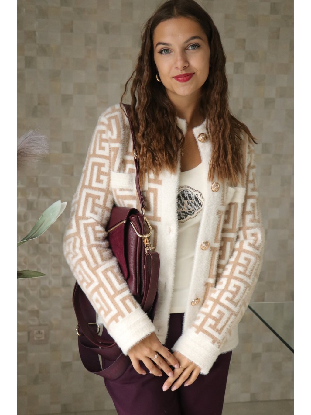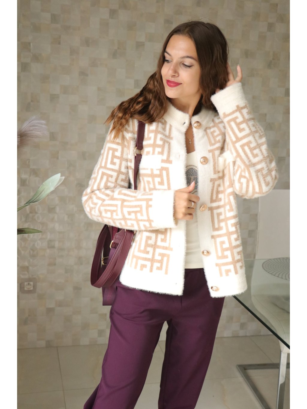 Krátký, elegantní kabátek v nadčasovém béžovo‑bílém provedení s výraznými zlatými knoflíky — design „à la Fendi“ (inspirovaný luxusním stylem), který působí sofistikovaně a přitom moderně. Ideální kouskem pro sezonu podzim–zima, který díky alpakovému vlákru nabízí měkký dotek a příjemné zateplení.