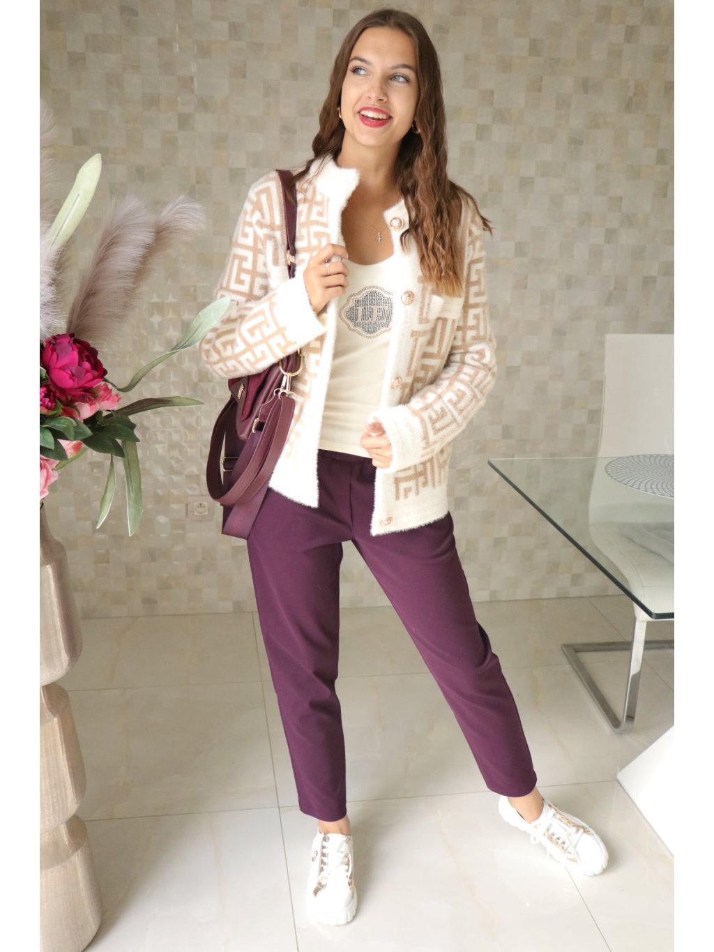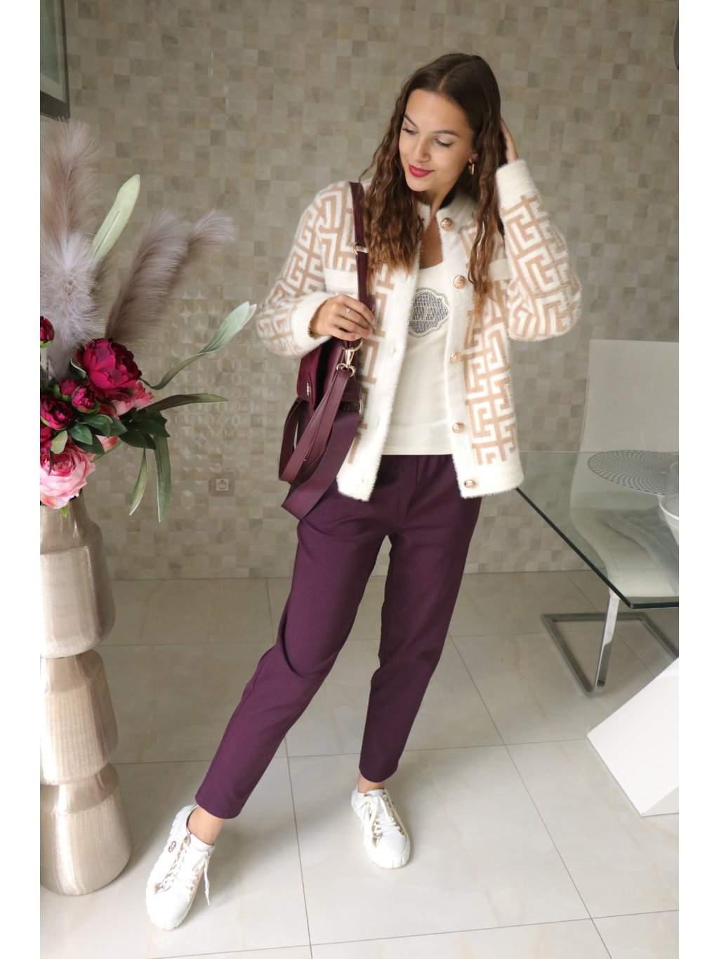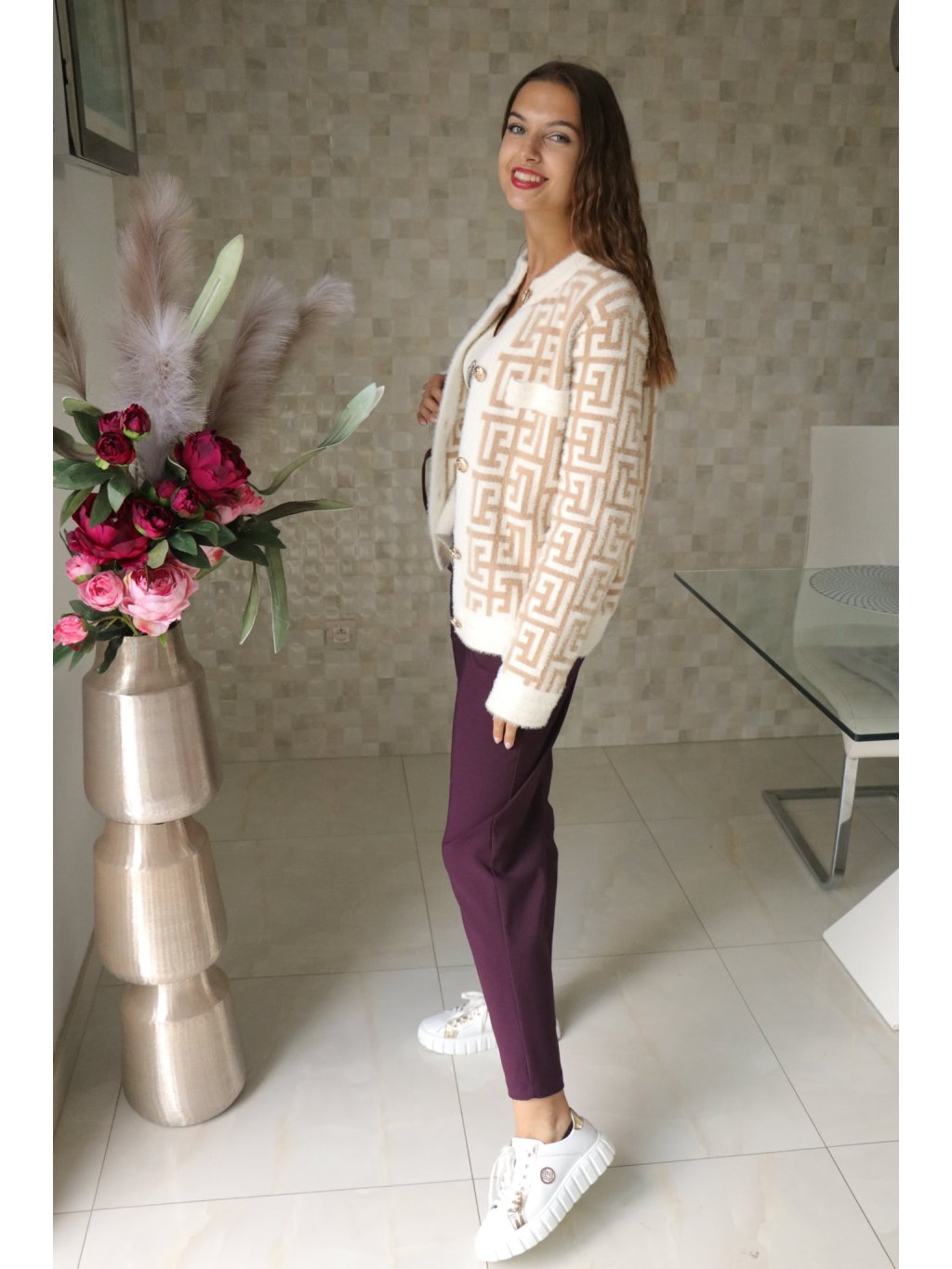 Krátký, elegantní kabátek v nadčasovém béžovo‑bílém provedení s výraznými zlatými knoflíky — design „à la Fendi“ (inspirovaný luxusním stylem), který působí sofistikovaně a přitom moderně. Ideální kouskem pro sezonu podzim–zima, který díky alpakovému vlákru nabízí měkký dotek a příjemné zateplení.