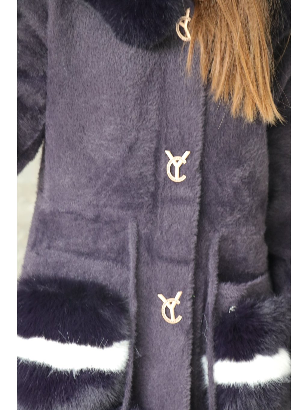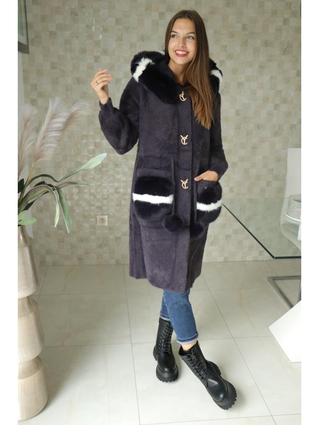 Alpakový kabát s kožešinou na předních kapsách a kapuci