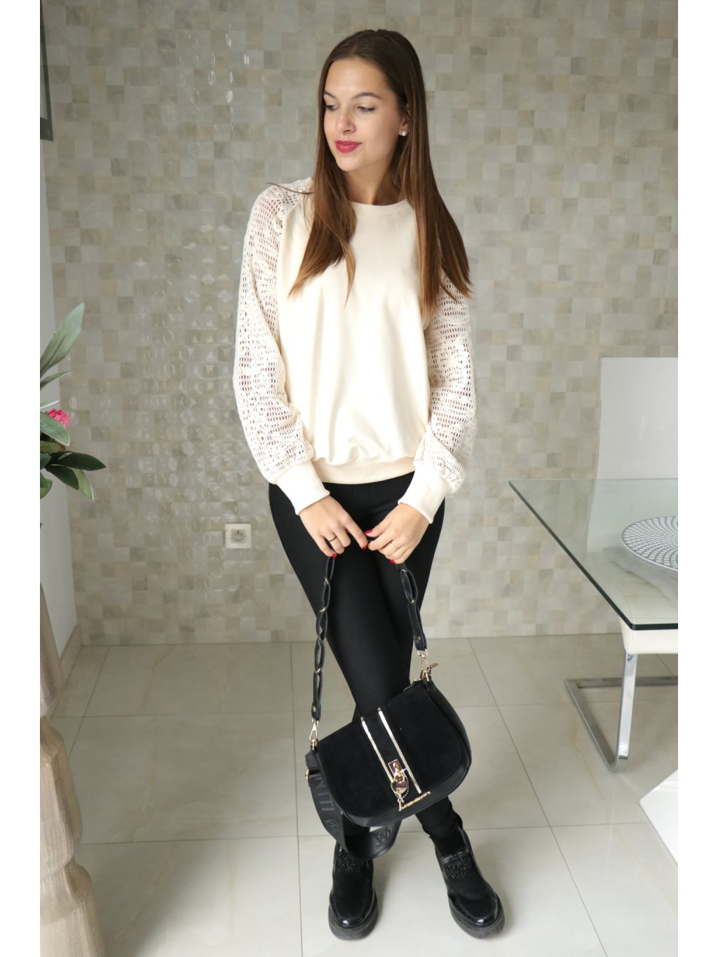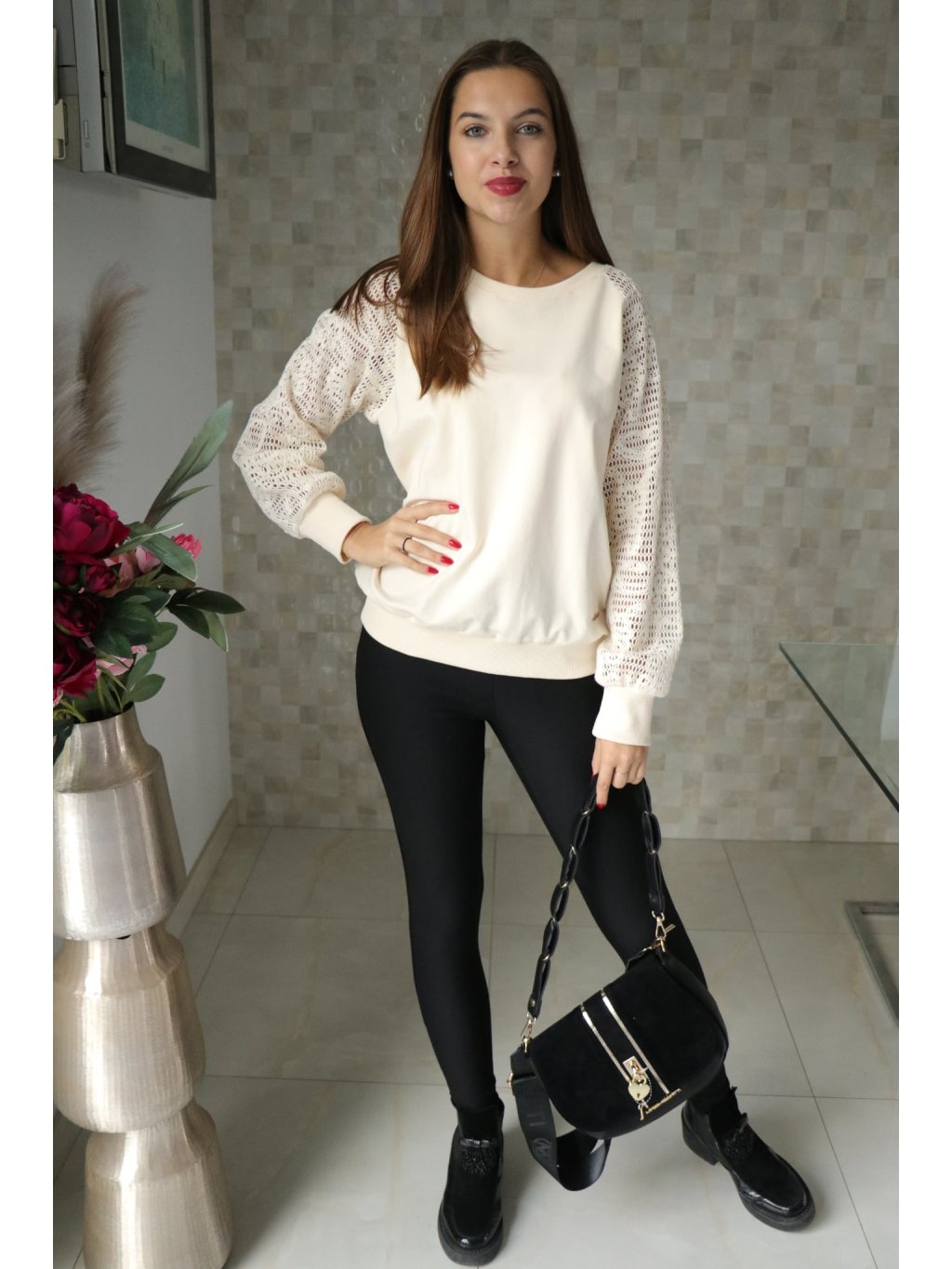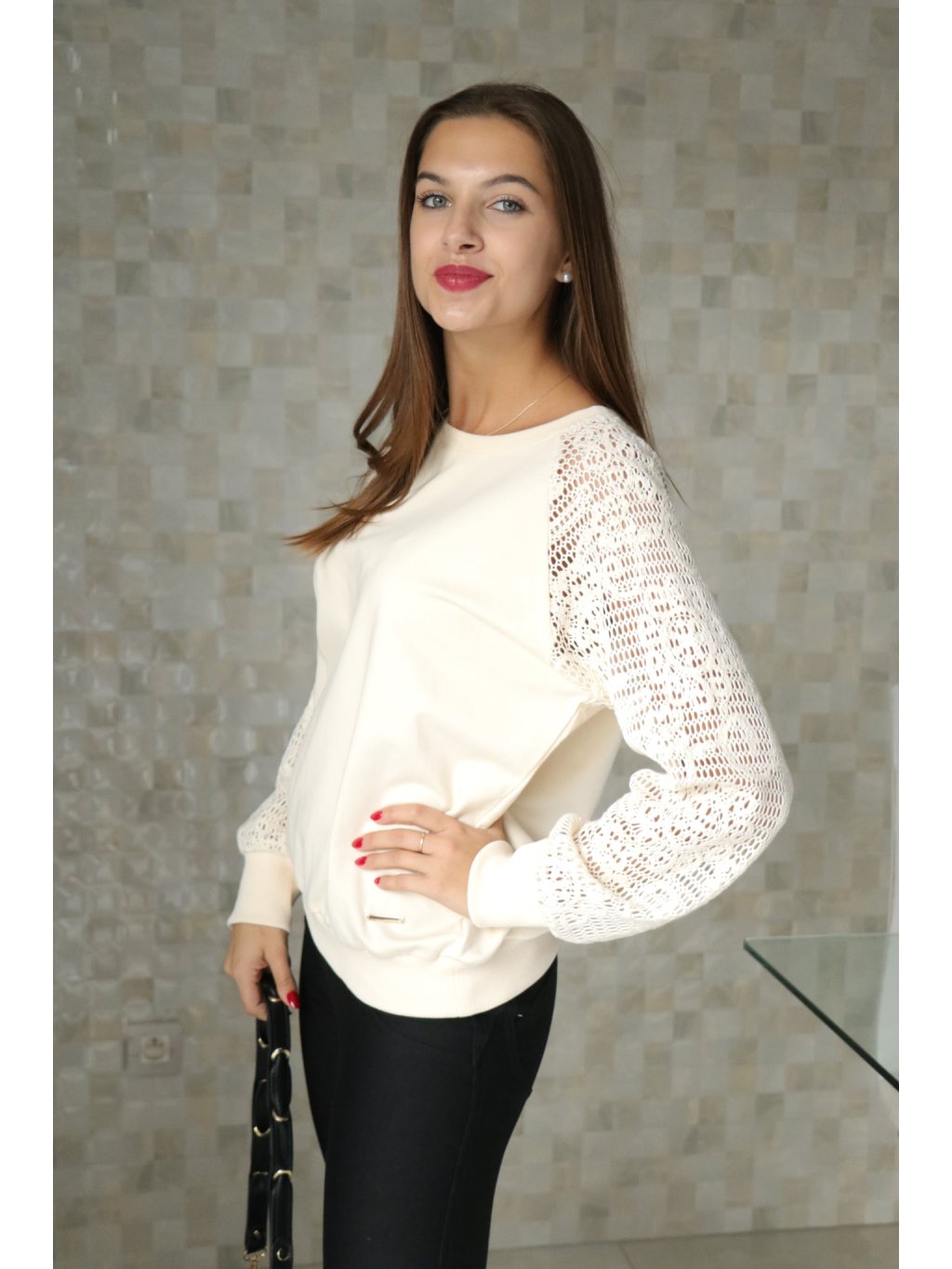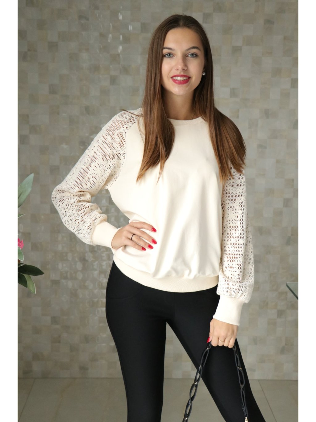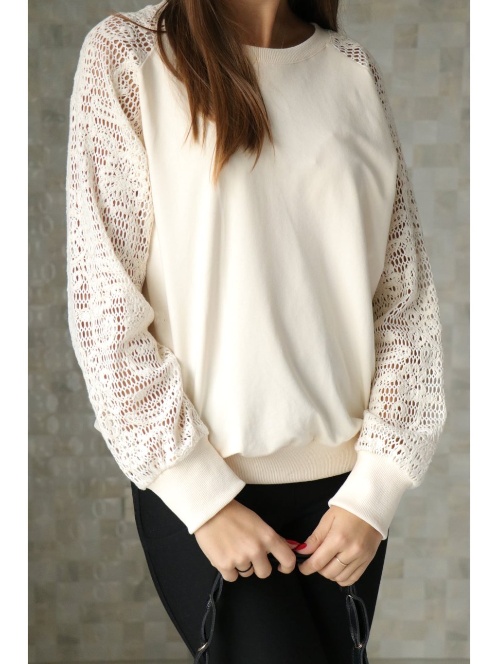 # 🤍✨ Béžová halenka s krajkovanými rukávy