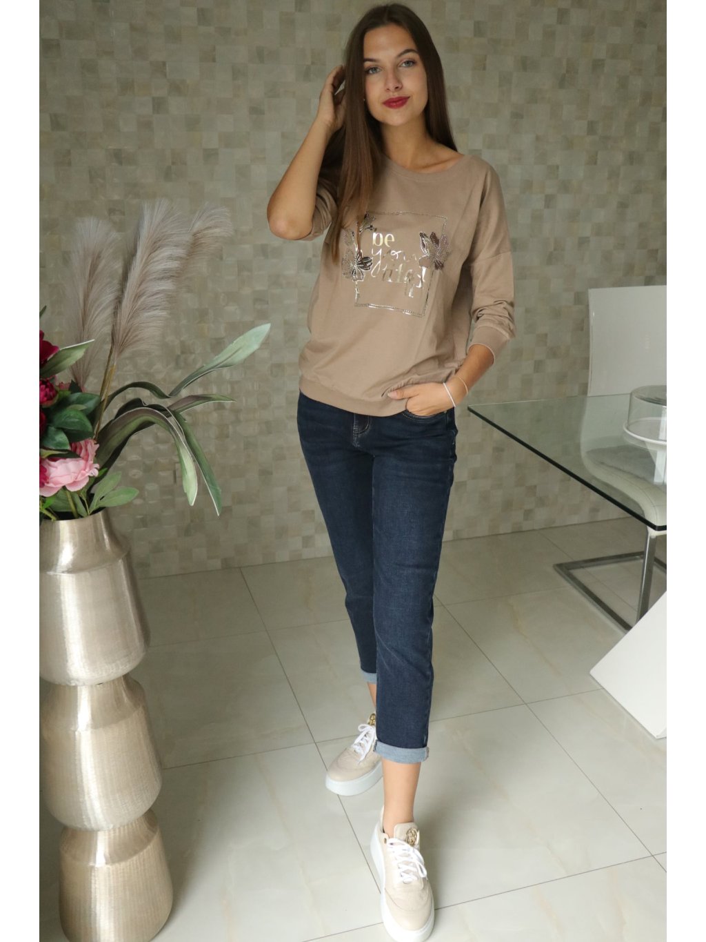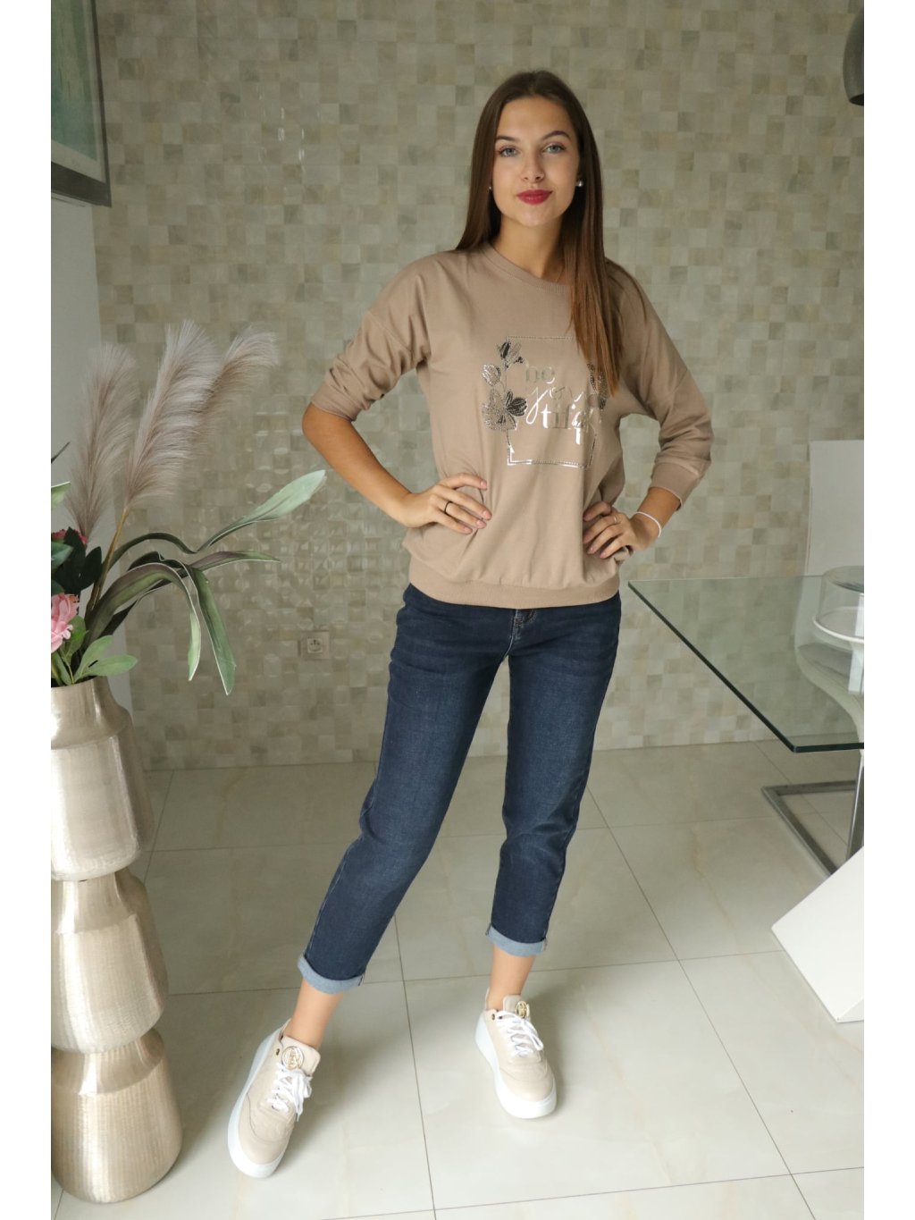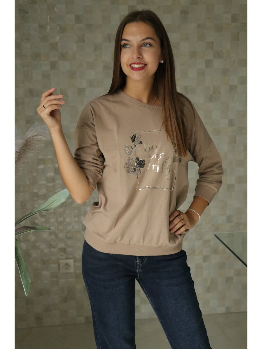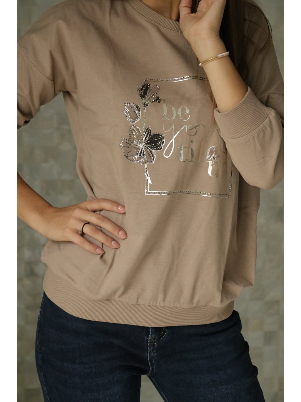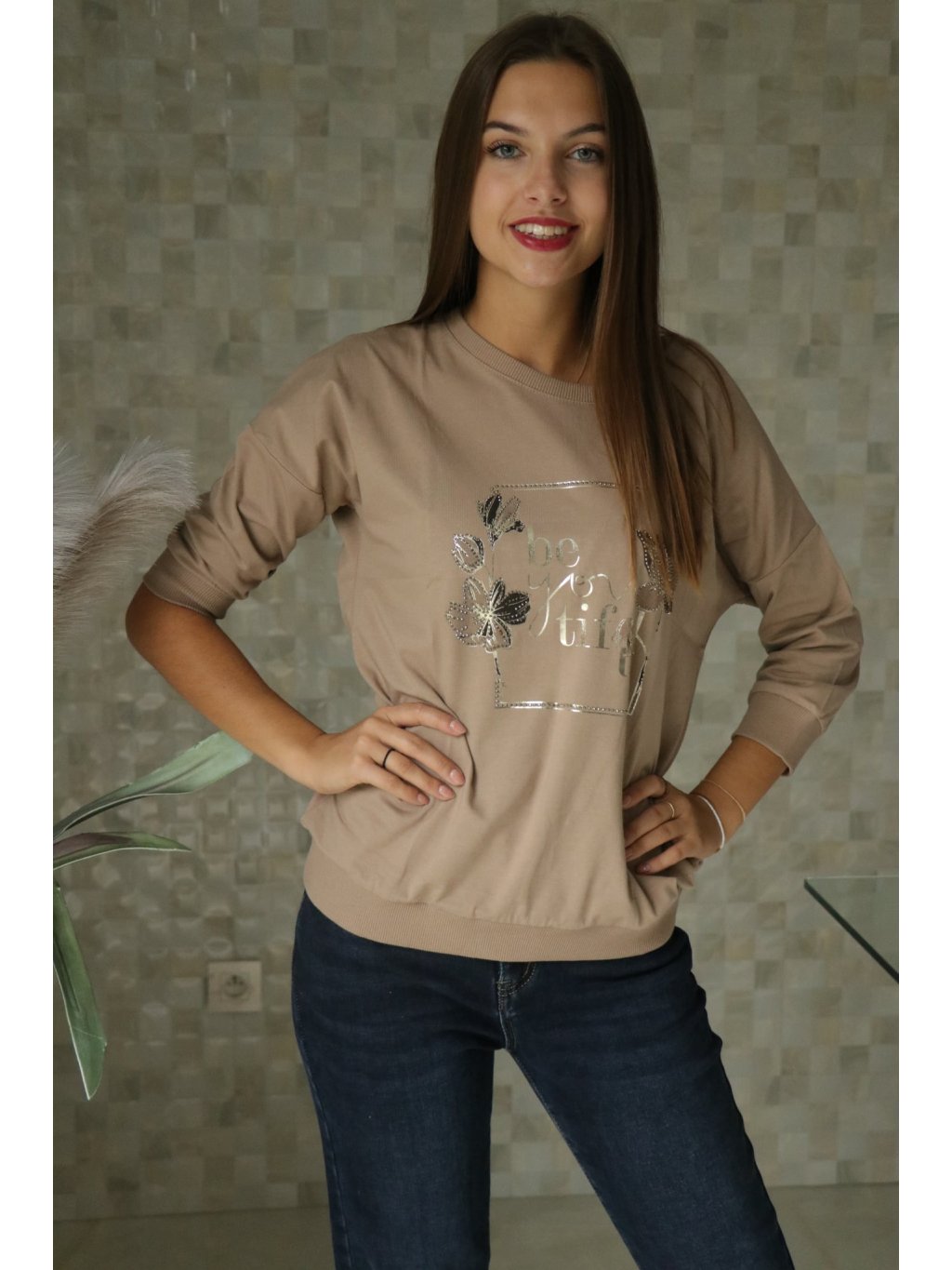 Jemná podzimní halenka s dekorativním nápisem, třpytivými kamínky a líbivým motivem listů