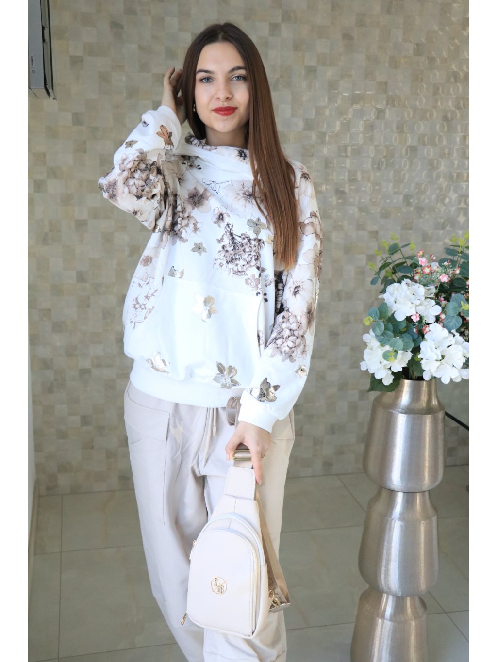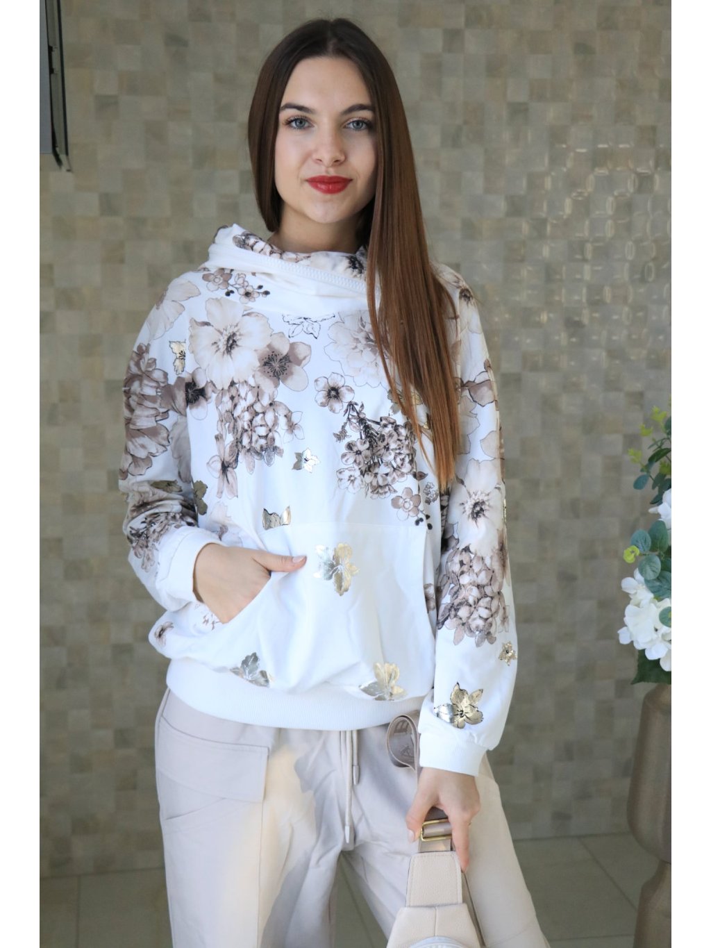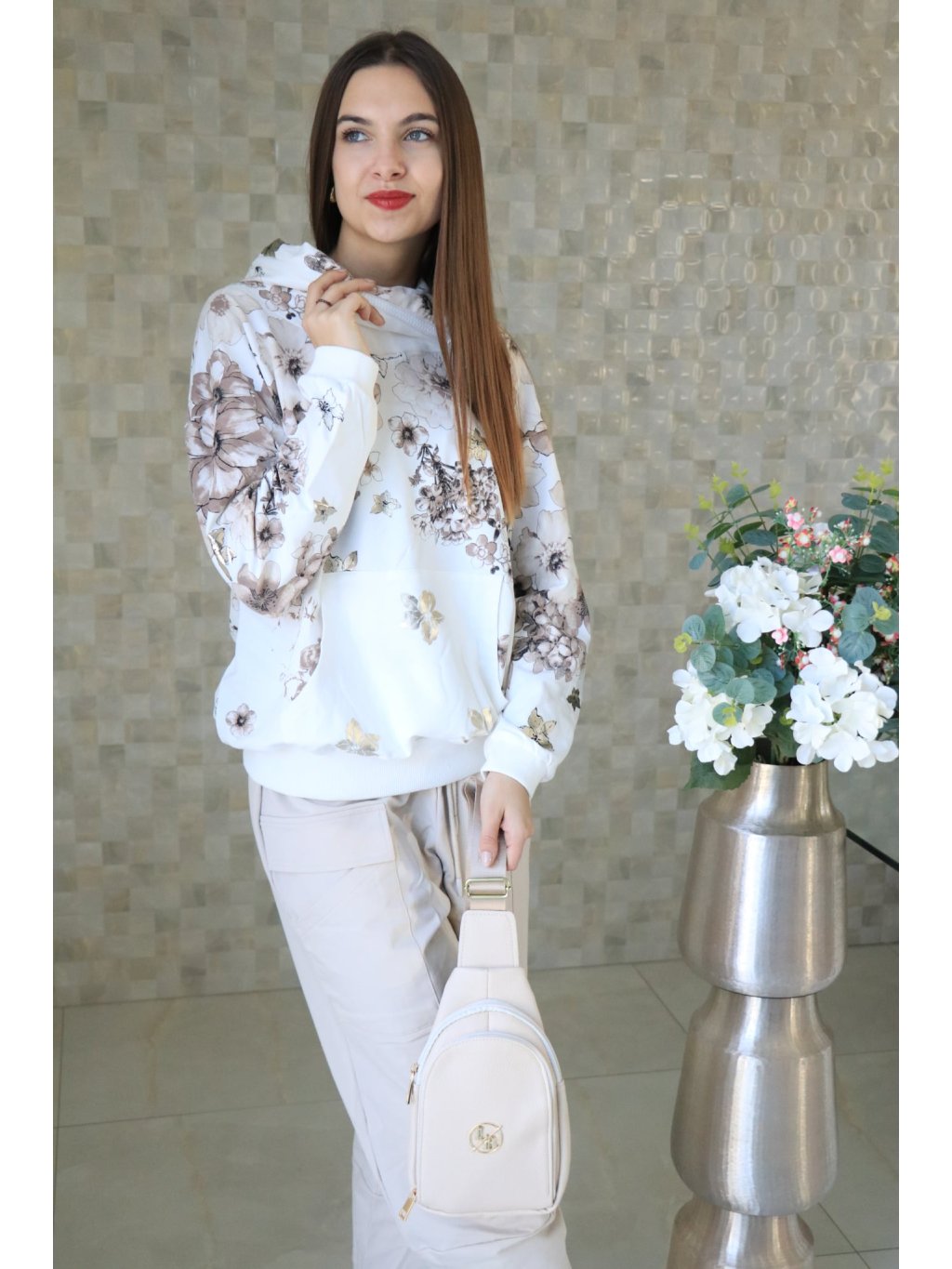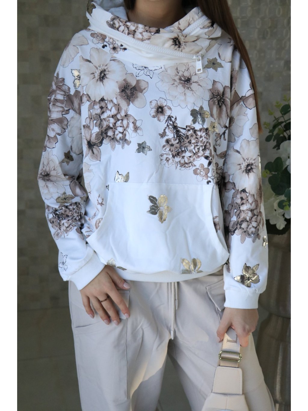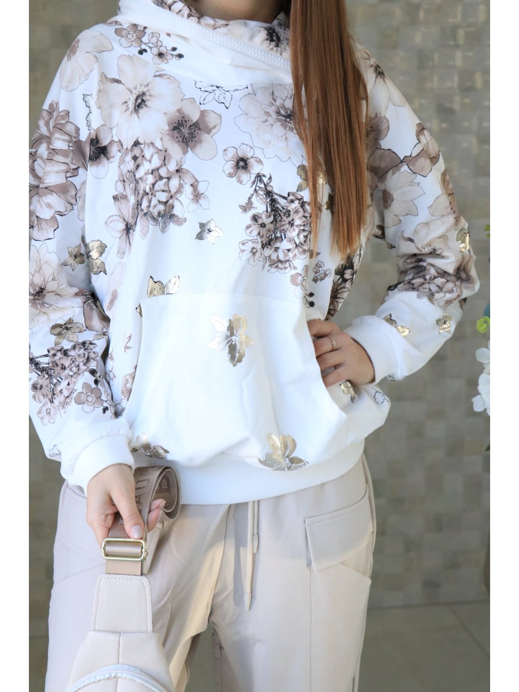 Béžová mikina s kapucí a květy vel. S/M, L/XL