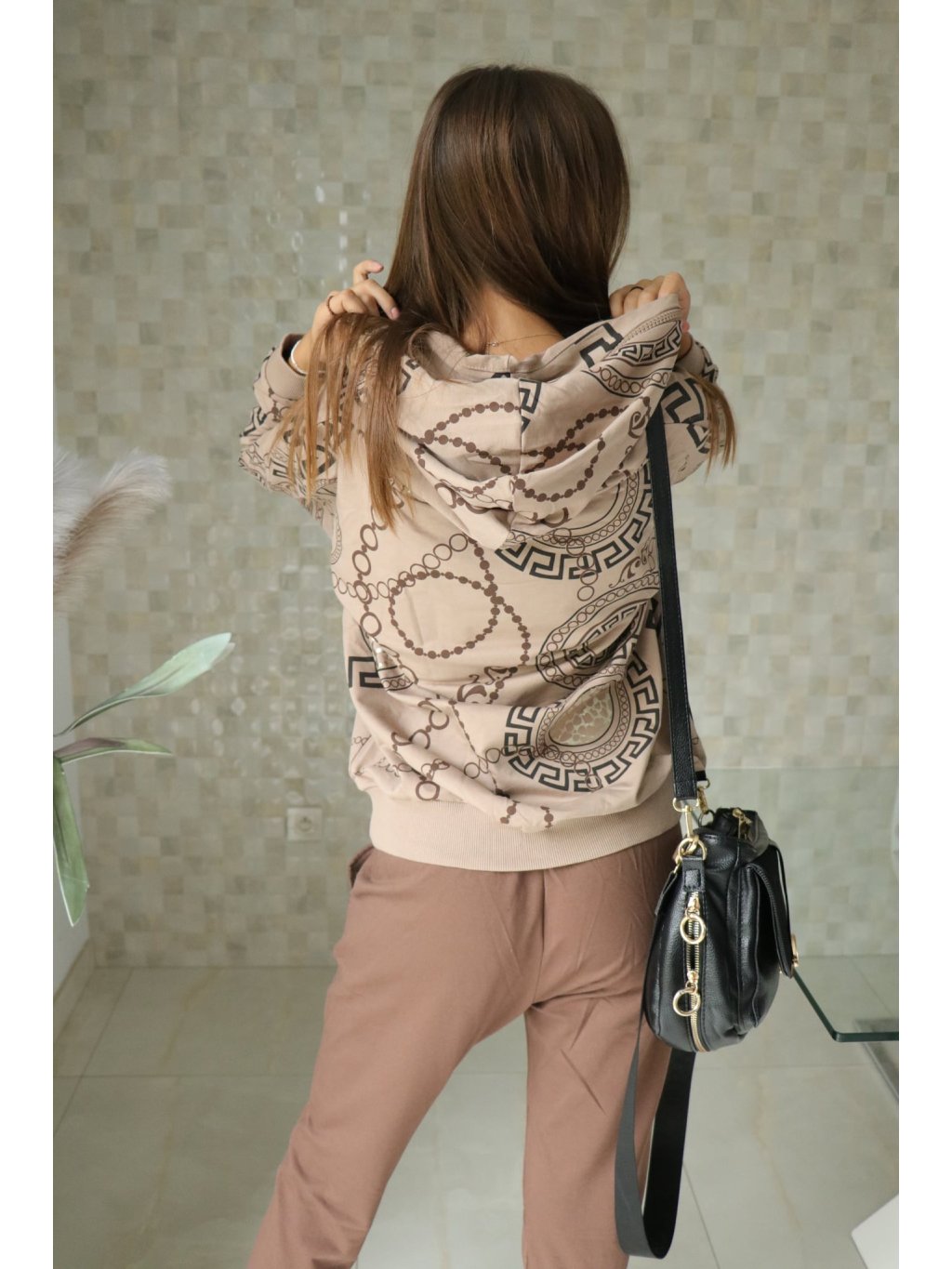 Béžová mikina s kapucí a zipem zdobená ornamenty vel. S/M, L/XL