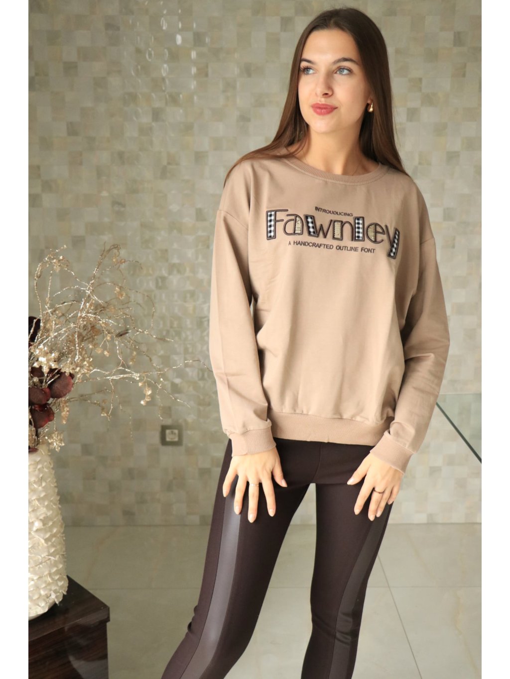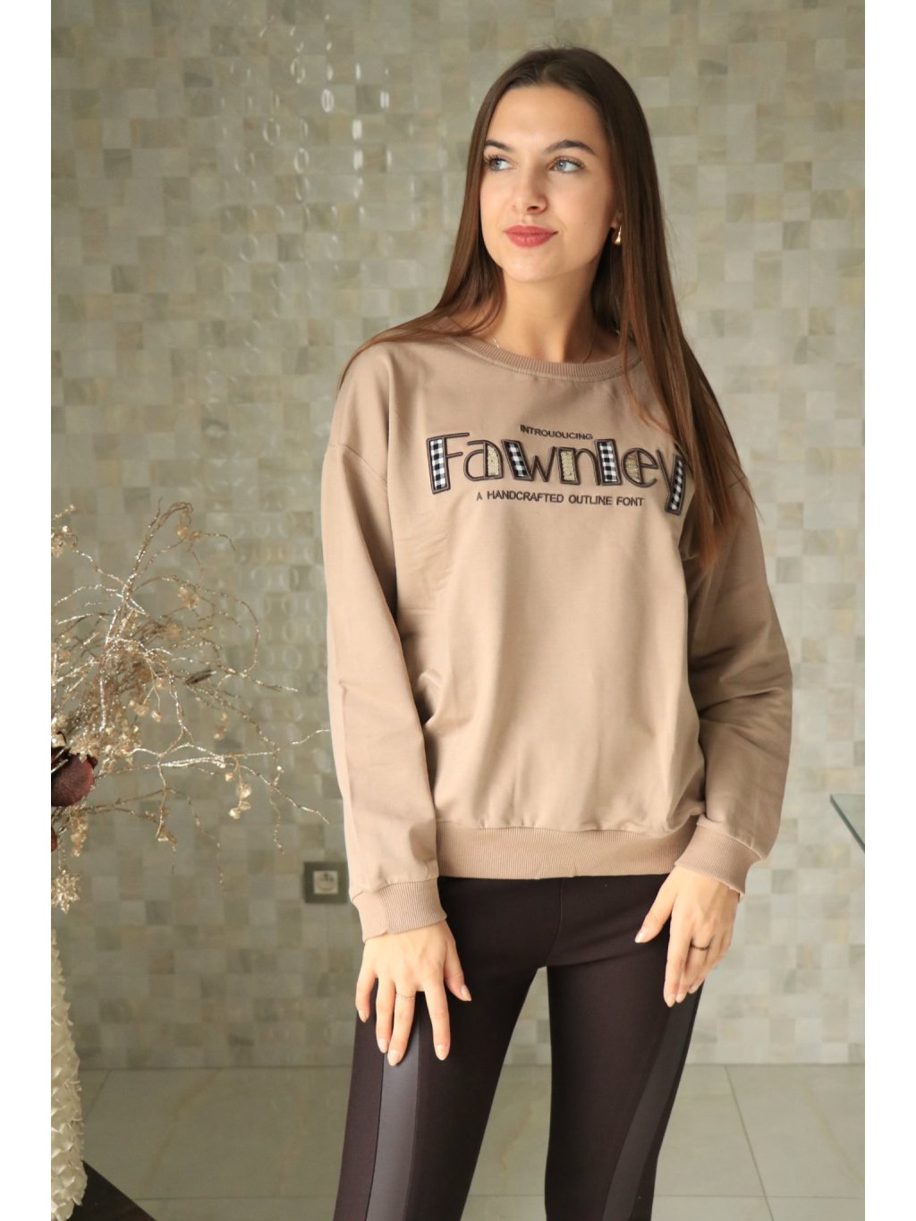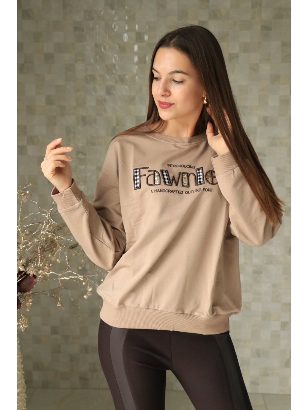 # Béžová mikina s nápisem a flitry