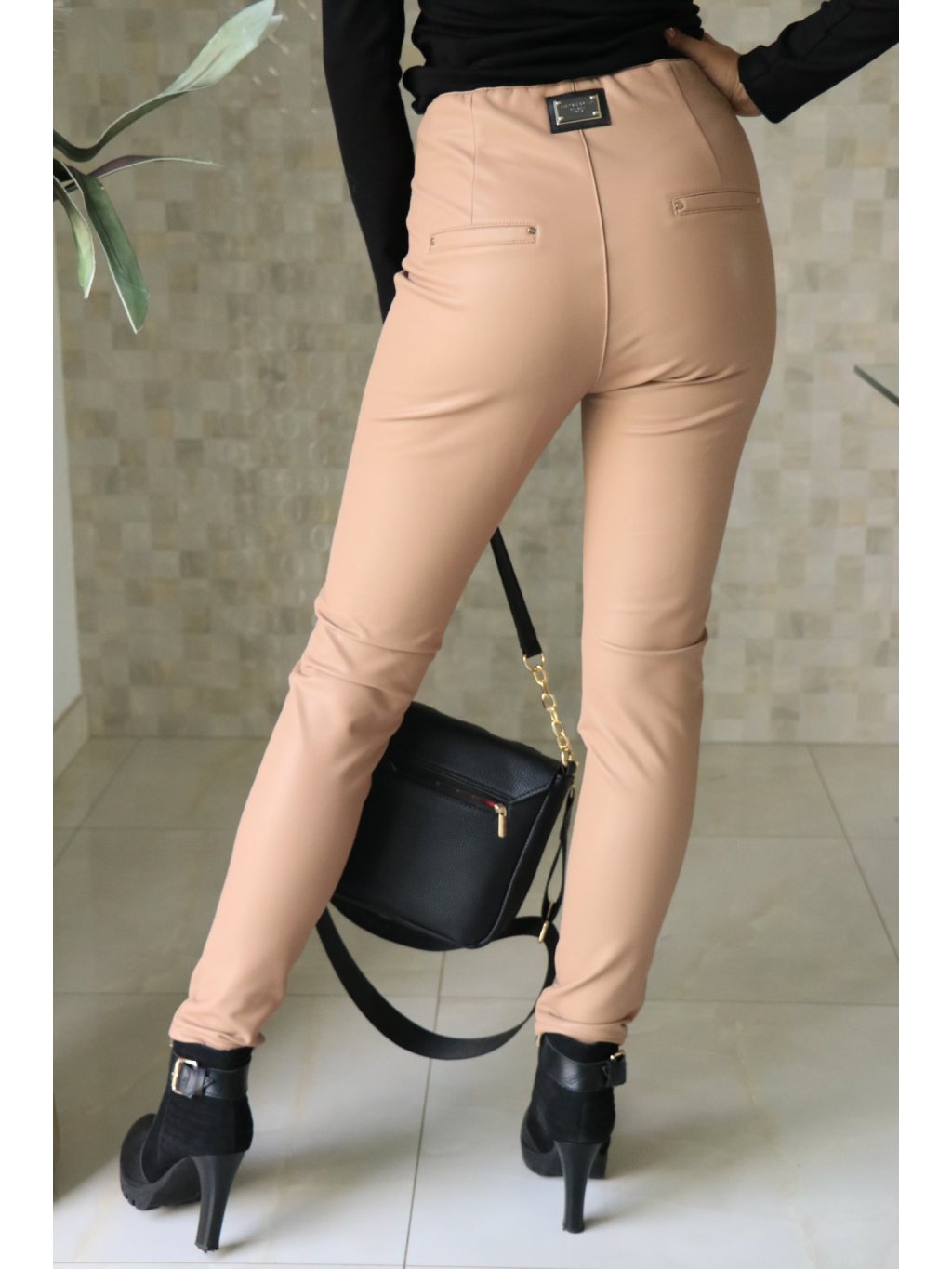 Stylové béžové kalhoty z koženky s dekorativním zlatým zipem — elegantní a výrazný kousek do městského i večerního outfitu.