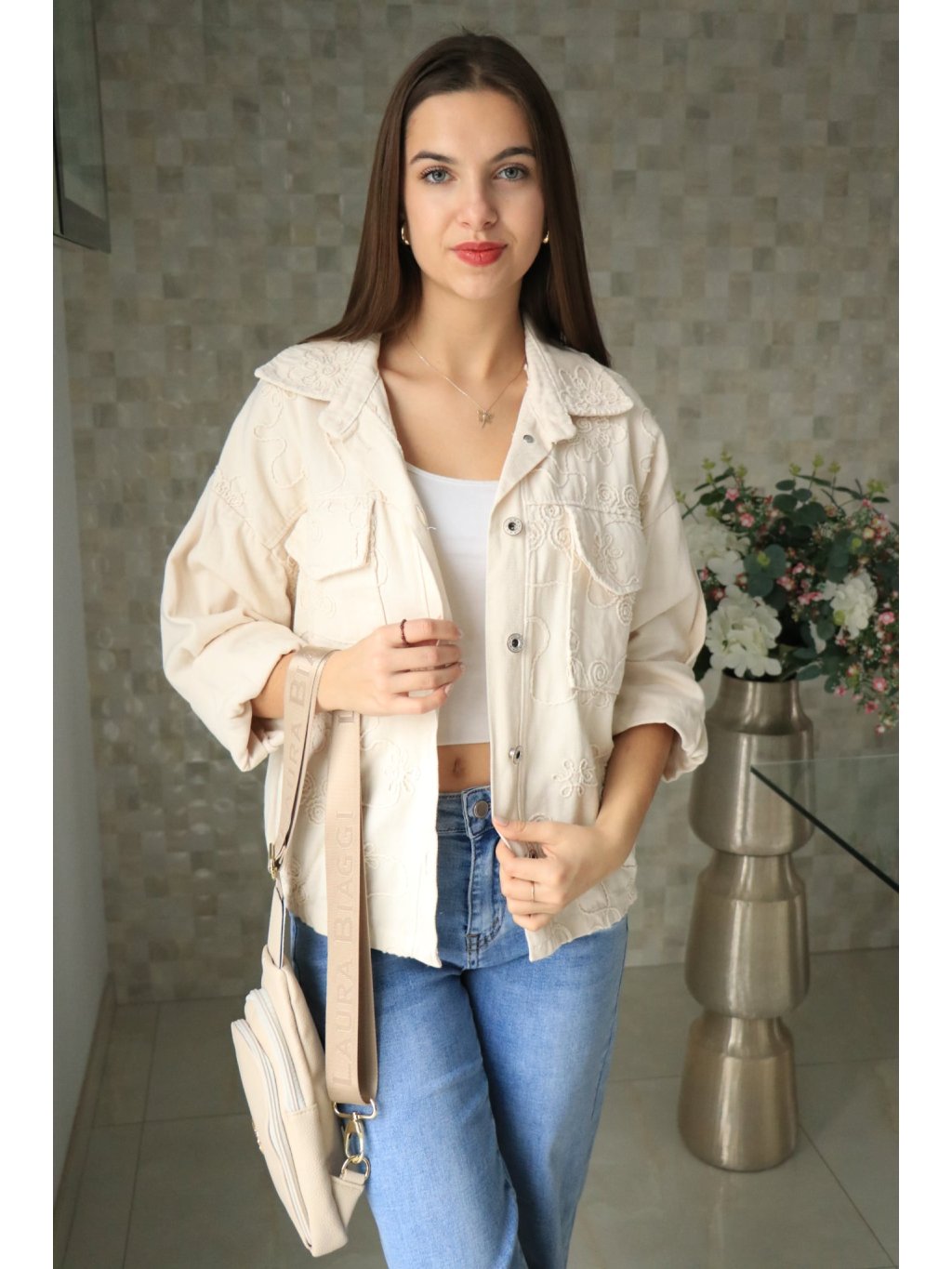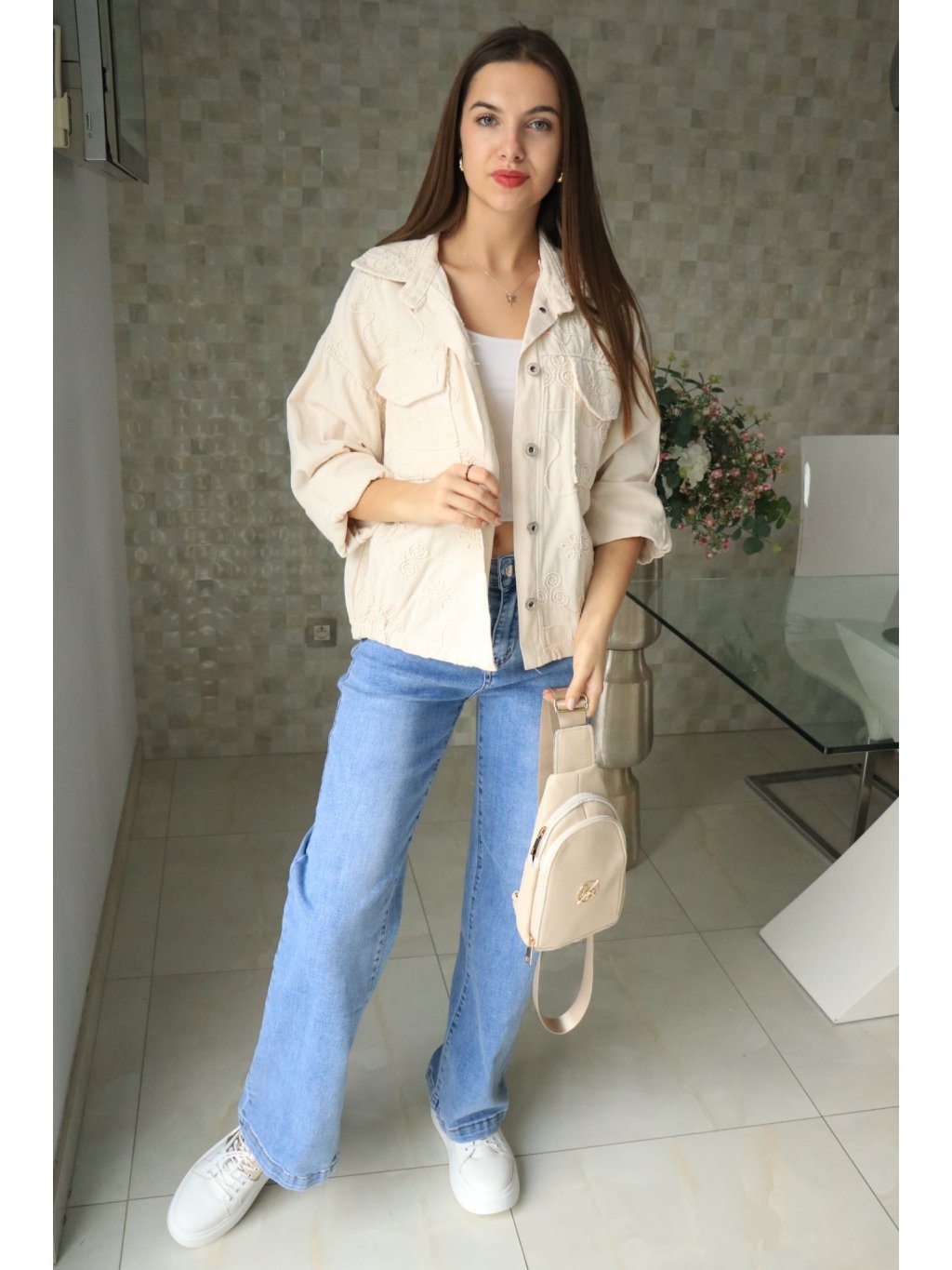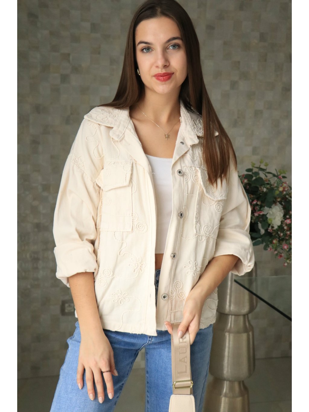 🤍🌼 Béžové riflové sako s vyšitými květy – jarní kolekce 🌼🤍