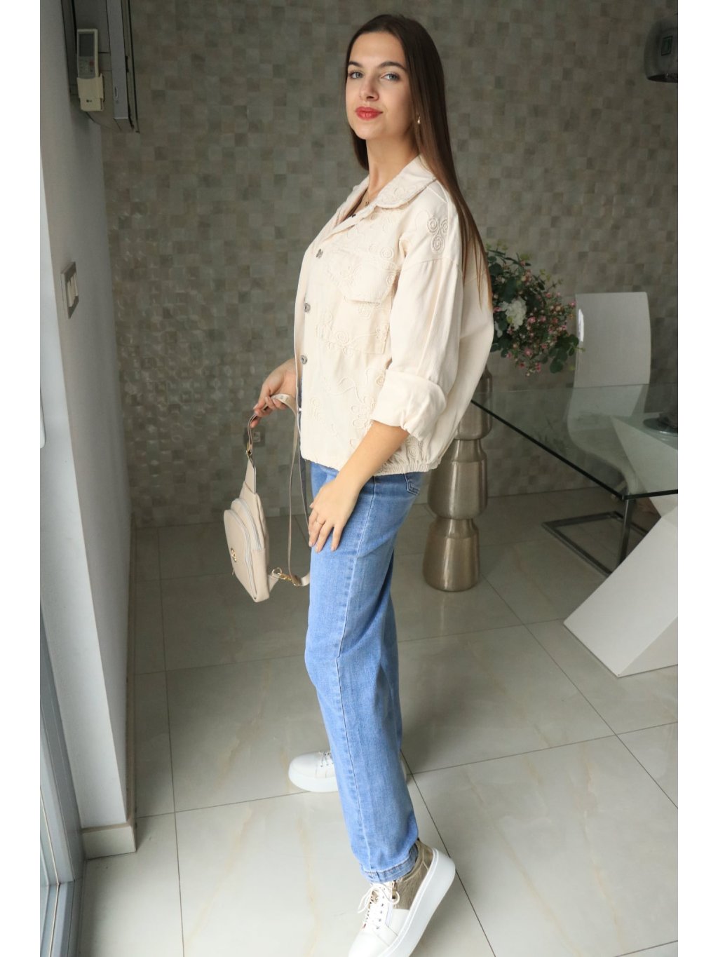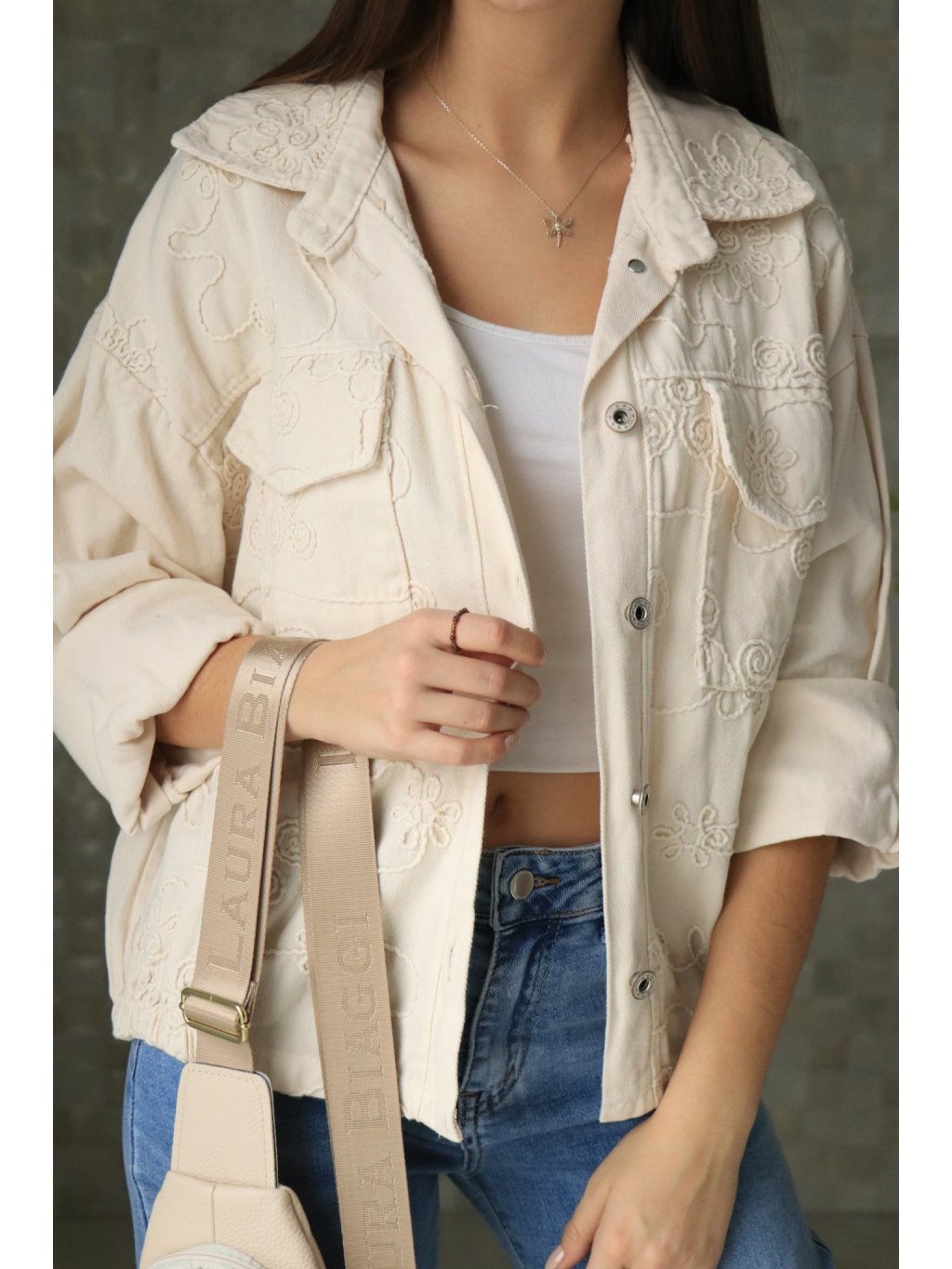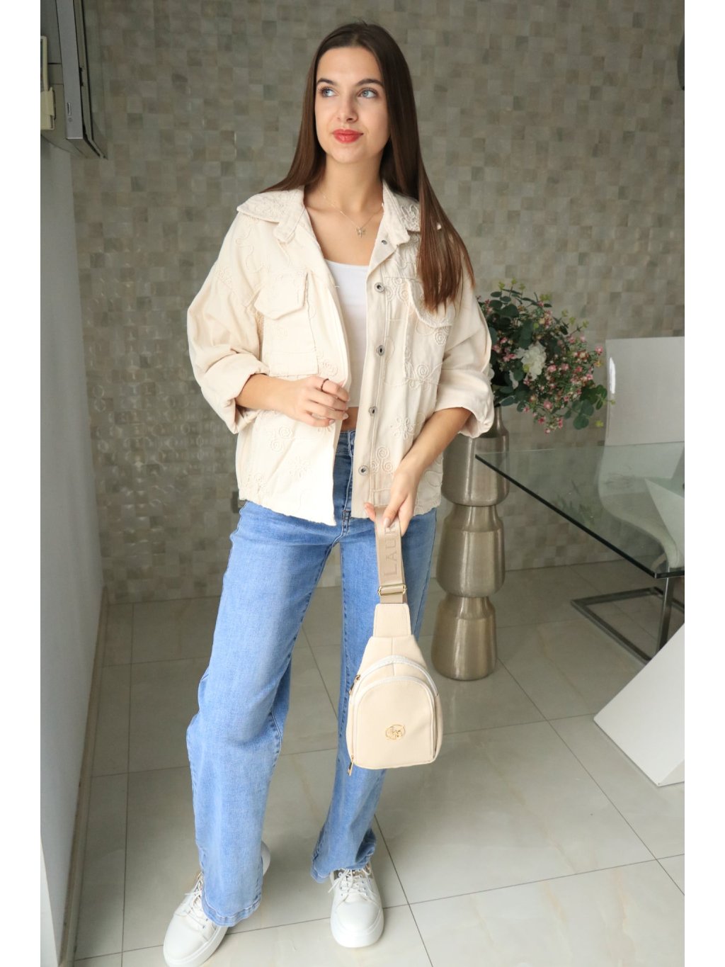 🤍🌼 Béžové riflové sako s vyšitými květy – jarní kolekce 🌼🤍