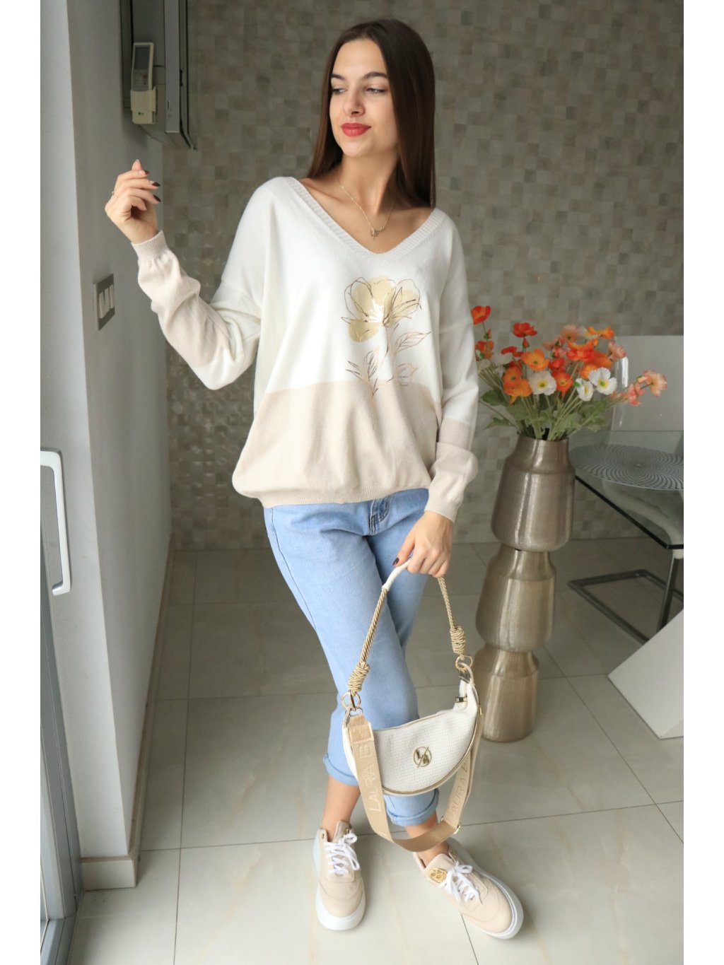 🤍🌸 Béžový svetřík s pruhy a květy – jarní kolekce 🌸🤍