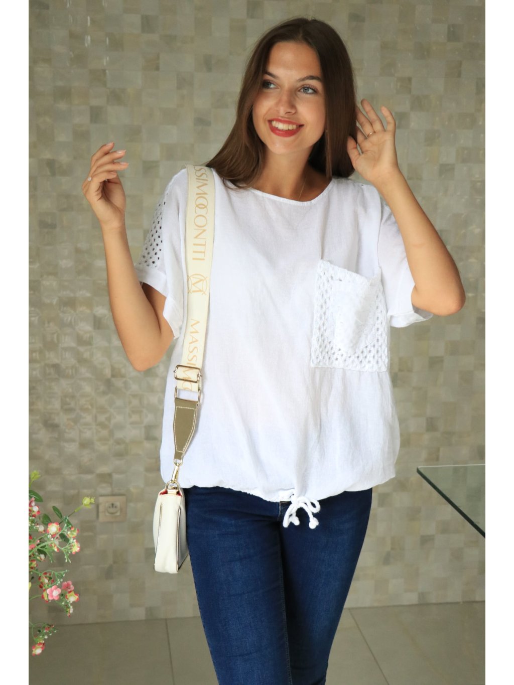 💃 Elegantní dámská halenka vyrobená z kvalitního materiálu (95% bavlna, 5% elastan) v přírodní barvě. Halenka má zajímavý design s dírovaným vzorem a kapsou ve přední části, který dodává nadčasový a ženský vzhled.