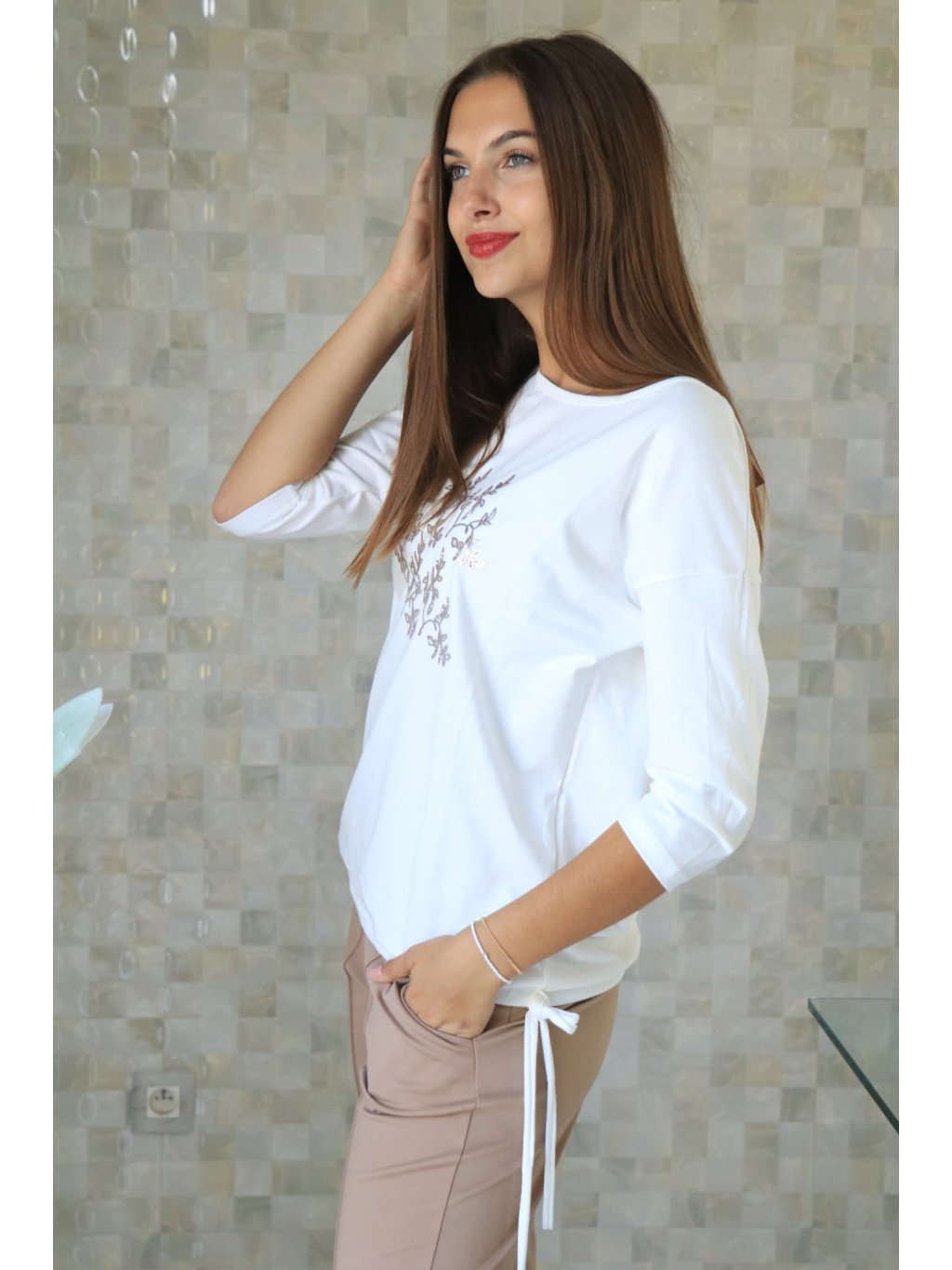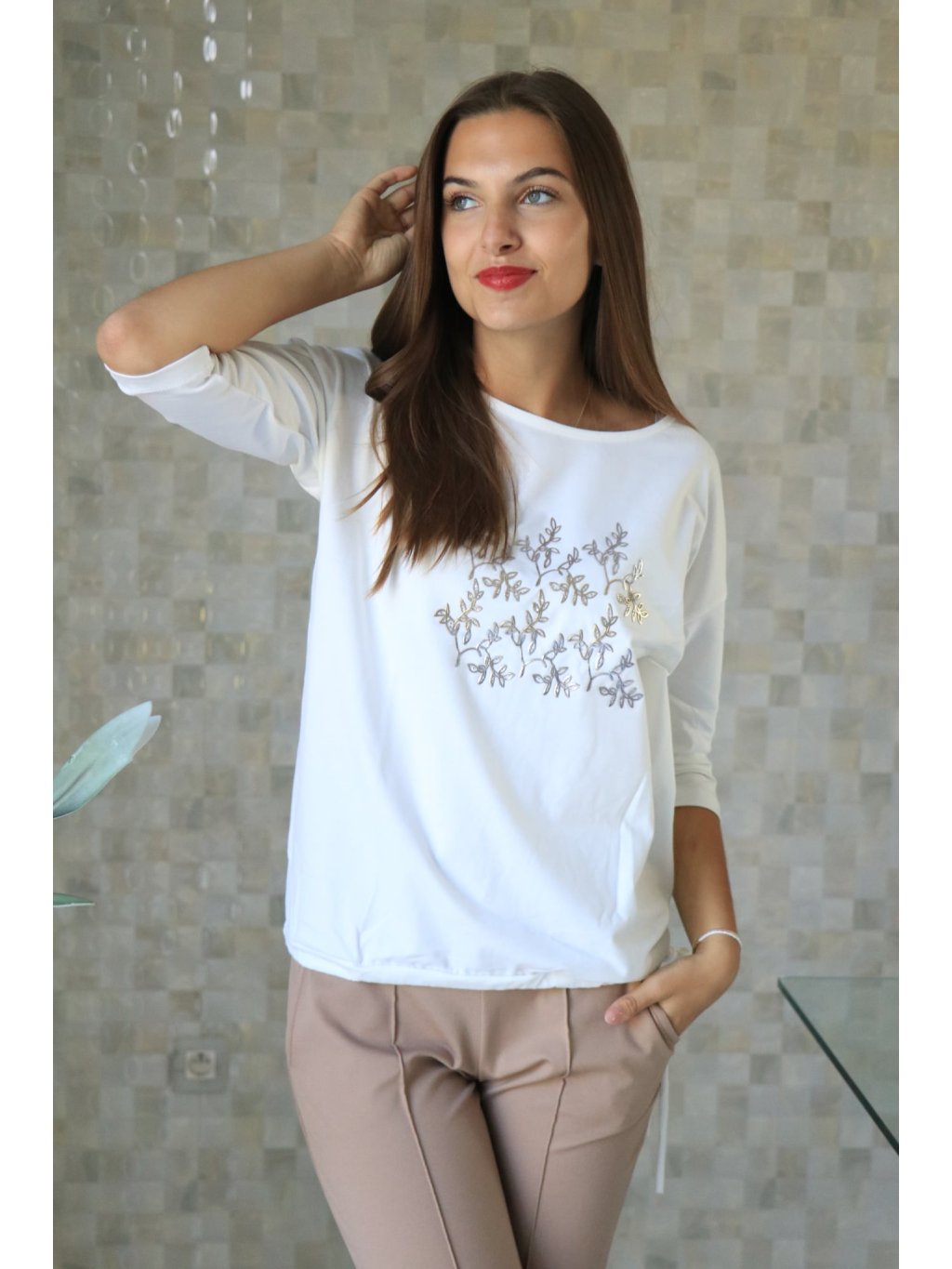 Lehká halenka s jemnou řetízkovou výšivkou květiny, 3/4 rukávem a stahováním ve spodní části — pohodlná a variabilní.