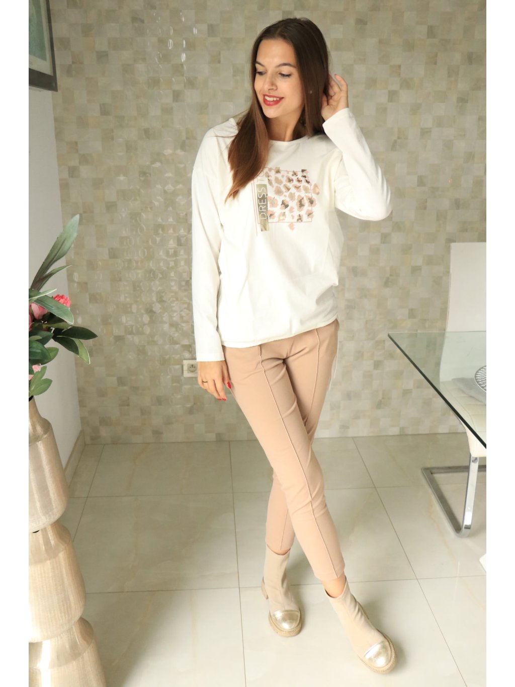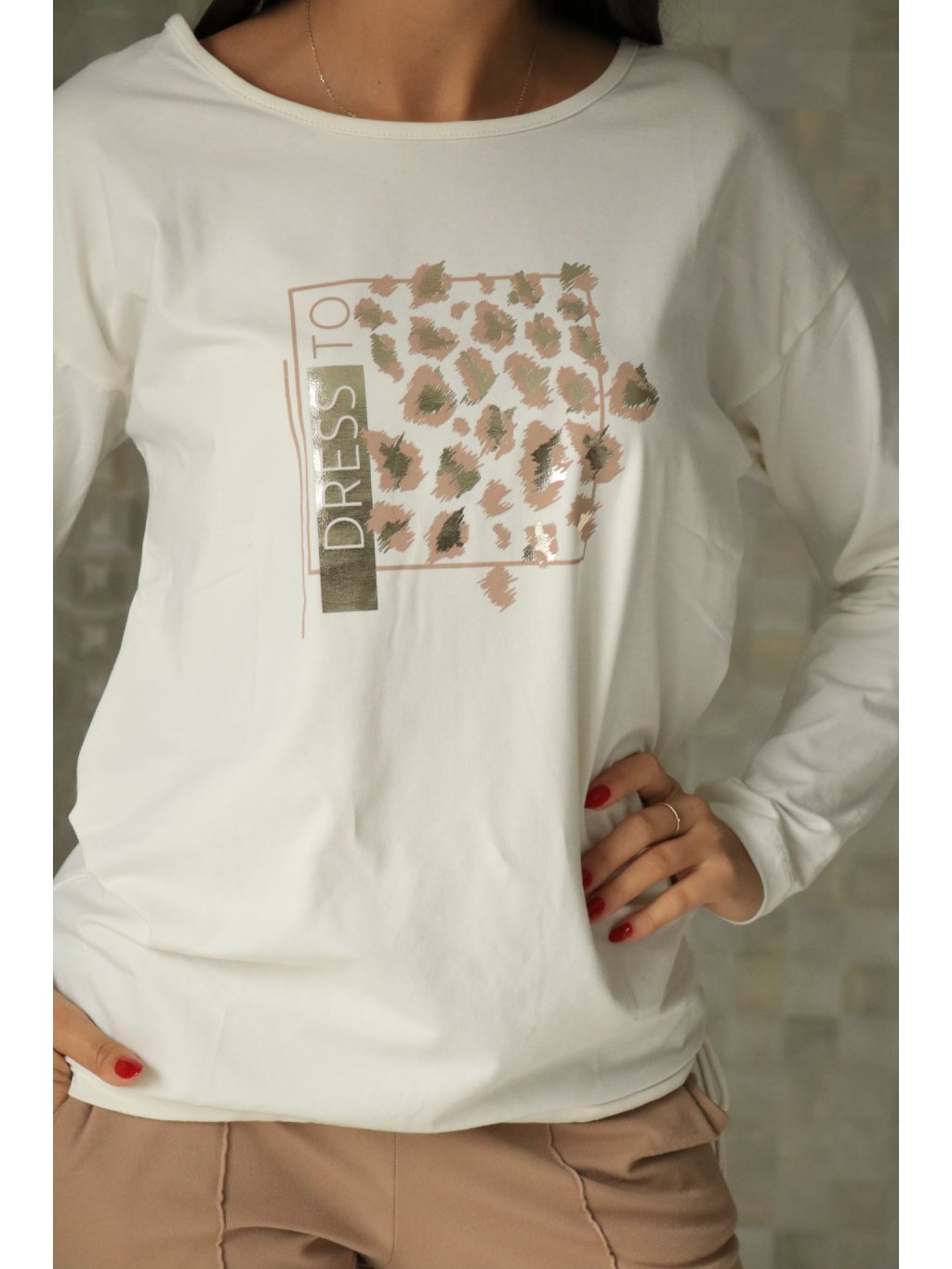 Halenka, která spojuje pohodlí s elegancí. Zlatavý potisk dodává outfitu luxusní nádech.
