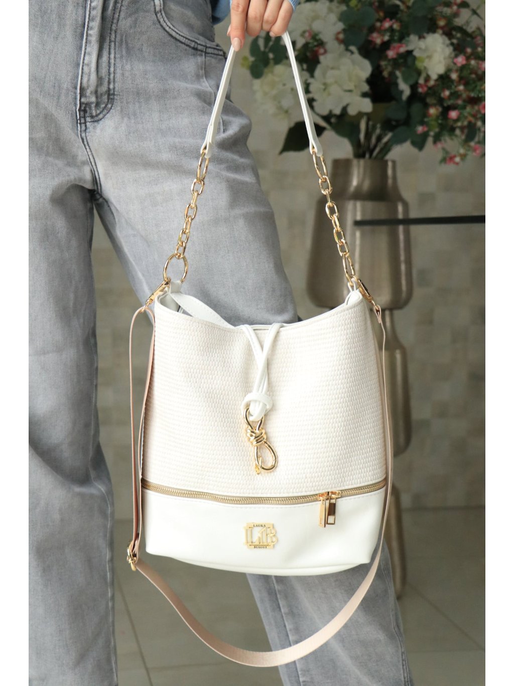 🤍✨ Bílá kabelka se zlatým uzlíkem a zlatým kováním – jarní kolekce ✨🤍