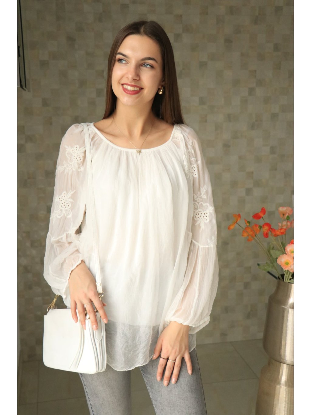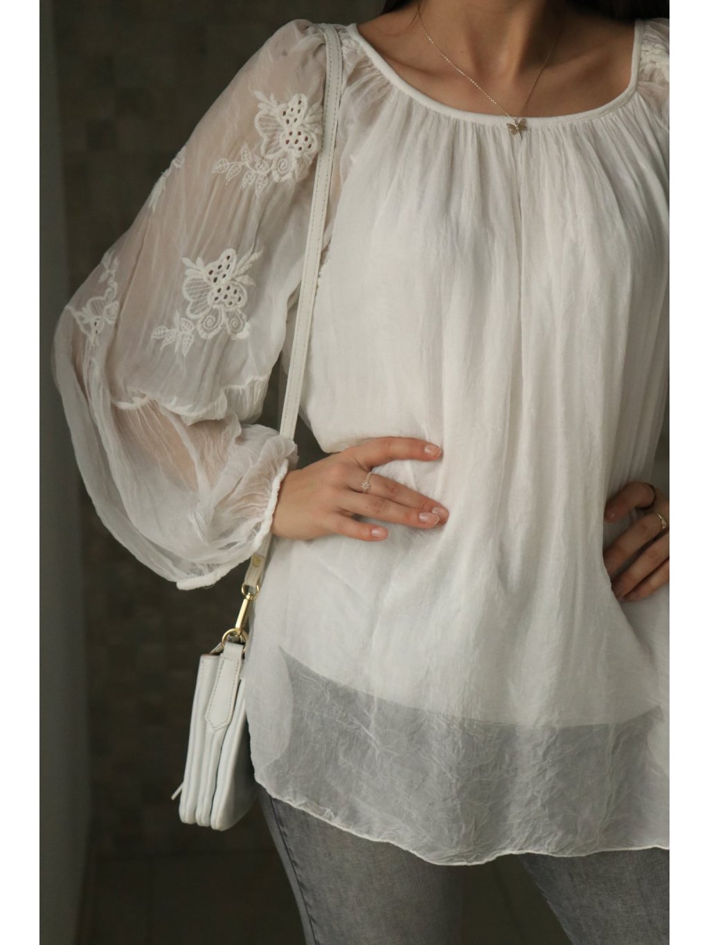 🤍✨ Bílá mušelínová halenka s krajkovanými rukávy – něžná a vzdušná elegance ✨🤍