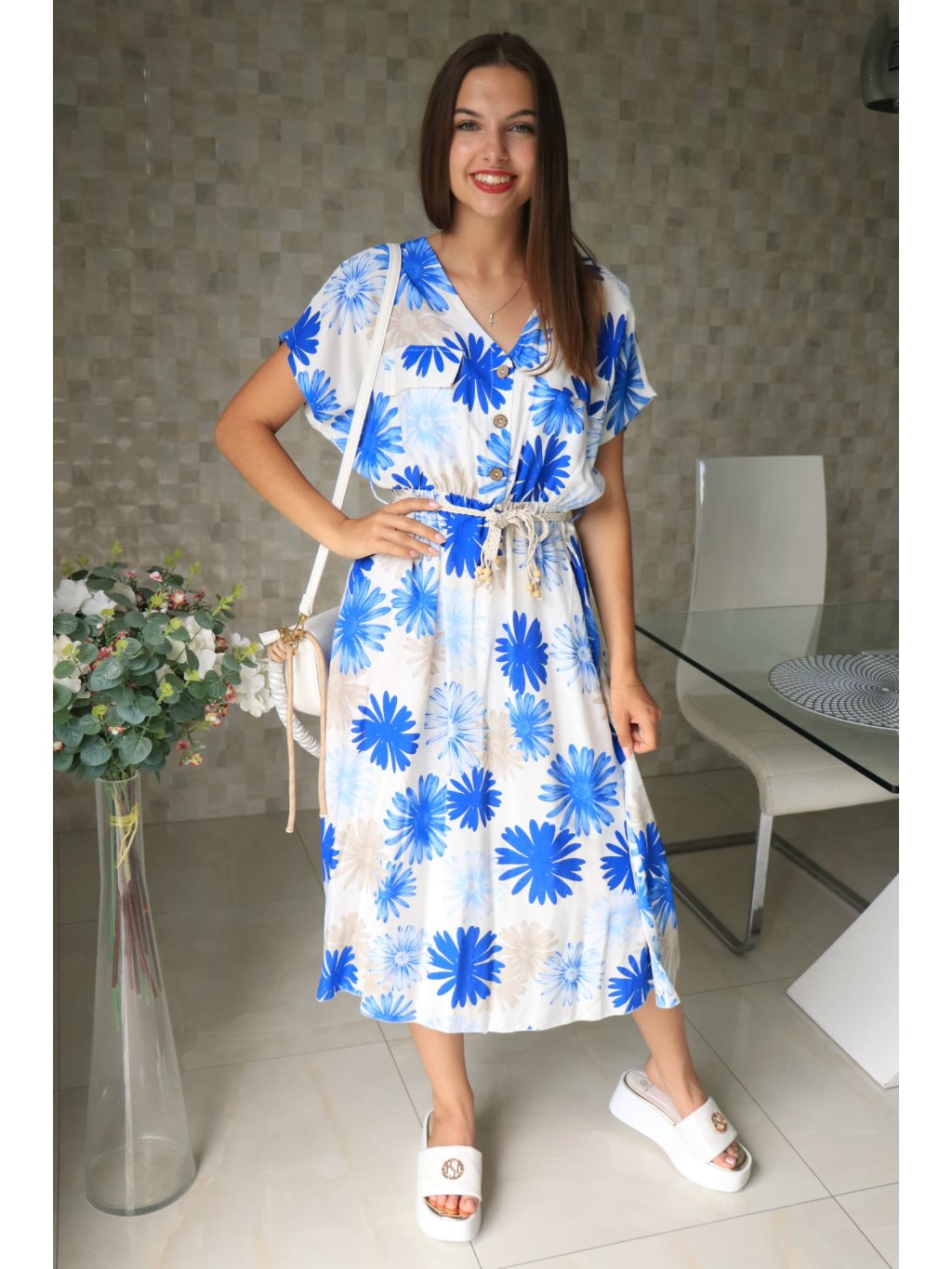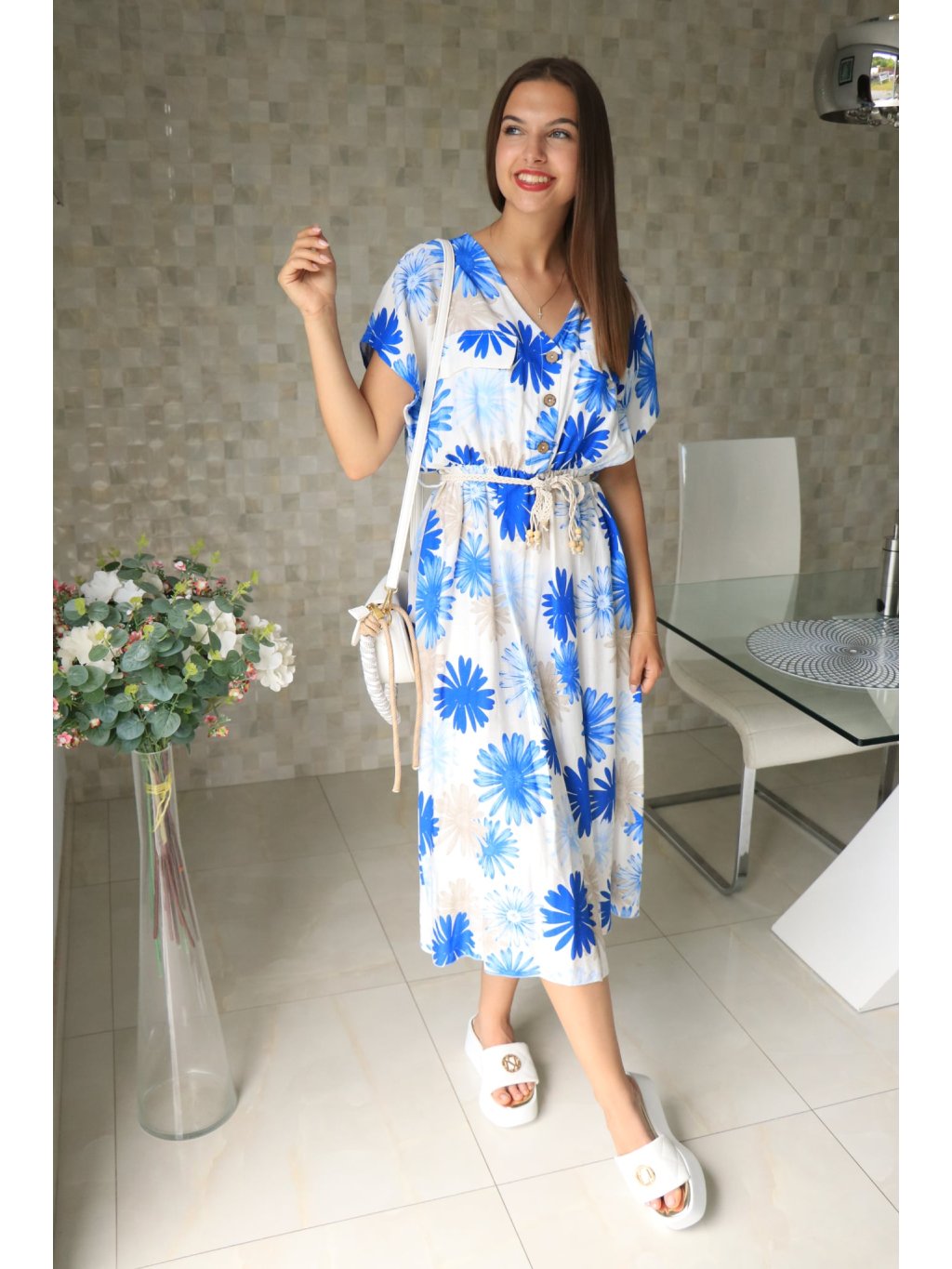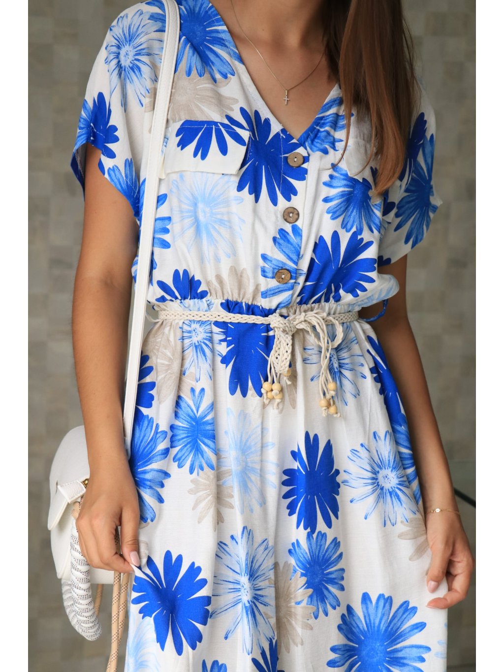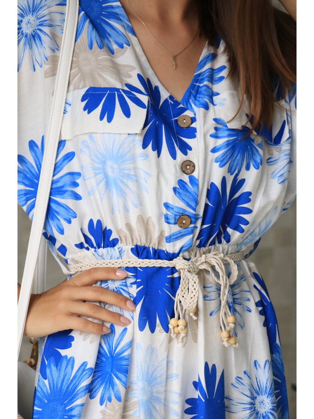 🎨 Barva: Bílá s jemným vzorem modrých květů – kombinace, která evokuje letní radost, svěžest a něžnost. Modré květy dodávají šatům veselý a slunečný nádech, ideální na teplejší dny.