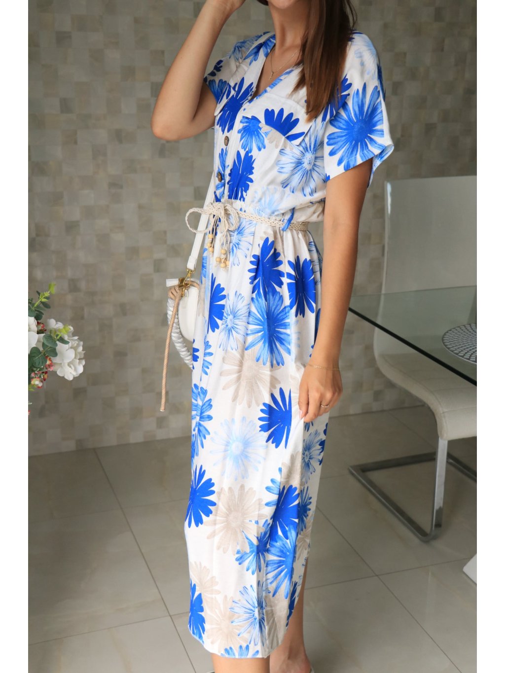 👗 Bílé dlouhé šaty s páskem a modrými květy – svěží, ženské a romantické