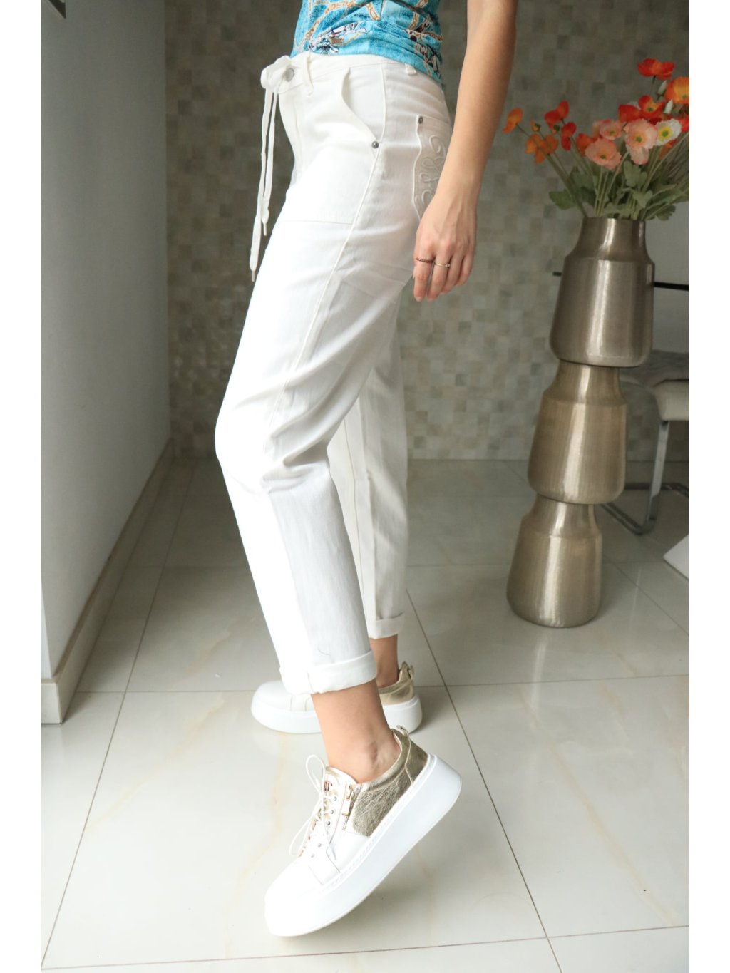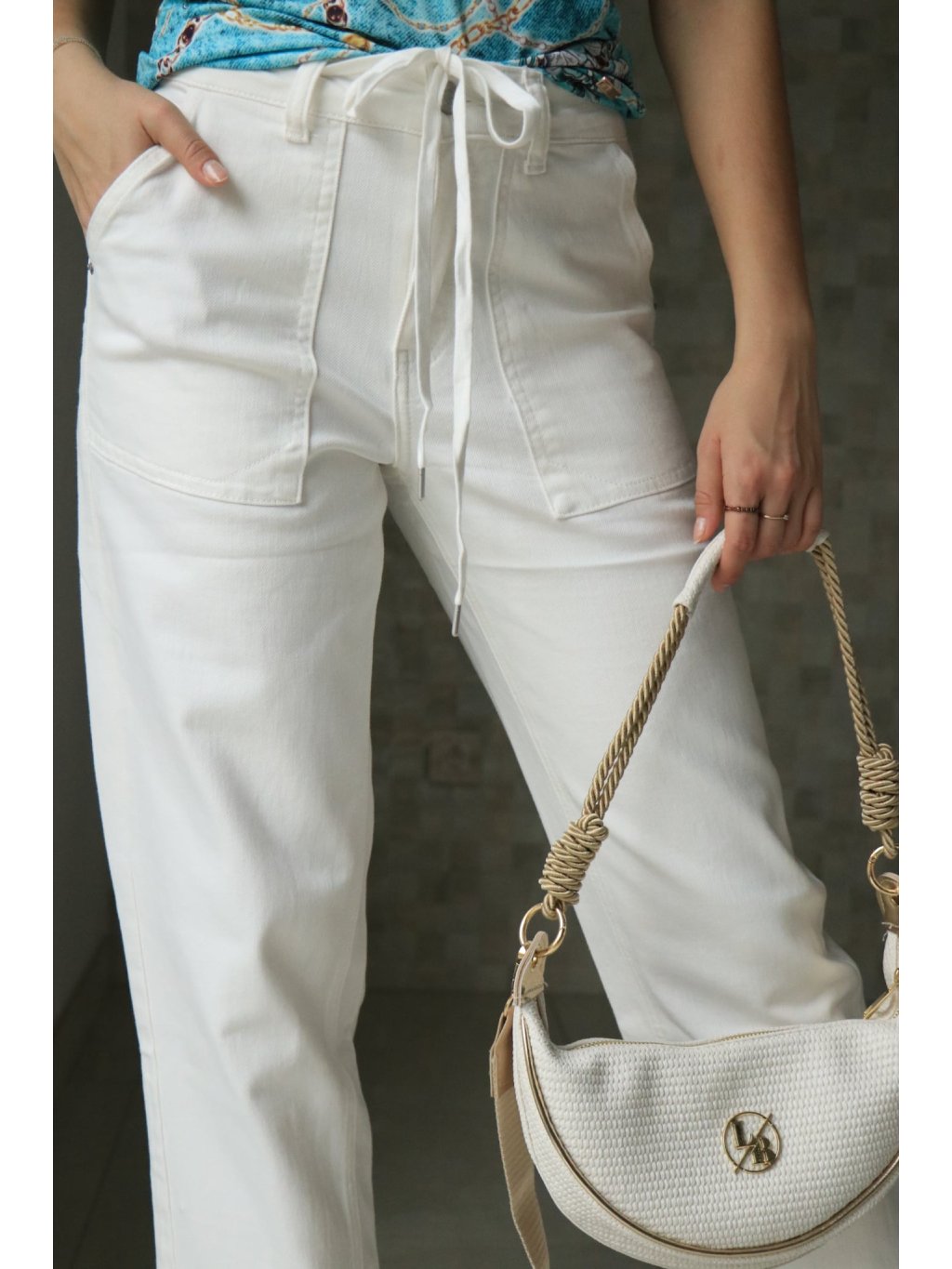 🤍✨ Bílé rifle se šňůrkami v pase – moderní pohodlí s praktickými detaily ✨🤍