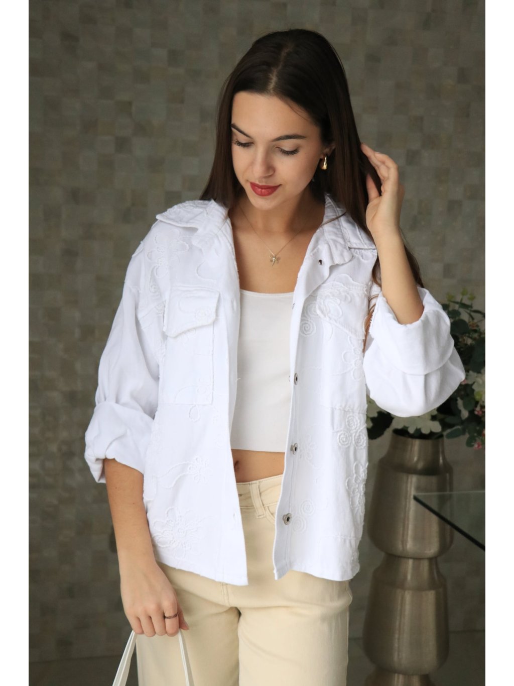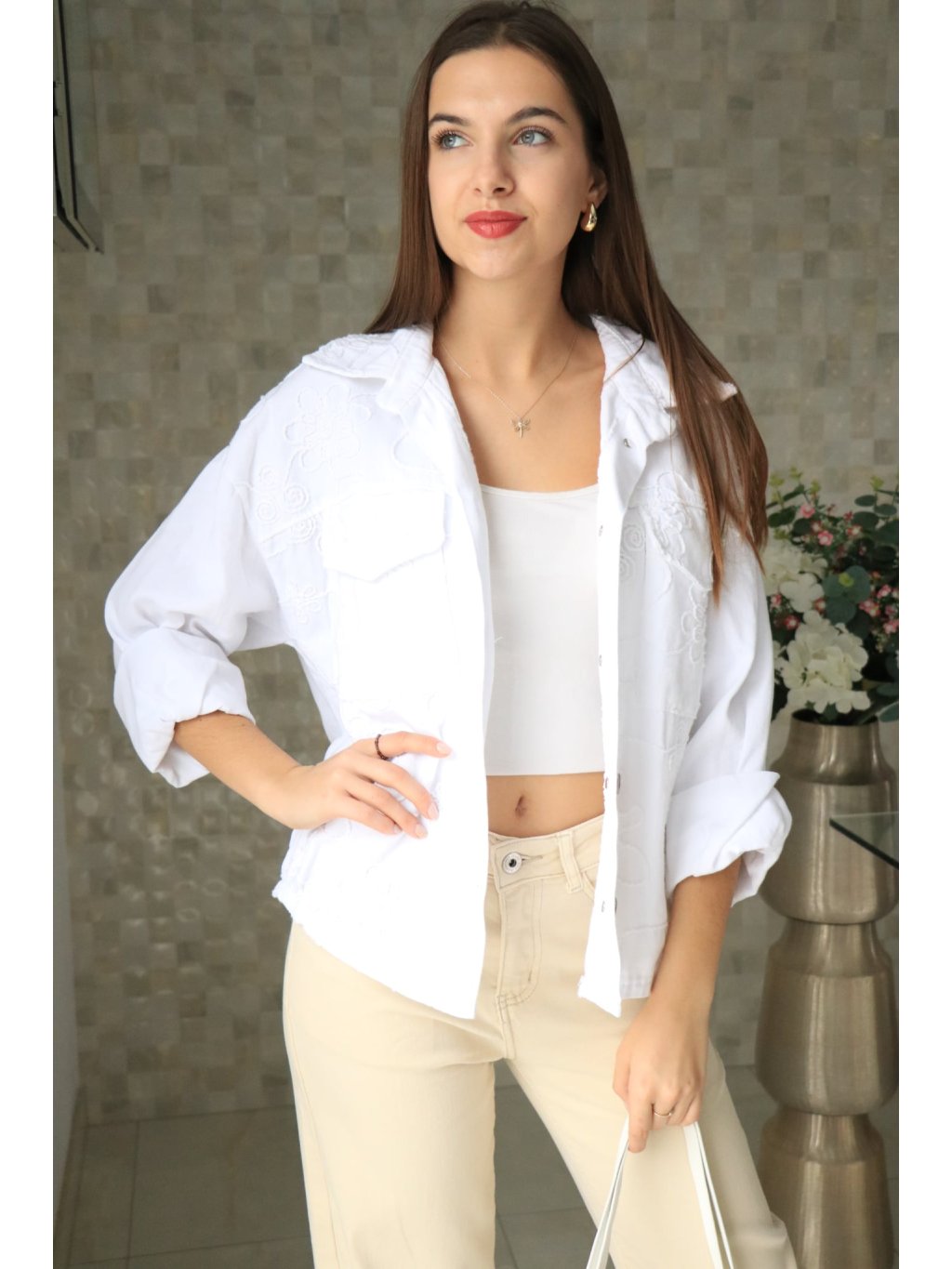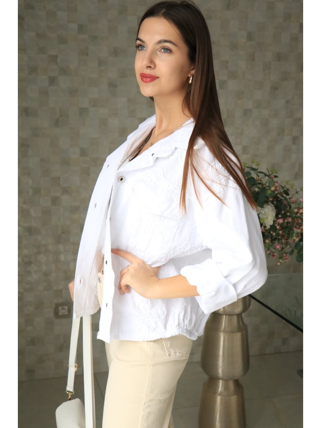 🤍🌼 Bílé riflové sako s vyšitými květy – jarní kolekce 🌼🤍
