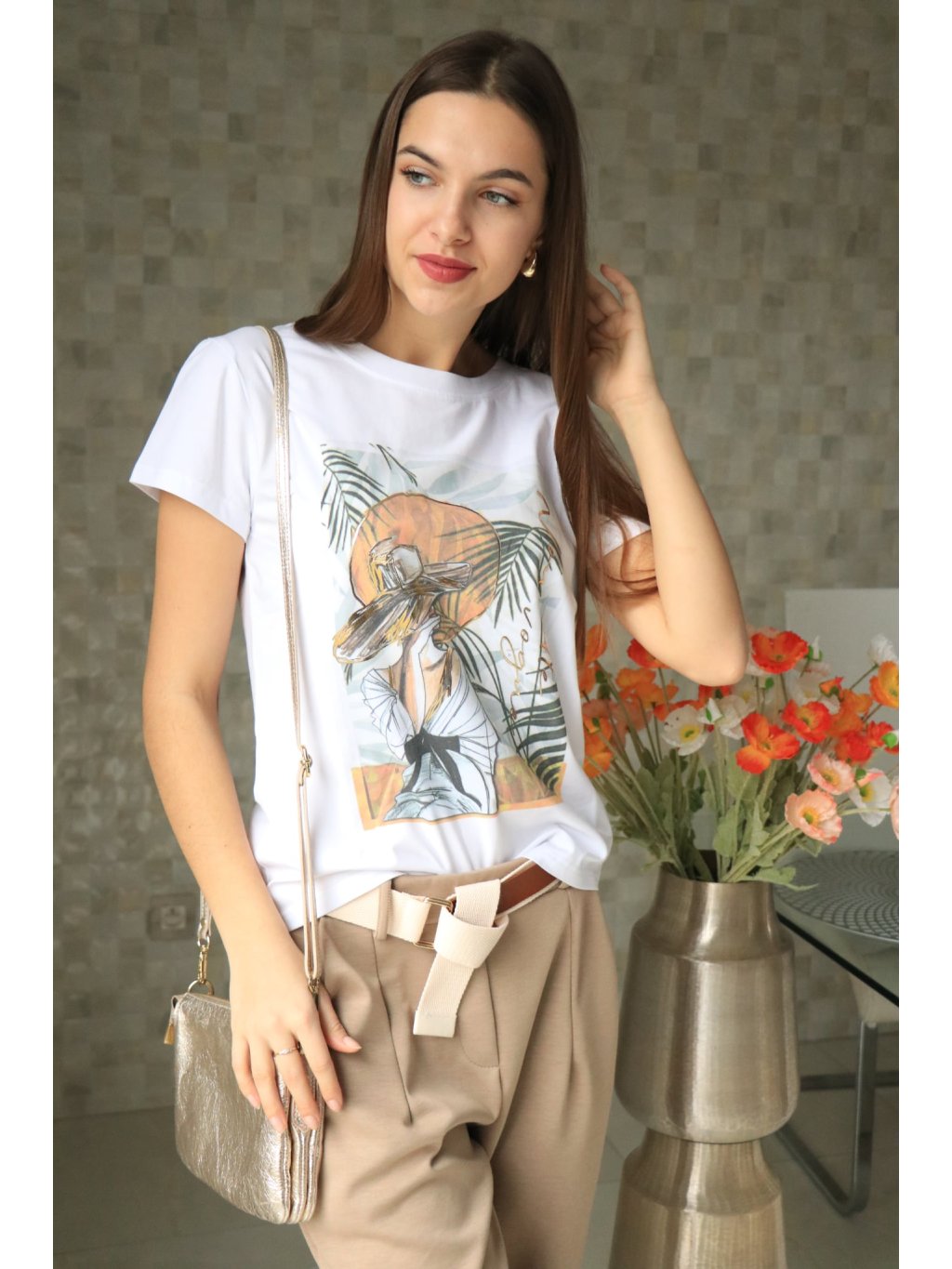 🤍🌴 Bílé tričko s potiskem ženy a palmy – stylový kousek z nové jarní kolekce 🌴🤍