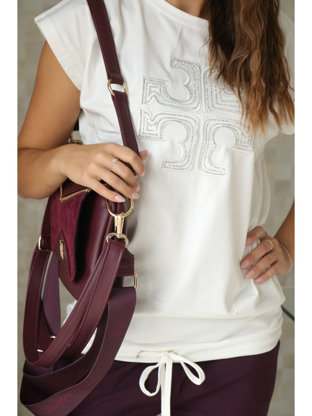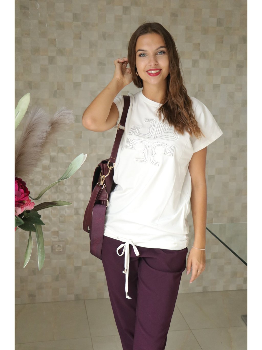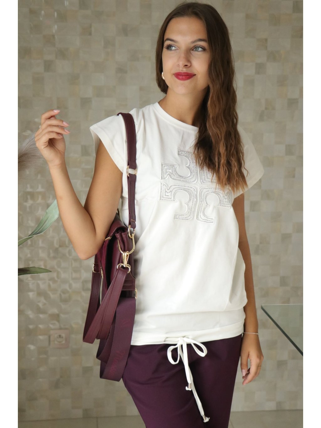 Ležérní dámské triko vyrobené ze 100% bavlny v nadčasovém provedení. Hlavním designovým prvkem jsou střední kamínky v dolní části a možnost stažení lemů, která dodává moderní a variabilní vzhled.