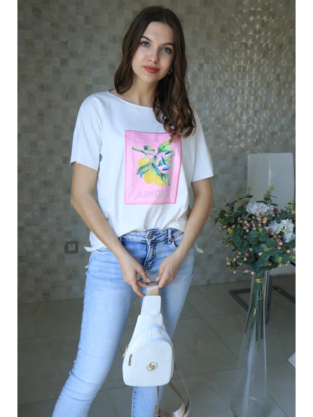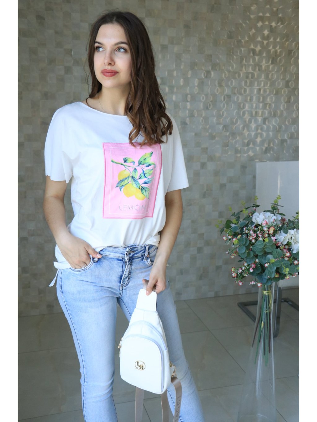 Bílé triko s potiskem citrónů do růžova