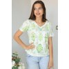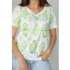 Bílý základ halenky s jemnými zelenými vzory vytváří osvěžující a romantický vzhled.