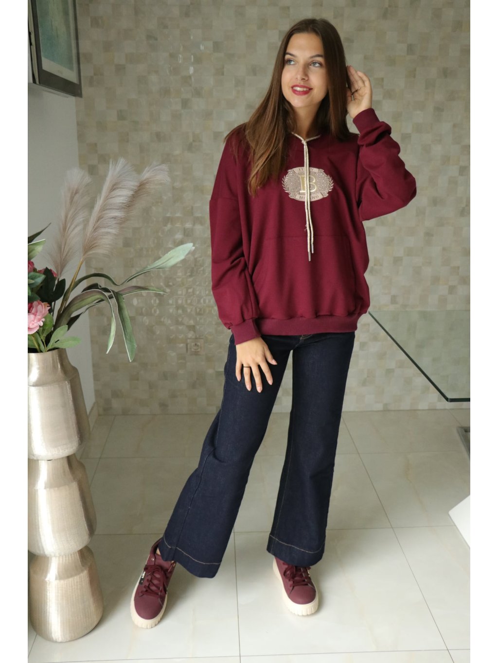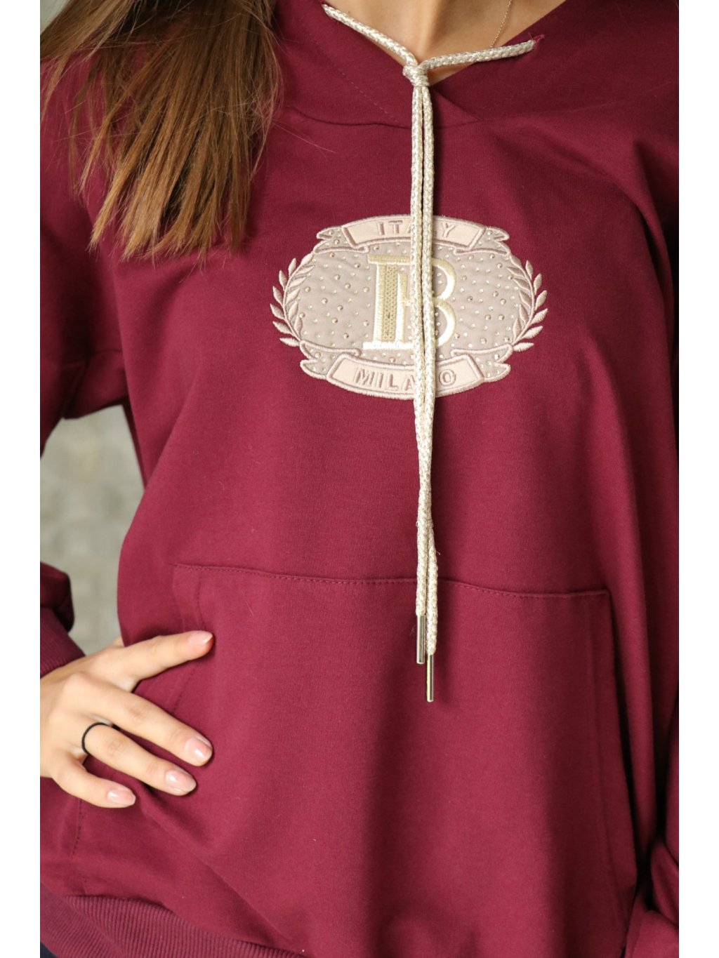 - 🧥 Detail: bordó mikina s kapucí, ozdobný znak „B“ zdobený kamínky