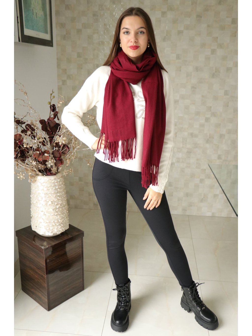 Vneste do svého šatníku nádech luxusu a vášně s naším okouzlujícím bordó šátkem zdobeným elegantními třásněmi. Tento výrazný módní doplněk v bohaté vínové barvě dodá vašemu outfitu sofistikovanost a sebevědomý styl.