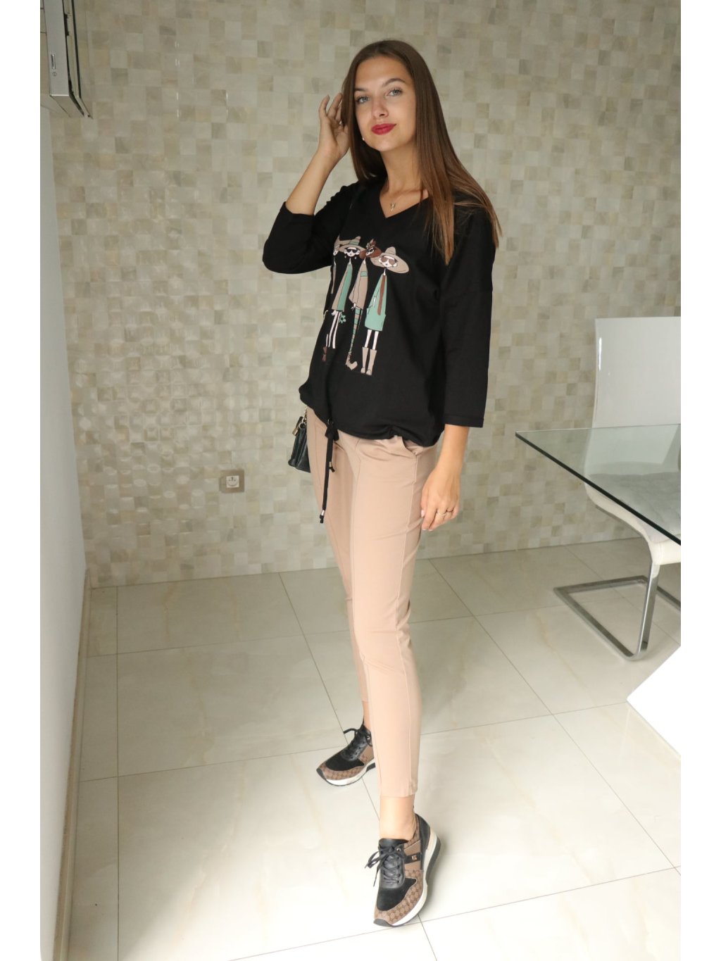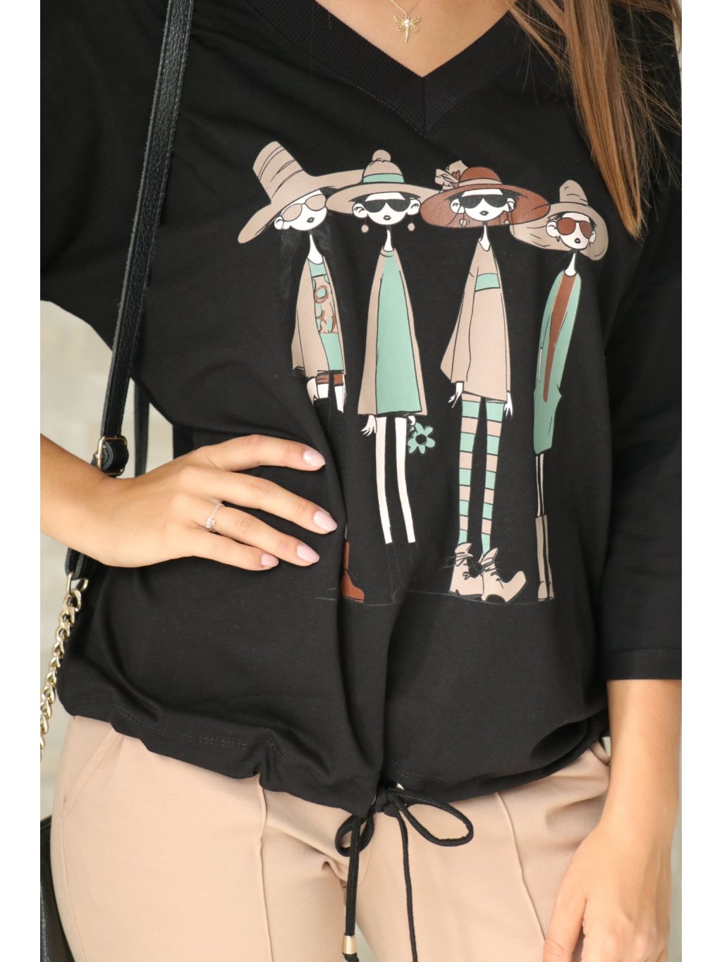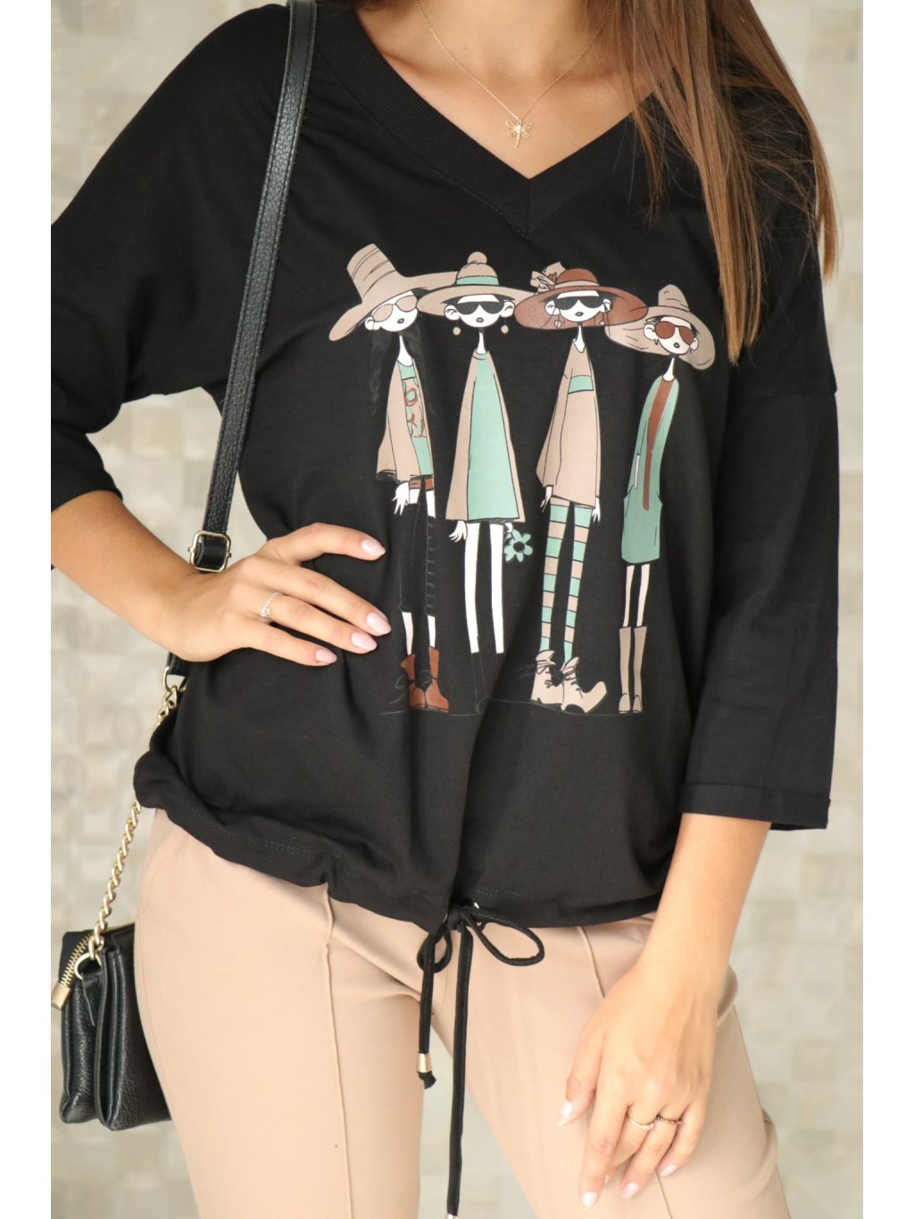 👚 **Halenka s potiskem siluet žen s kloboučky — výstřih do V, stažení v dolní části**