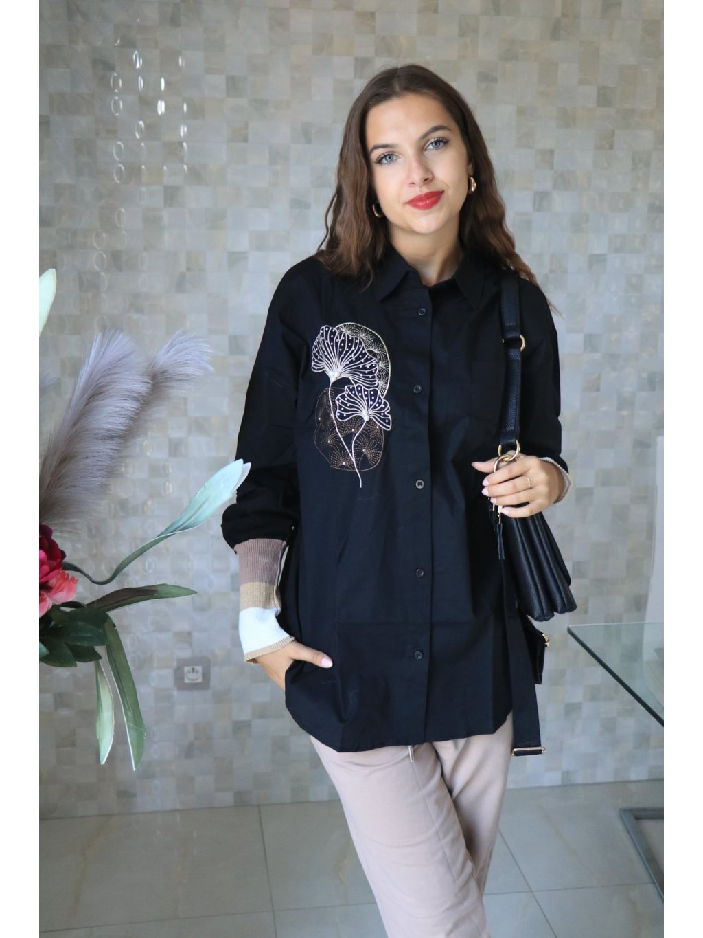 Elegantní černá košile s jemným květinovým akcentem. Vyrobená ze směsi 96% bavlna a 4% elastan pro příjemné nošení a mírnou pružnost, která zajišťuje lepší padnutí.