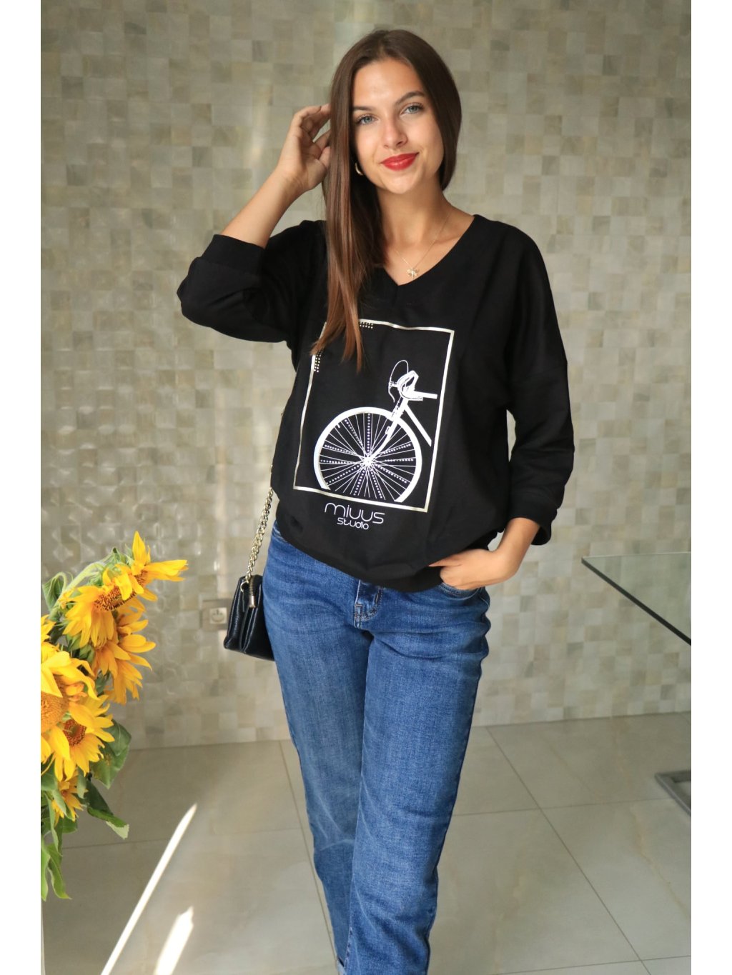 👚 **Černá mikinová halenka s potiskem kola — výstřih do V**