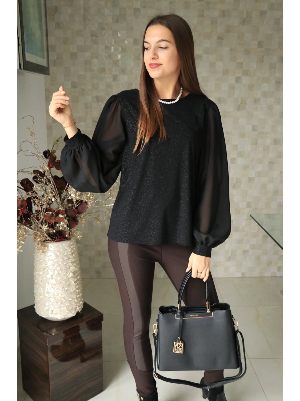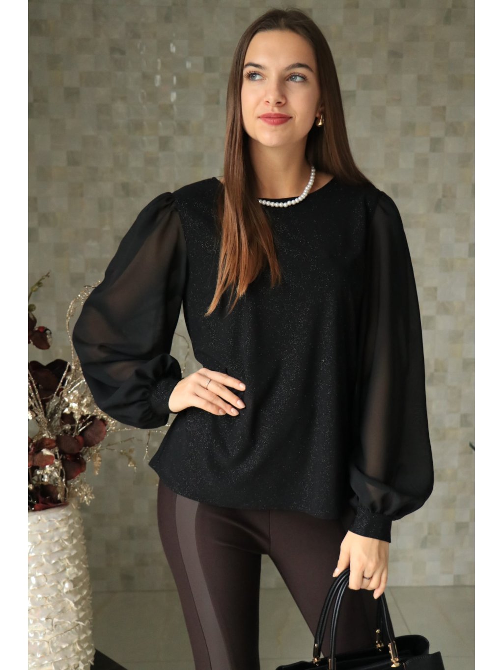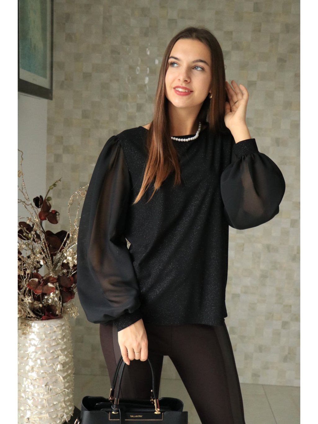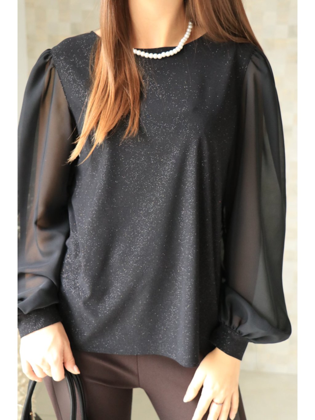 # Černá třpytivá halenka se stříbrnými korálky a síťovanými rukávy
