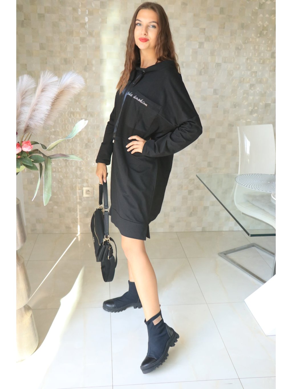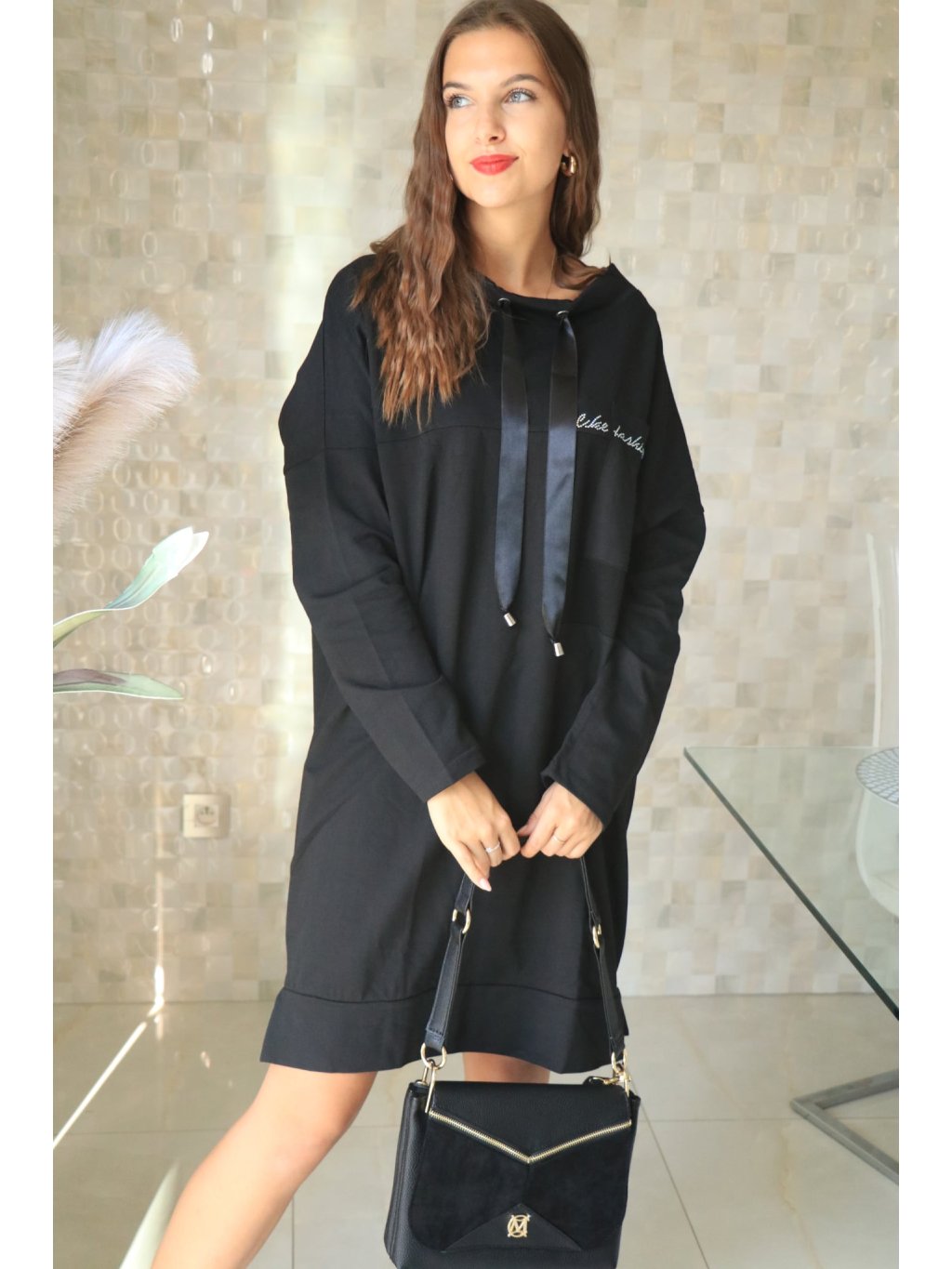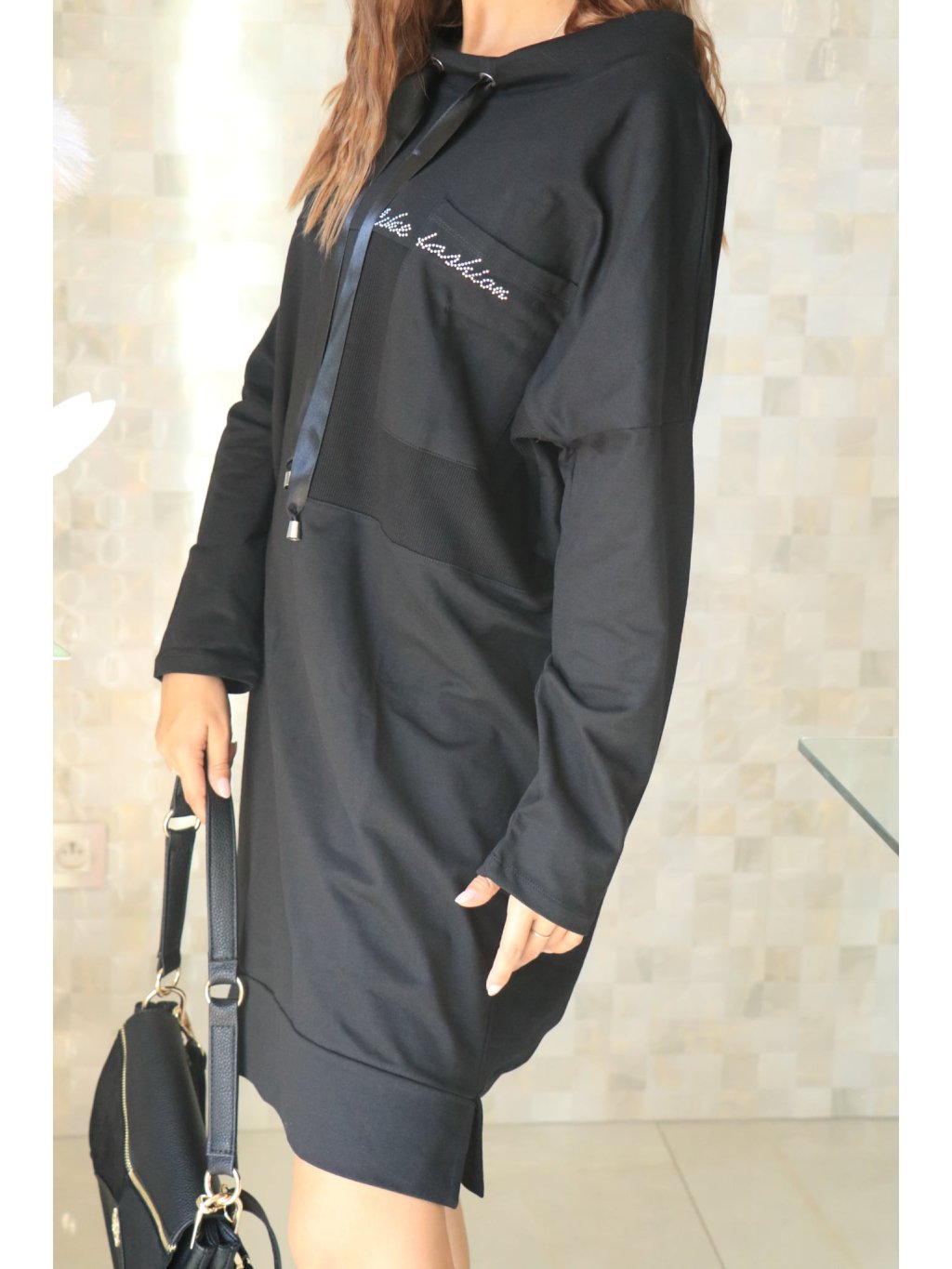 Ležérní/denní šaty vyrobené z příjemné směsi 95% bavlna a 5% elastan v nadčasovém provedení. Model má delší střih, šňůrky pro doladění siluety a náprsní kapsu ozdobenou kamínky, které dodávají jemný třpytivý akcent.