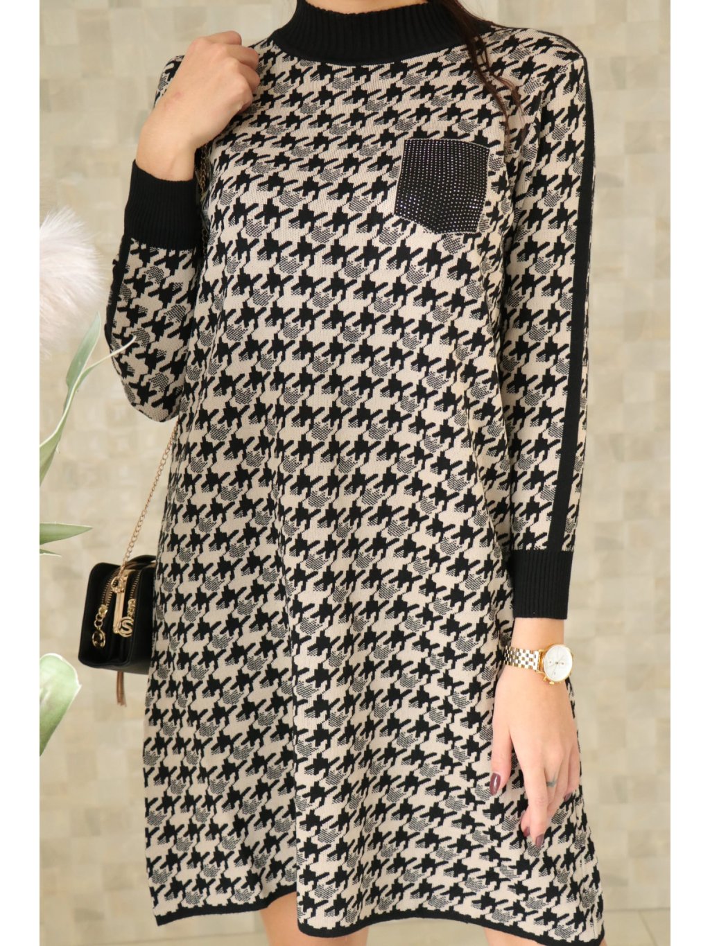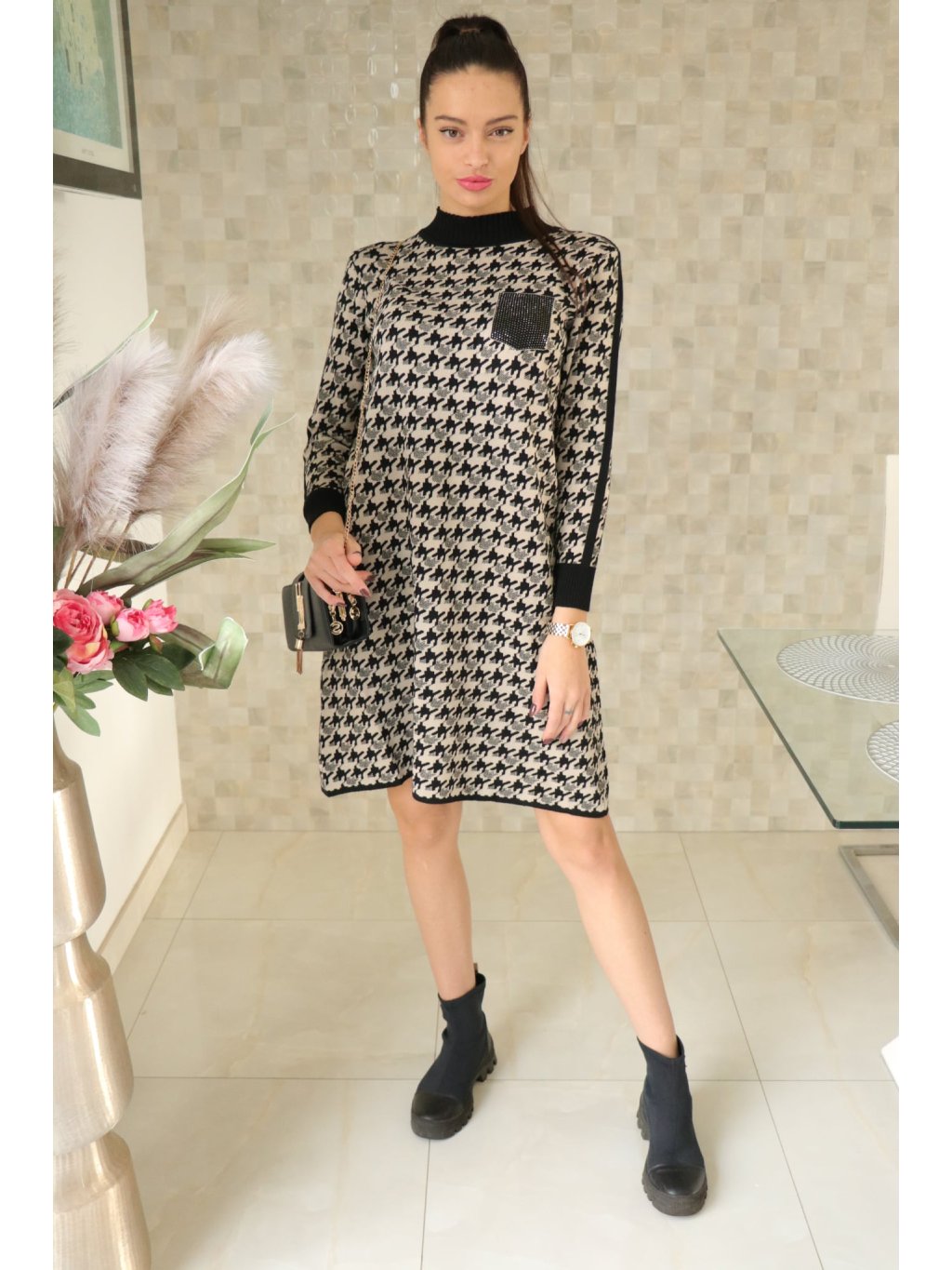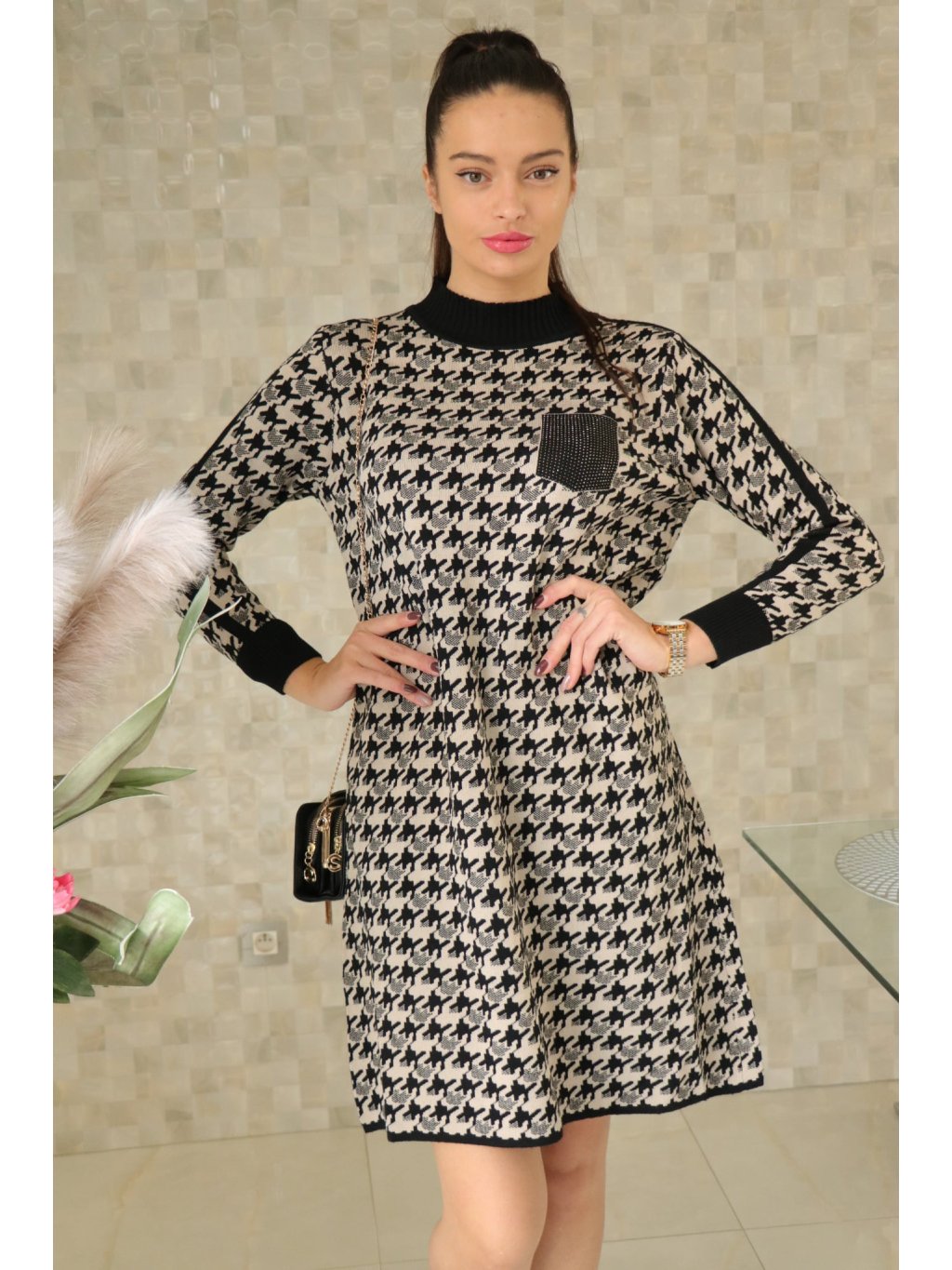 # 🖤 Černé šaty s kamínky a vzorem kohoutí stopa