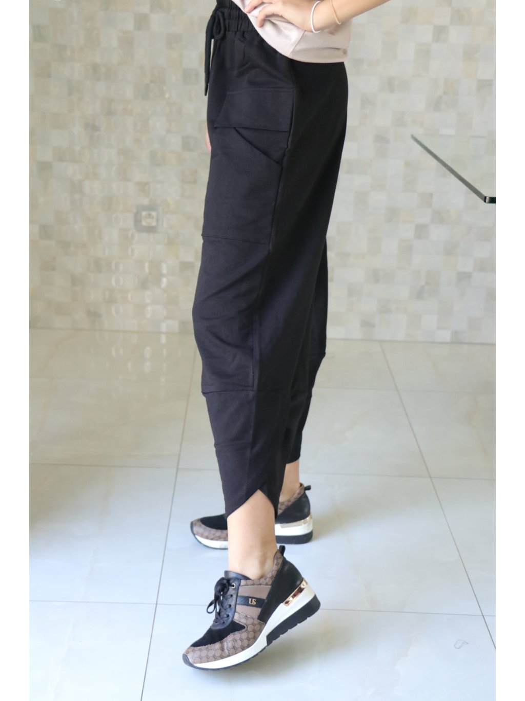 Pohodlné podzimní teplákové kalhoty s prostornými předními kapsami a pasem na gumu se šňůrkami — ideální pro každodenní nošení i relax.