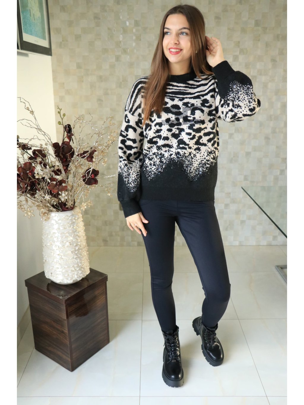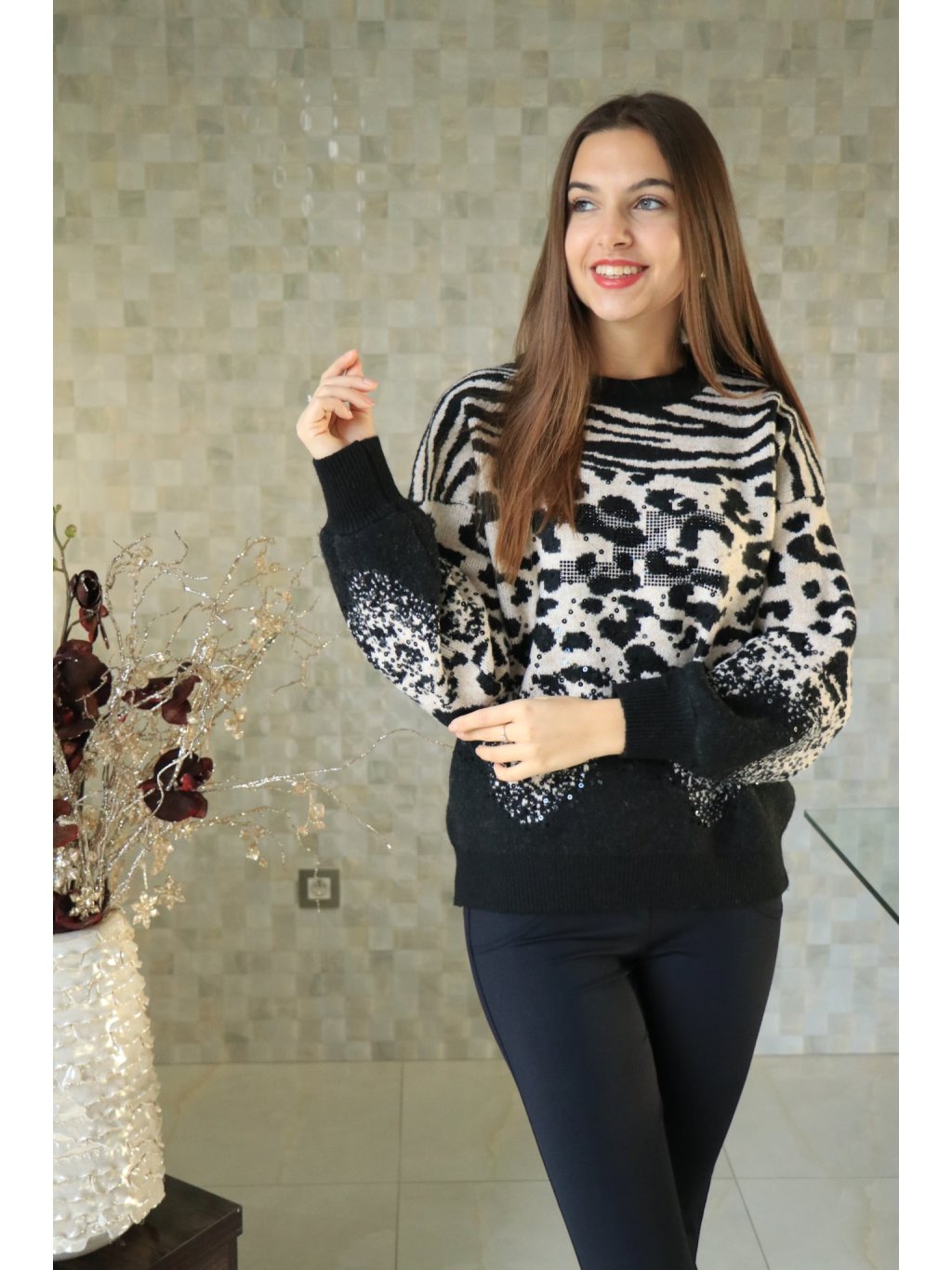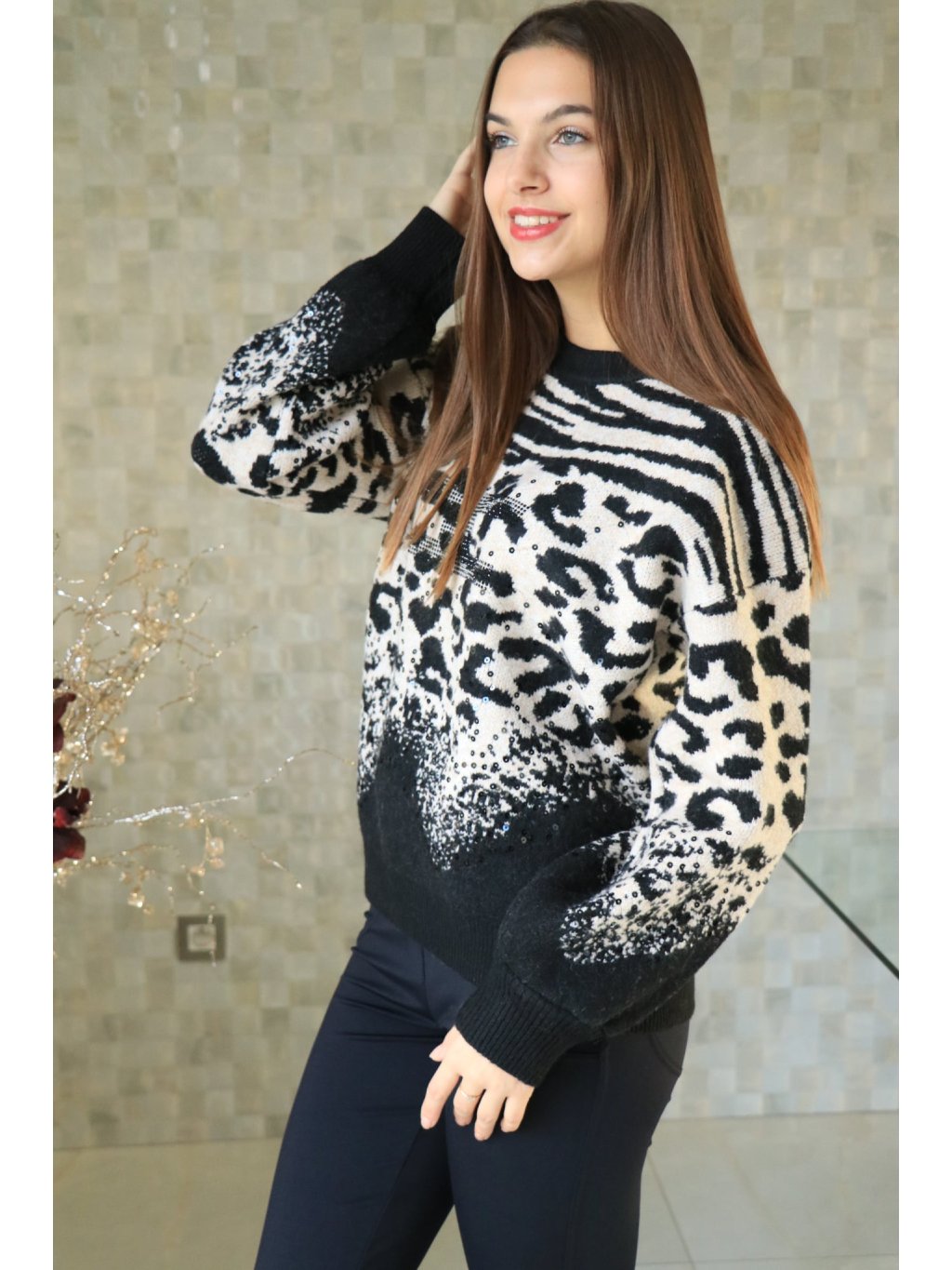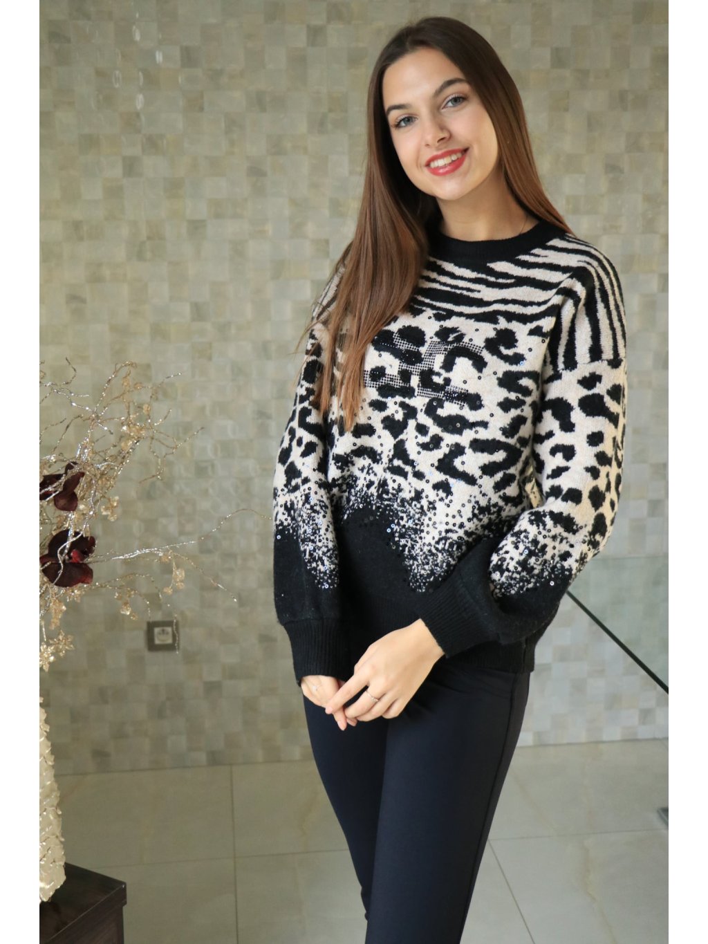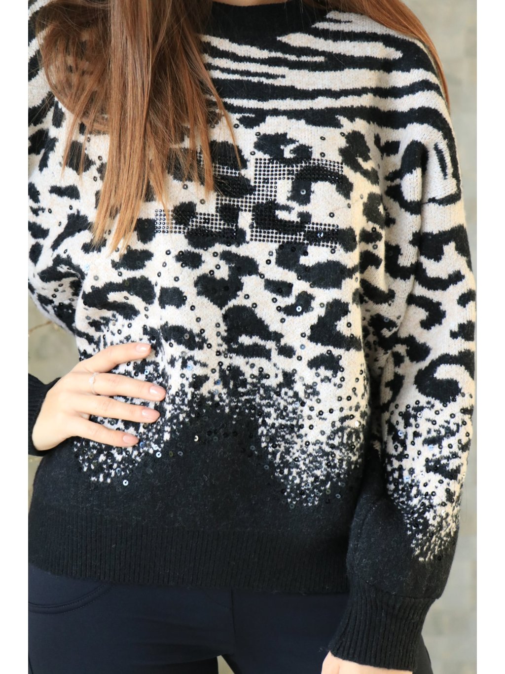 # Černý svetr s flitry se zvířecími vzory - zebrovaný a leopardí