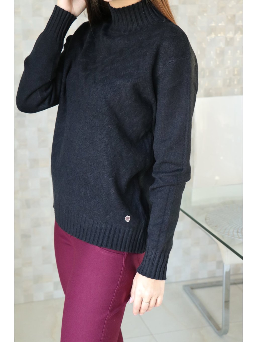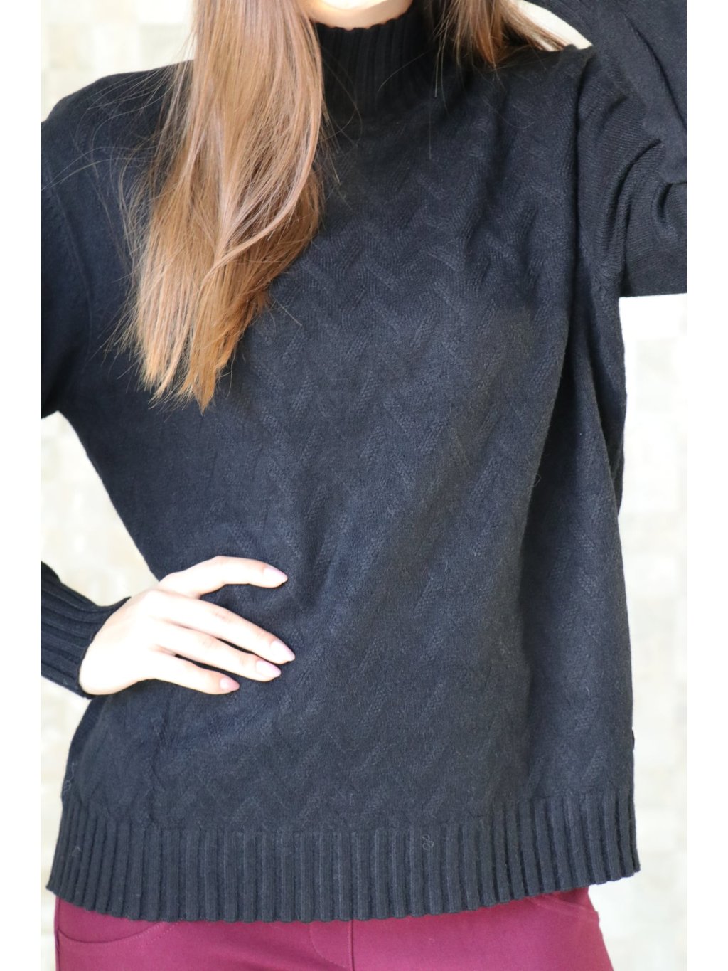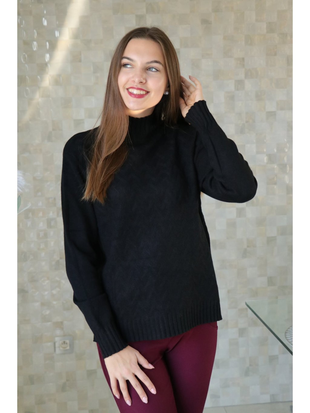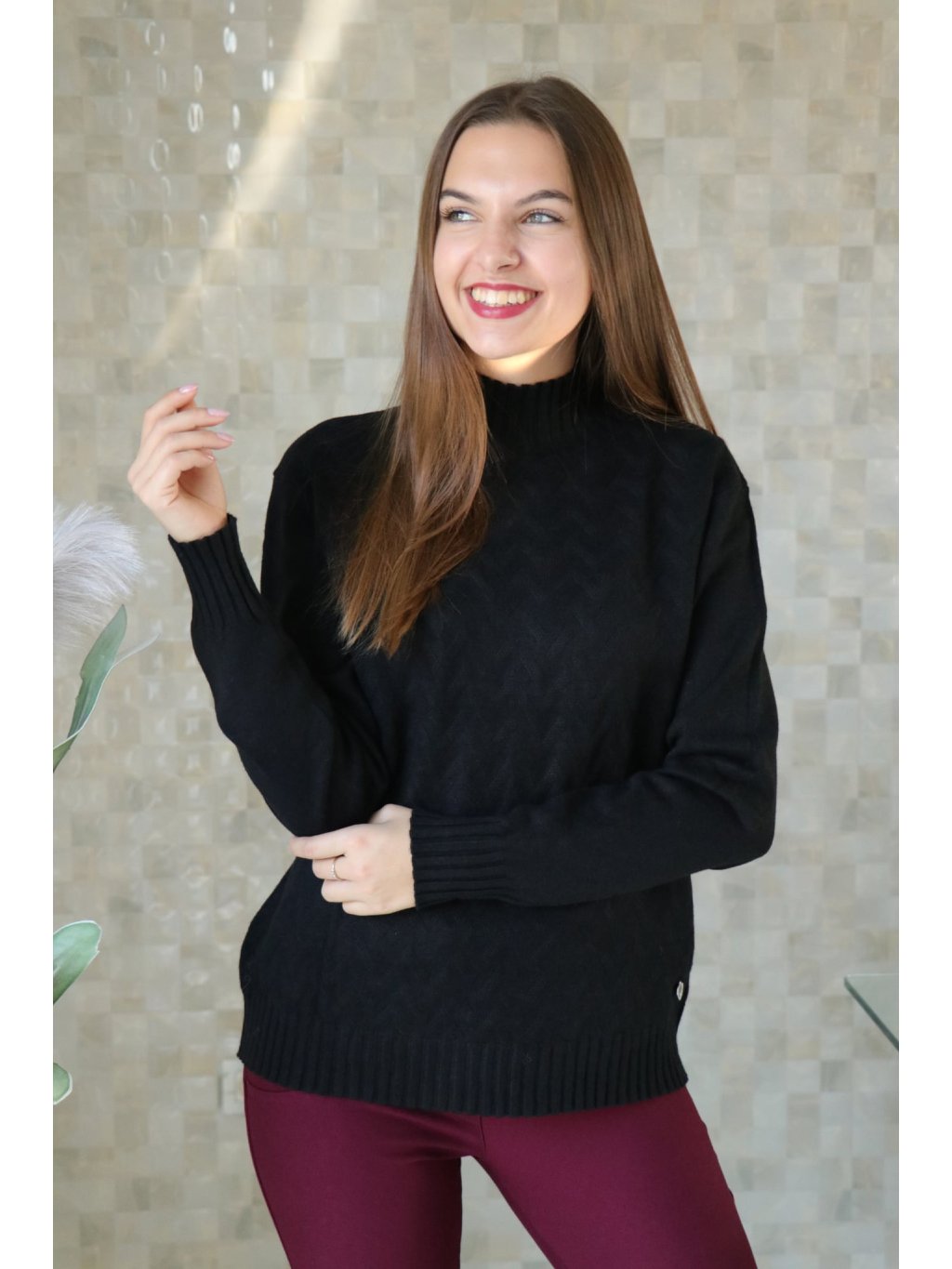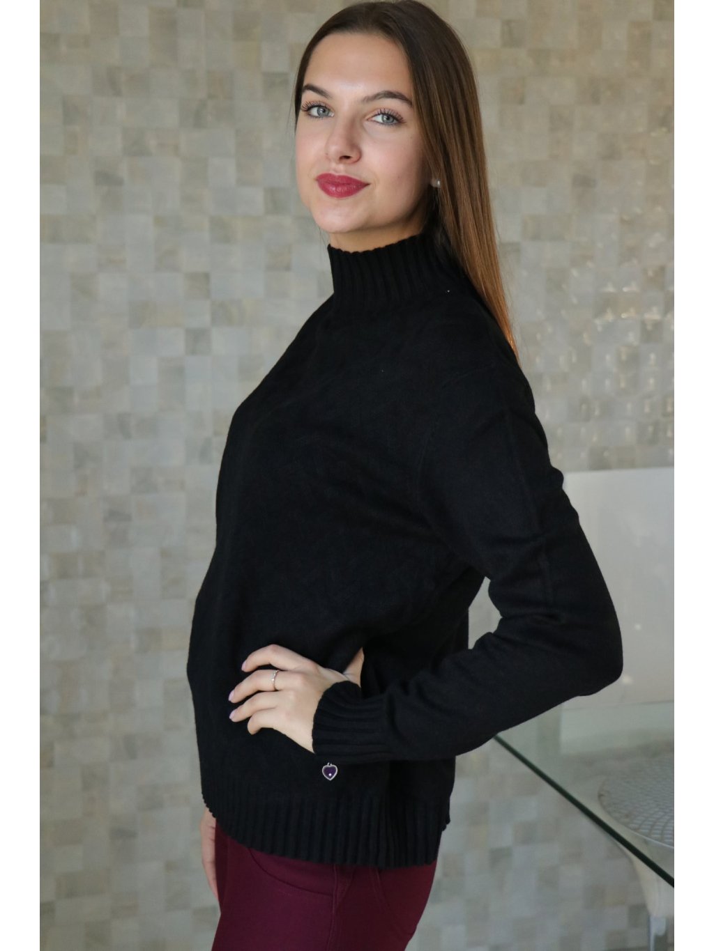 🎨 **Dekorativní vzor na přední části** – stylový detail, který oživí klasickou černou a dodá svetru jedinečný charakter