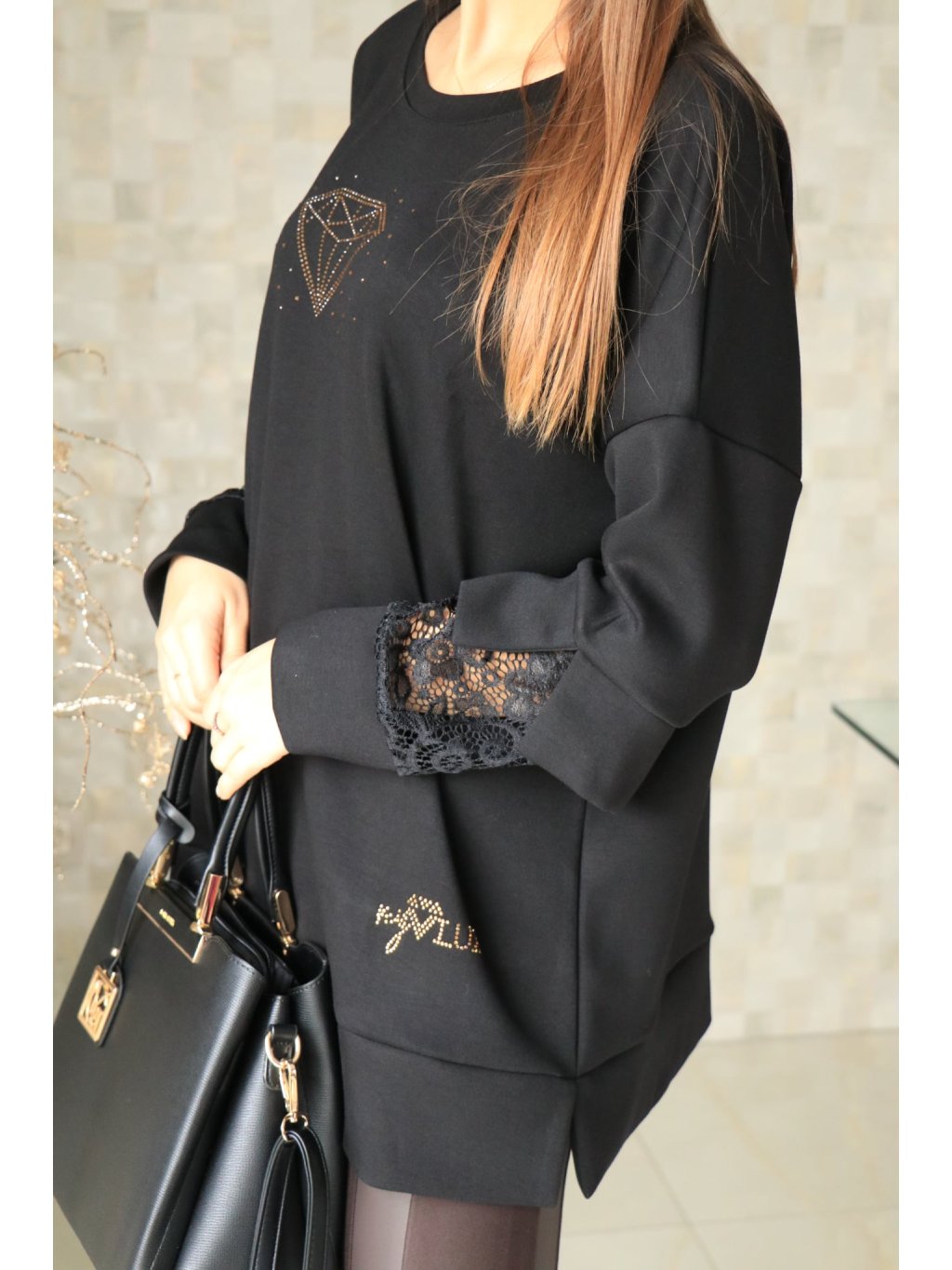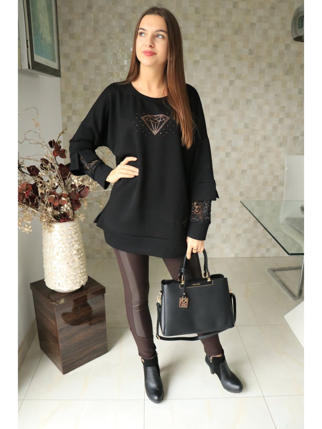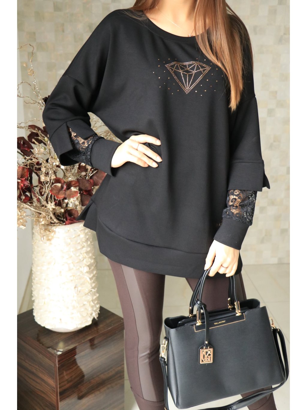 Černá halenka s kamínky a krajkou na rukávech vel. UNI