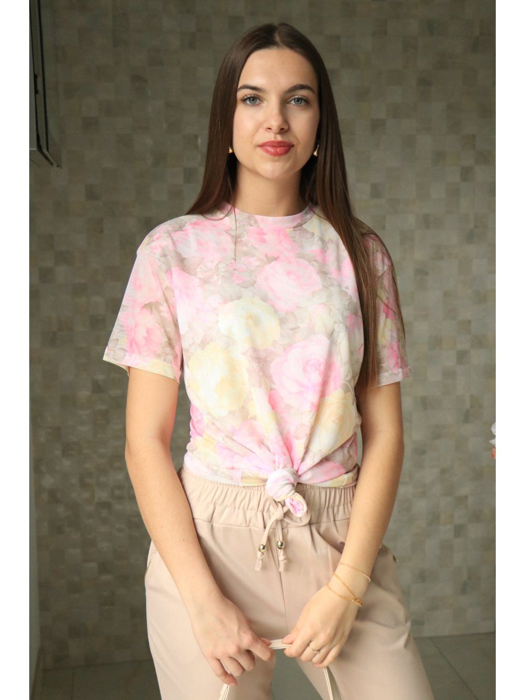 🌸 Nádherný květinový vzor v kombinaci žluté a růžové barvy dodává halenče romantiku a sofistikovaný vzhled