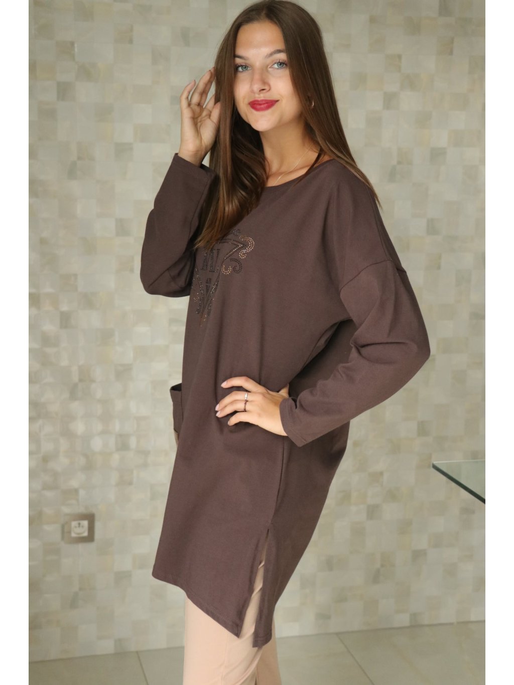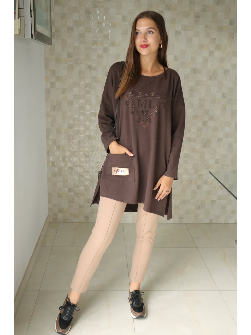 Elegantní/ležérní tunika vyrobená z příjemné směsi 95% bavlna a 5% elastan v teplé hnědé barvě. Tunika je zdobená jemnými kamínky na předním díle, které dodávají decentní třpytivý a ženský akcent.