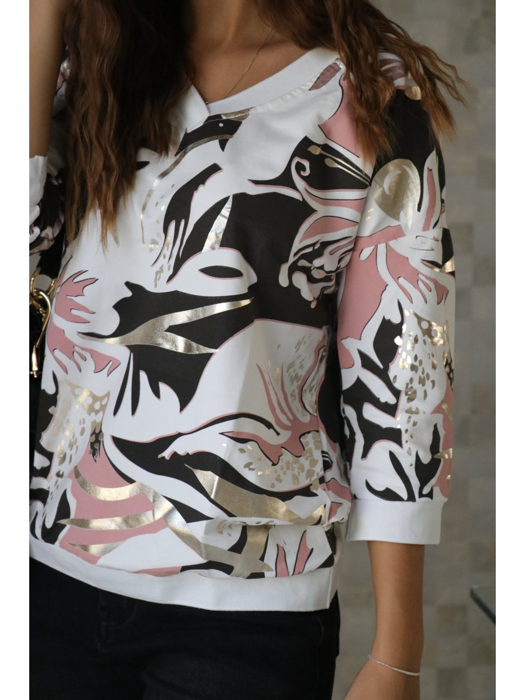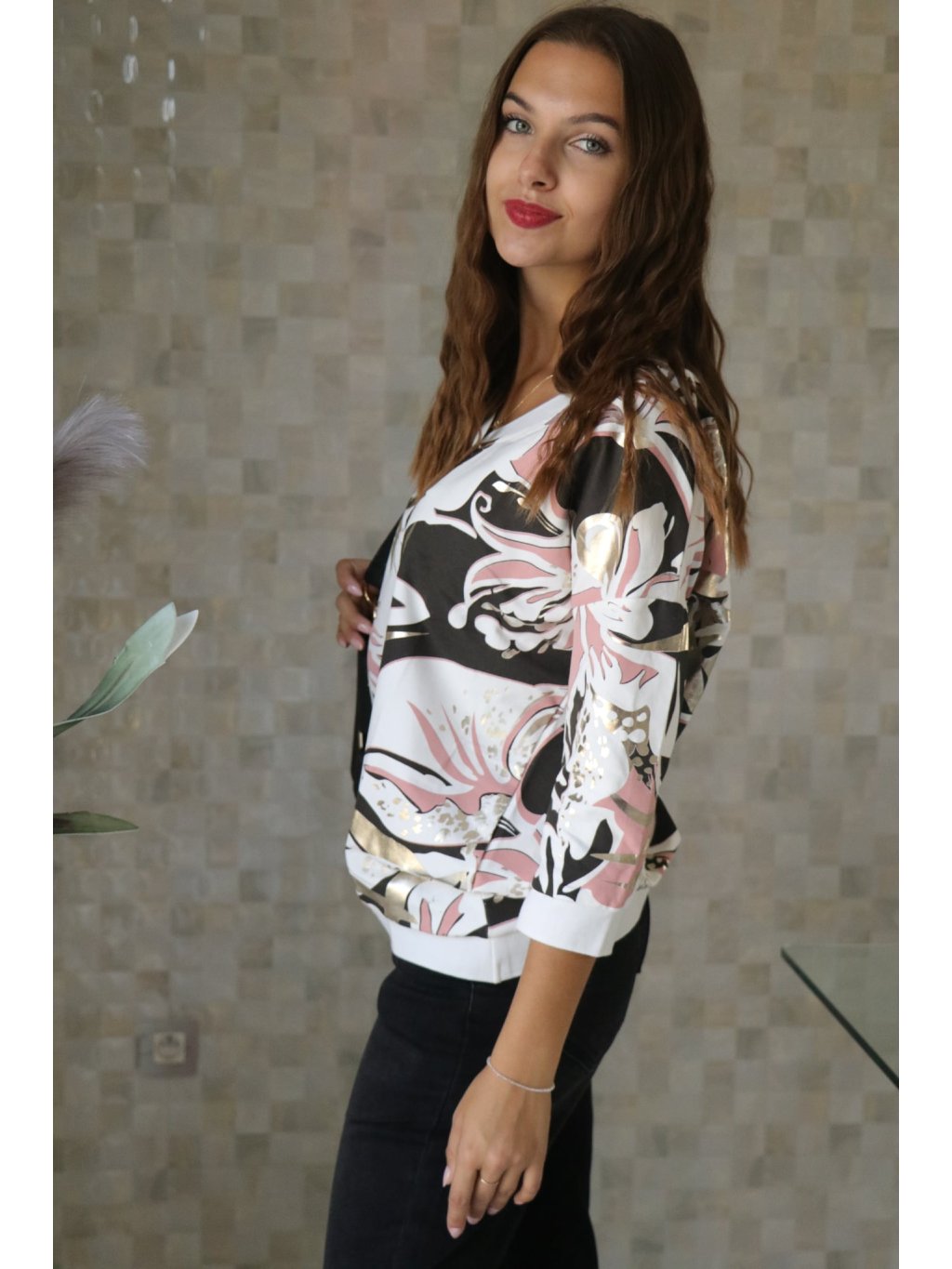 👚 **Hnědo-pudrová mikinová halenka do V se zlatým akcentem**
