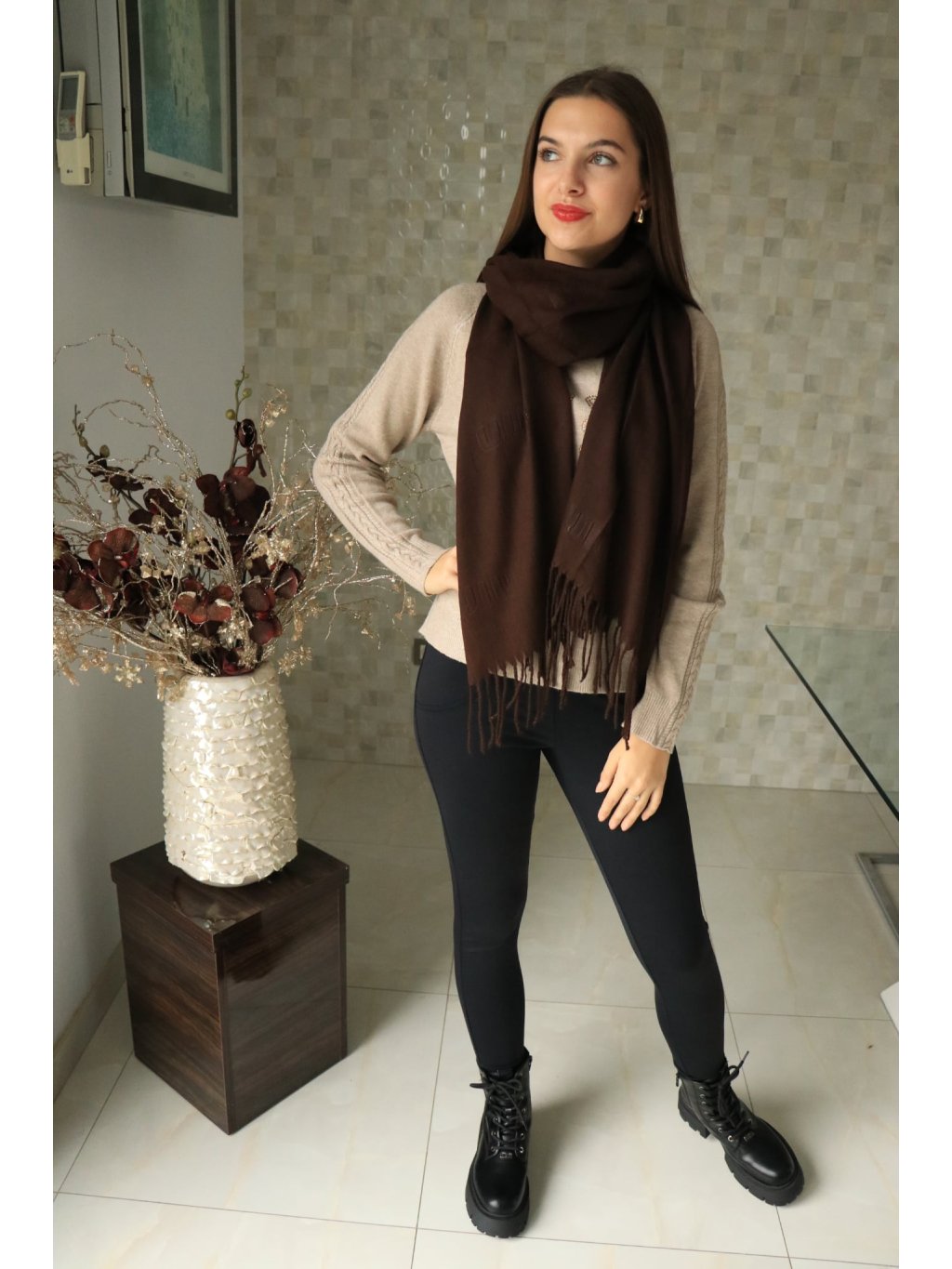 # Hnědý šátek s třásněmi