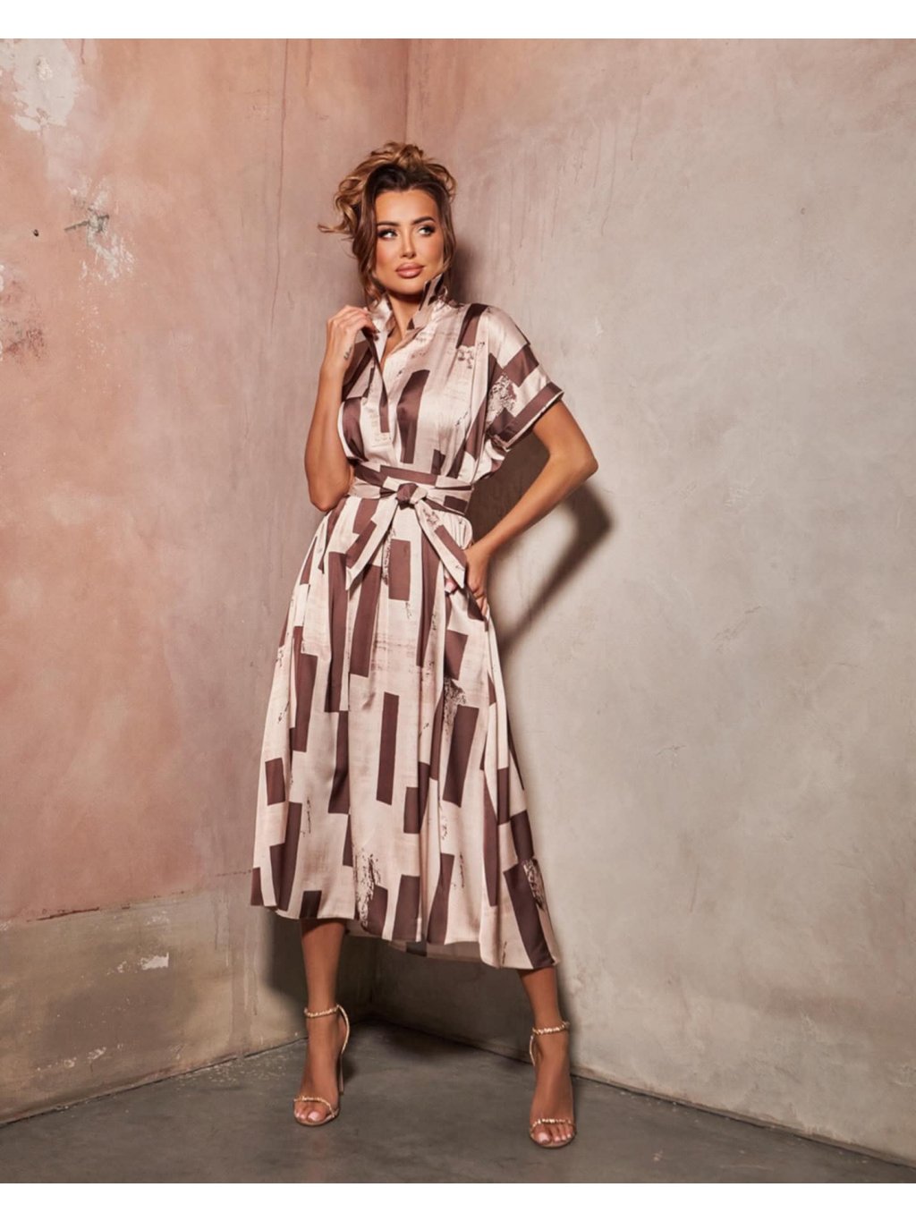 💃 Stylové dámské šaty vyrobené z kvalitního materiálu (95% viskóza, 5% elastan) v kombinaci hnědé a béžové barvičky. Šaty mají košilový design s krátkým rukávem a dvěma malými kapsami po stranách.
