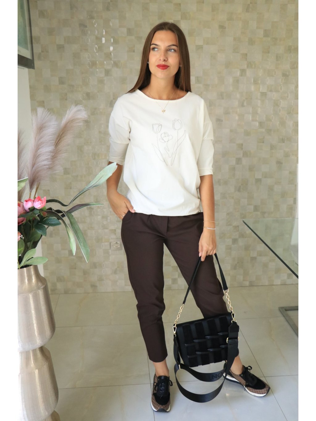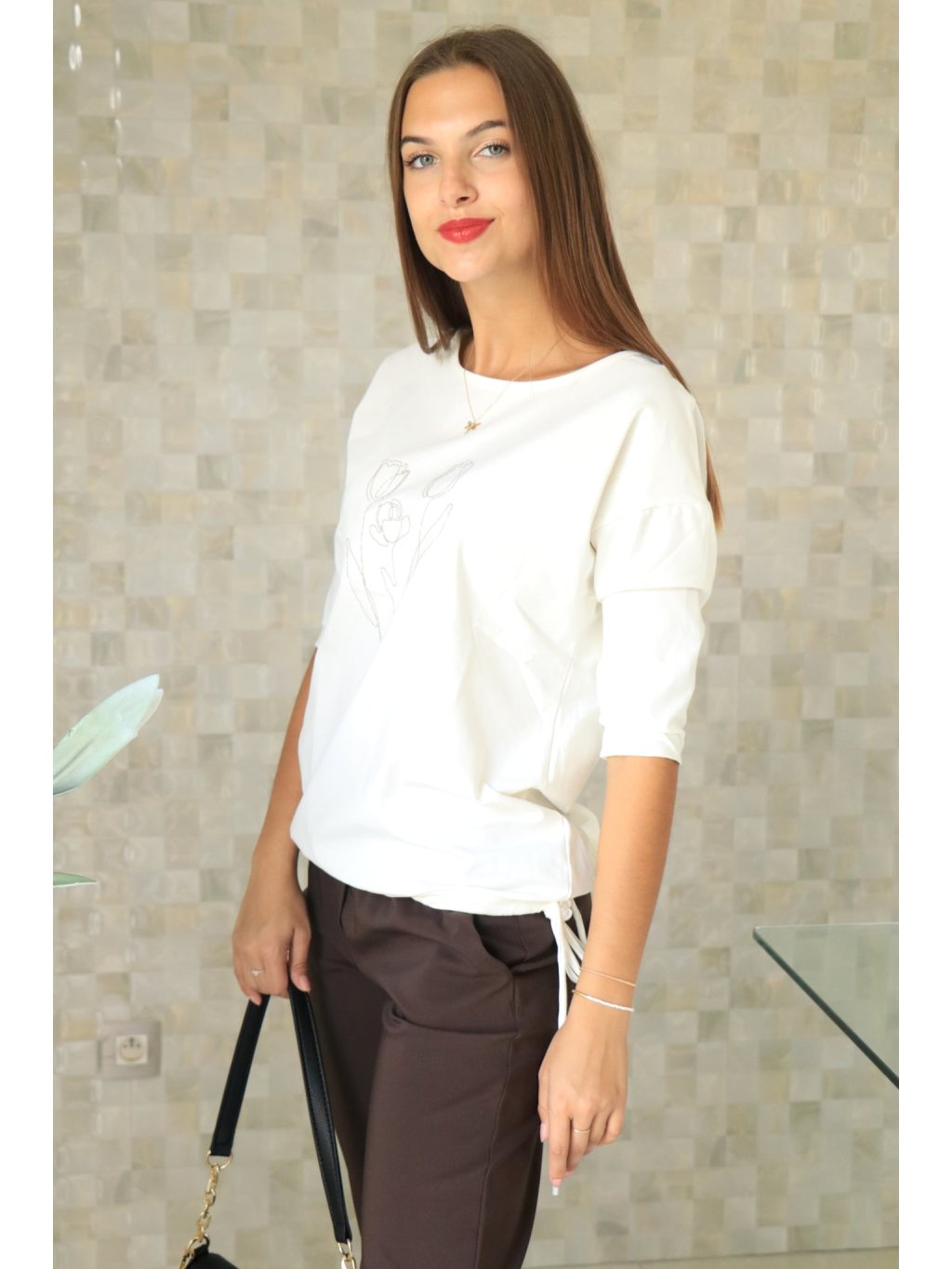 Pohodlná krémová halenka se stříbrným květinovým motivem a stahováním ve spodní části
