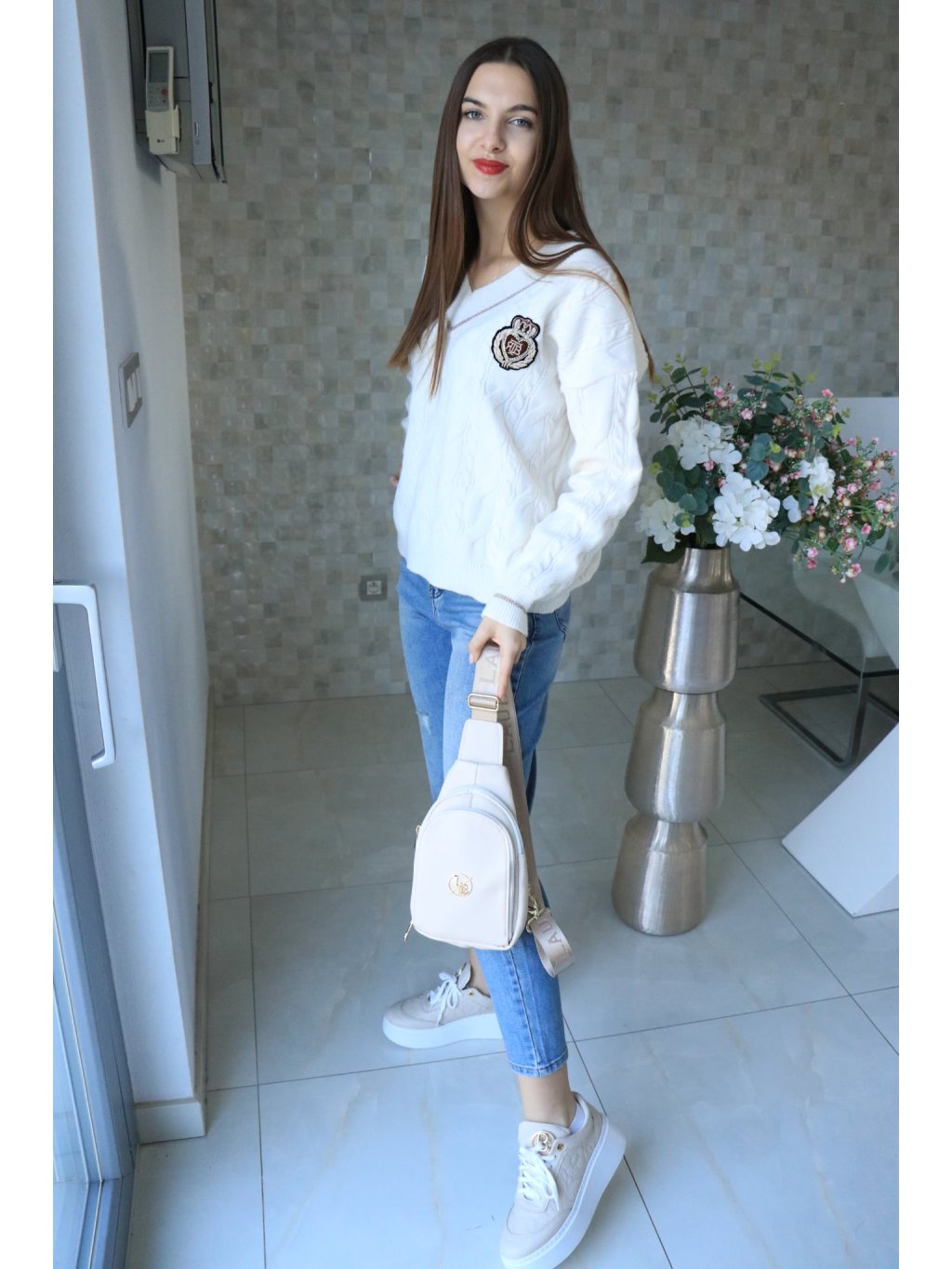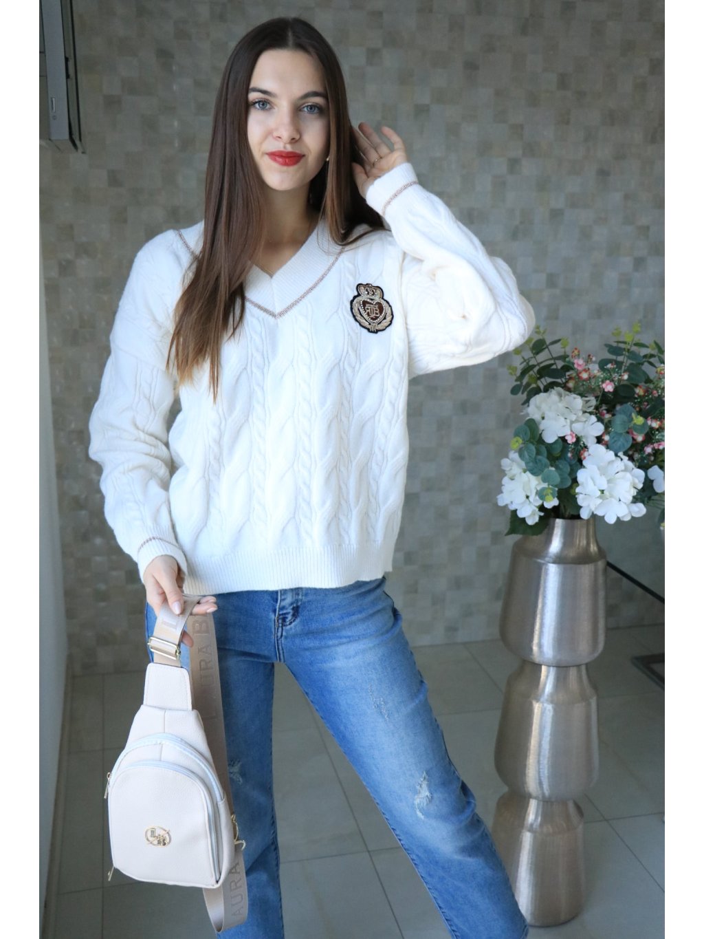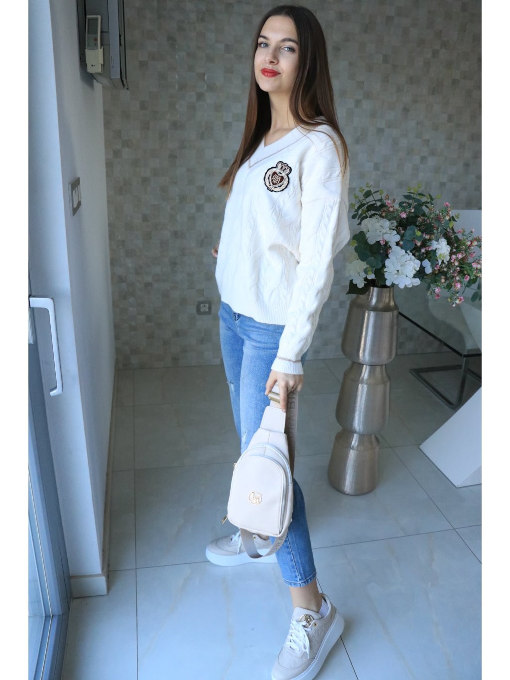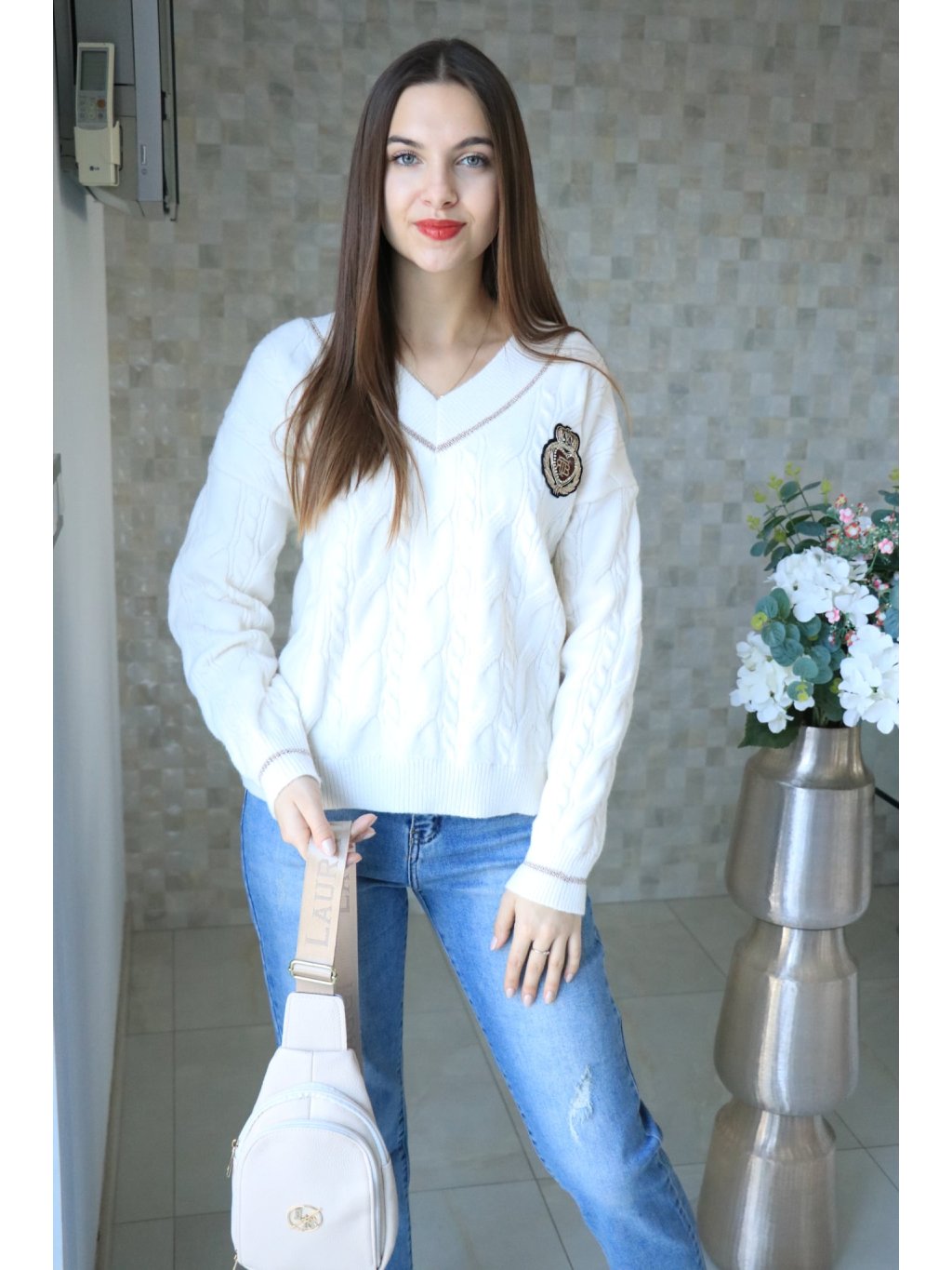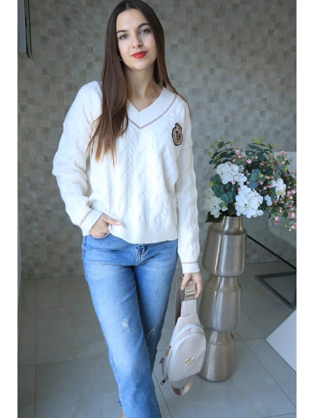 🤍 Krémový svetr do V se znakem – jarní kolekce 🤍