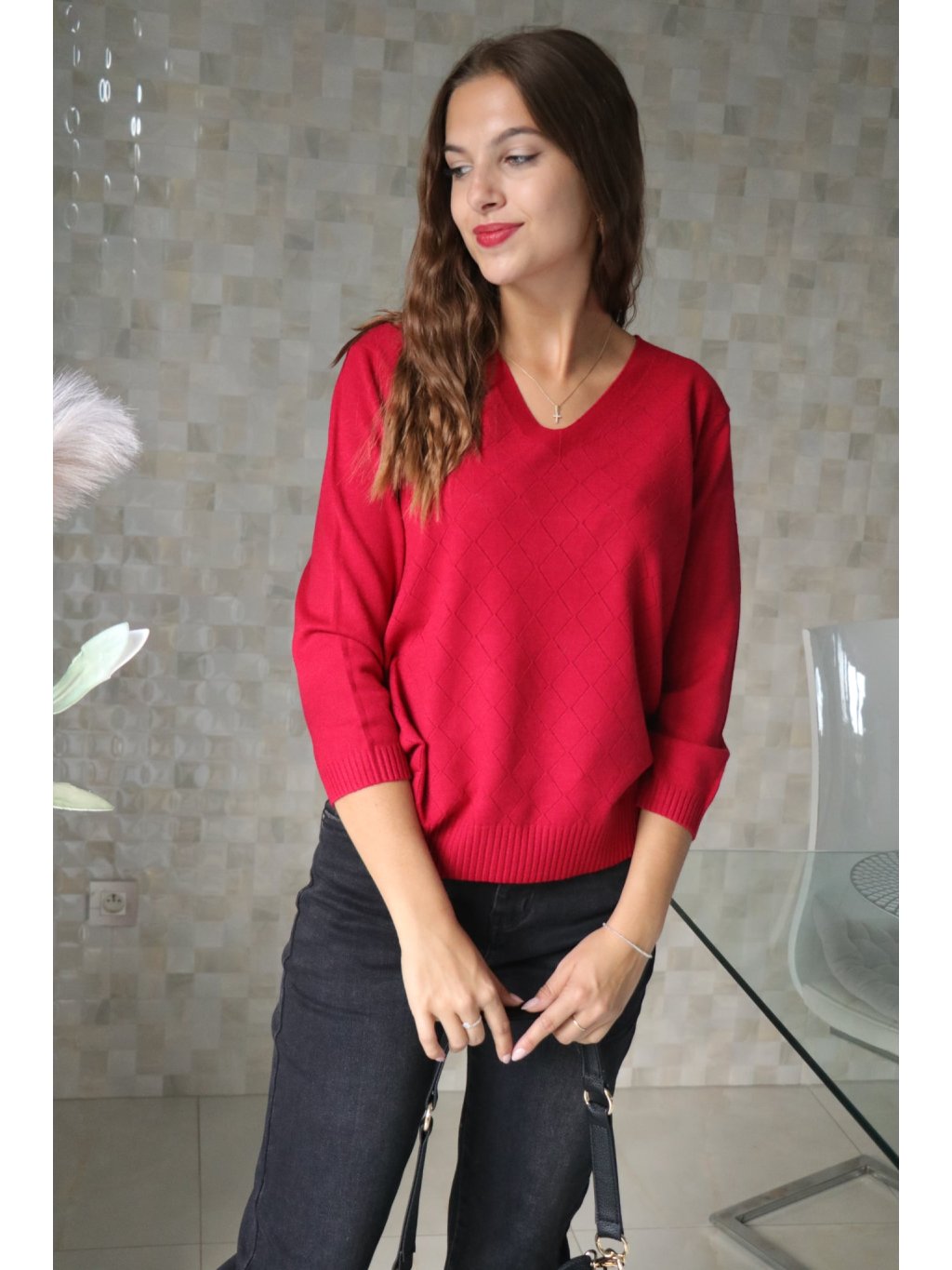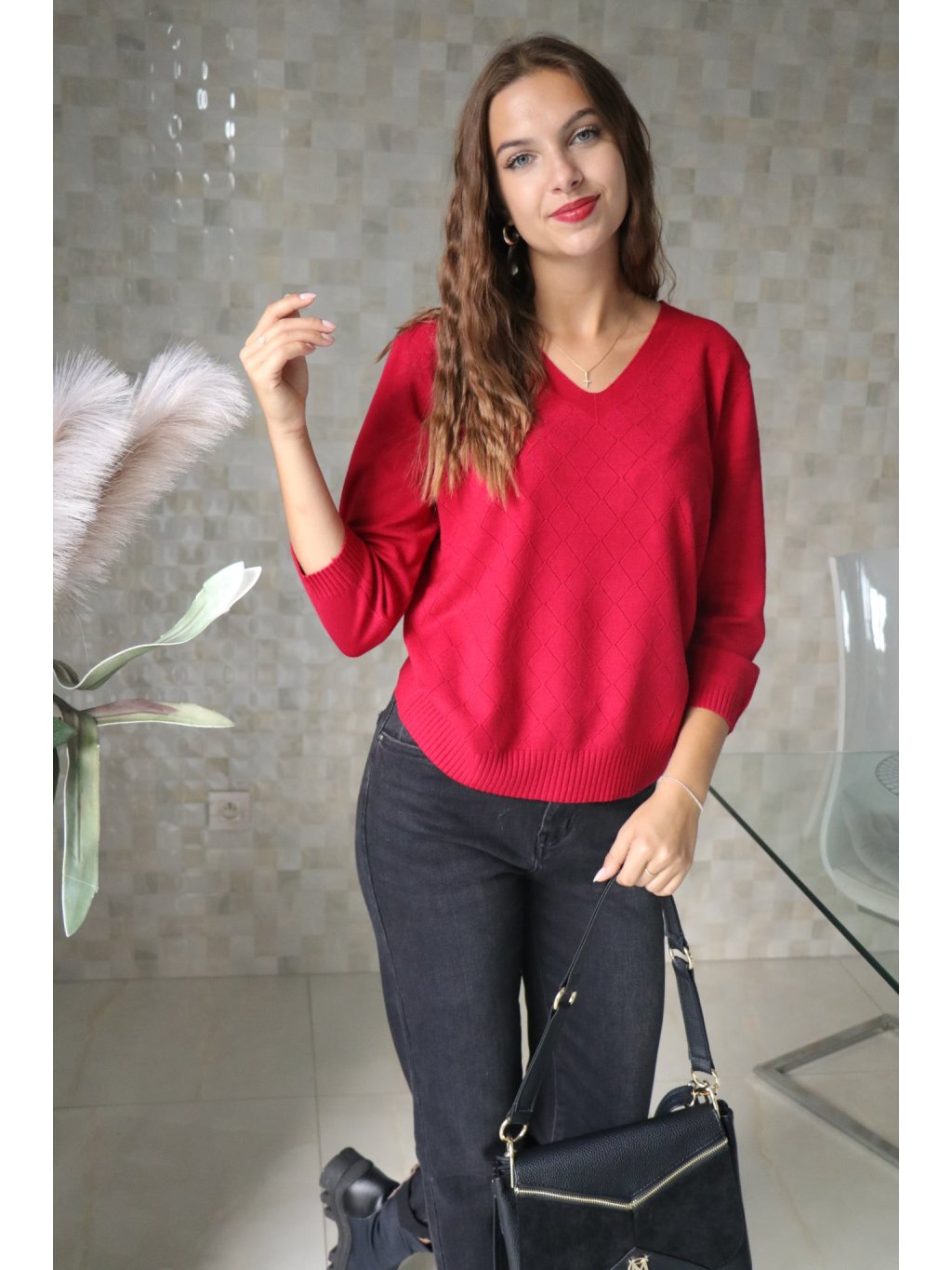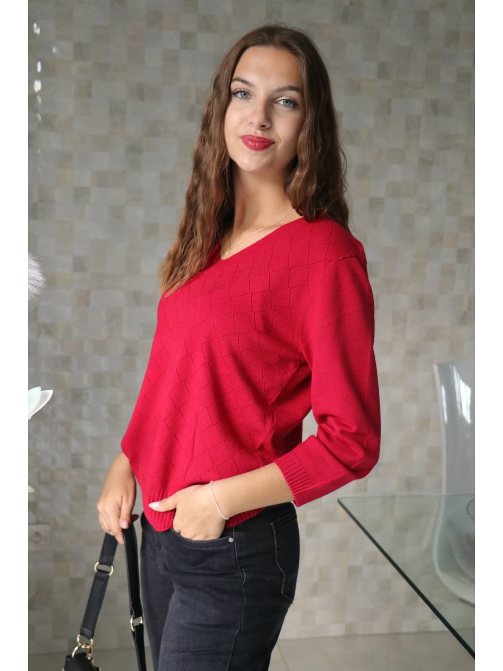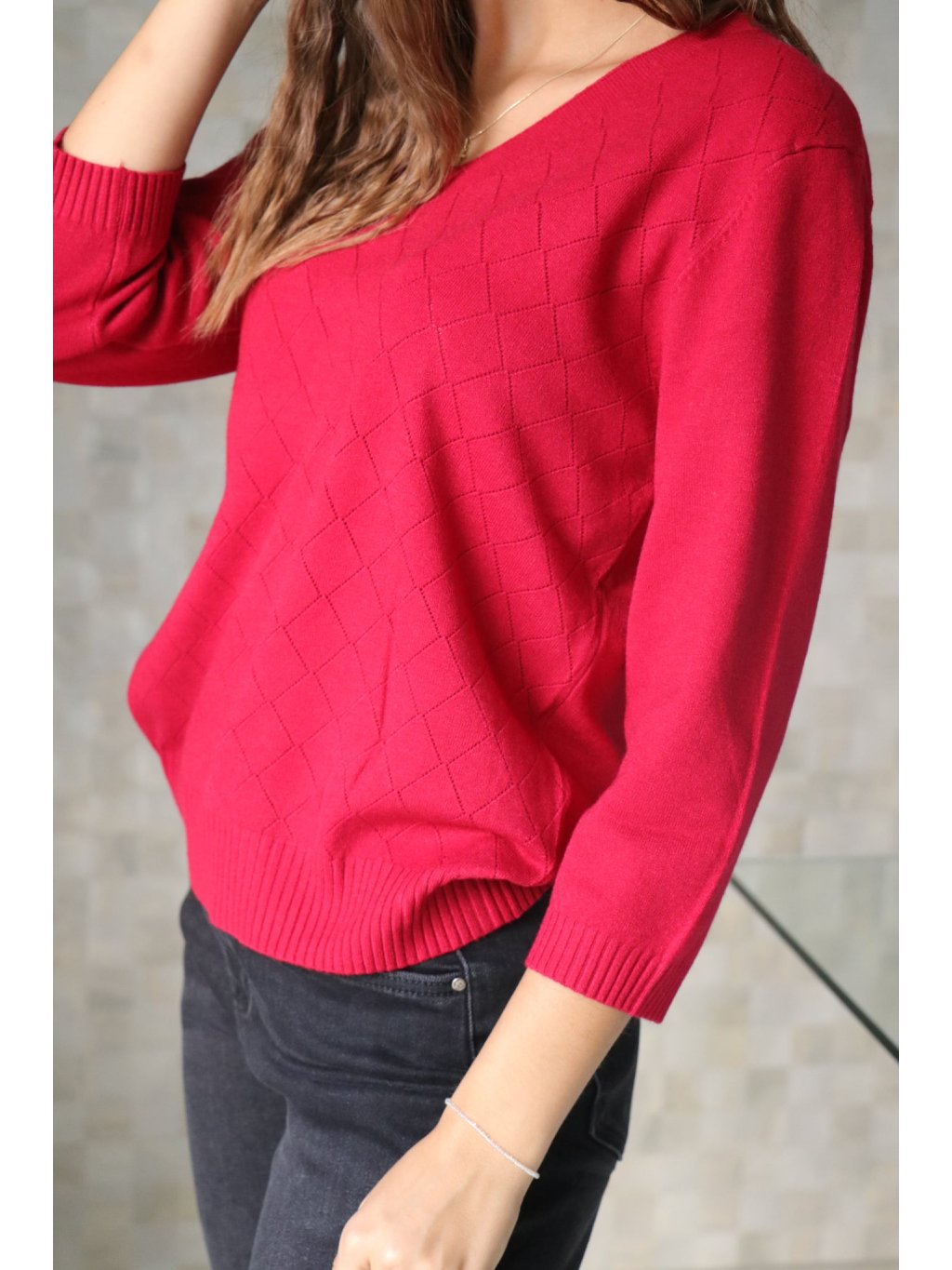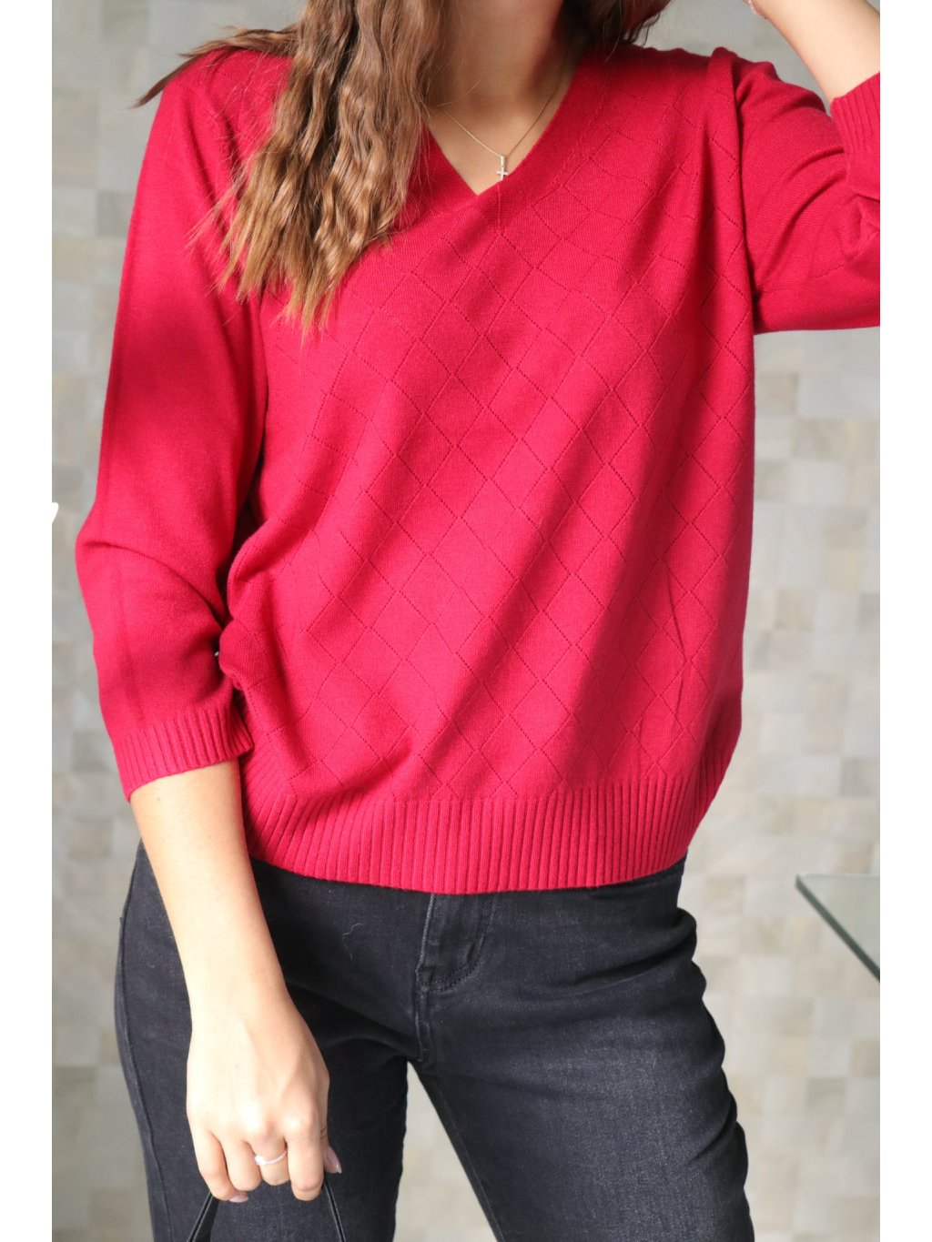 - Lehký pletený svetřík ve vínovém odstínu se vzorem dírkovaných kosočtverců.