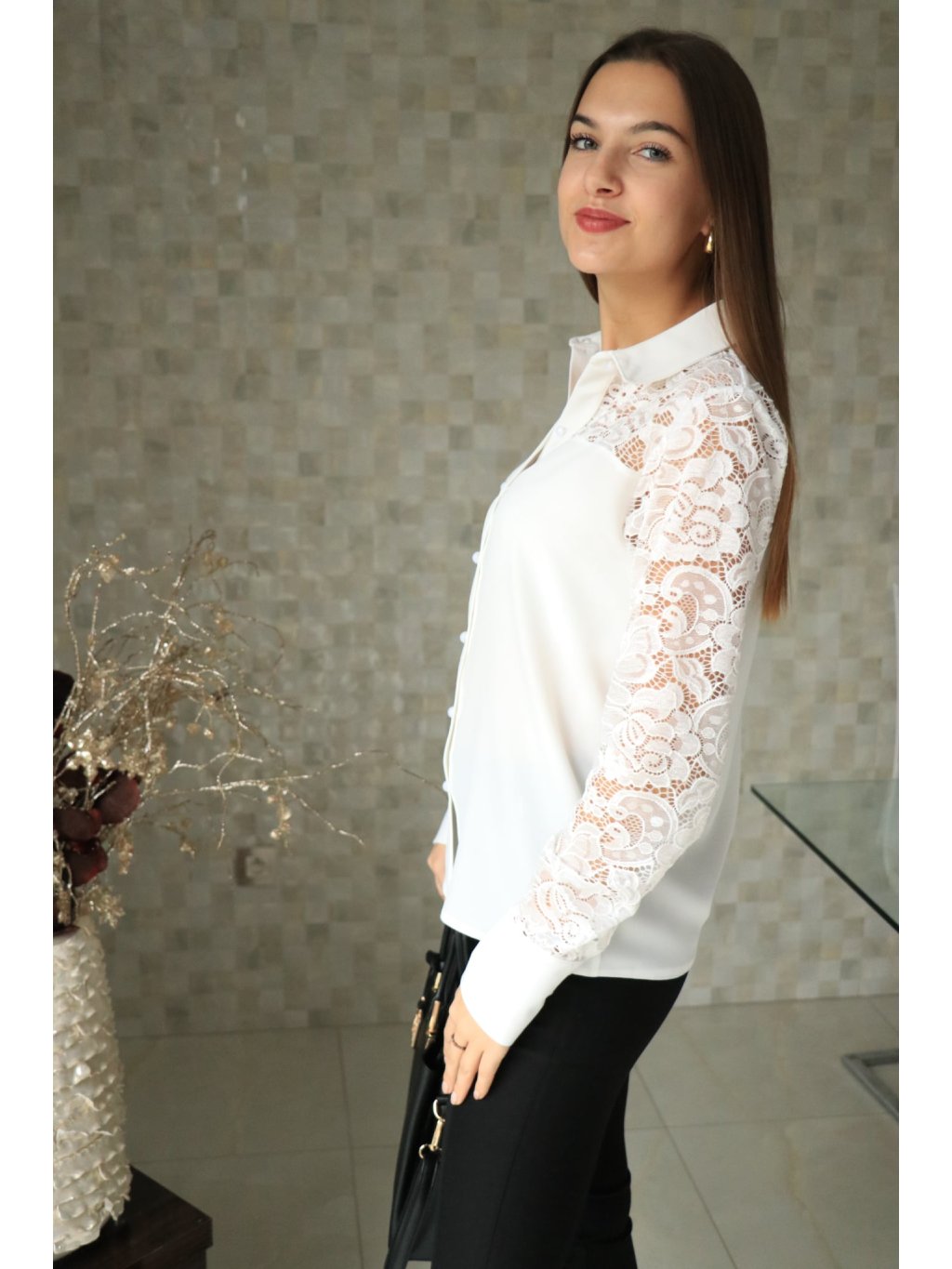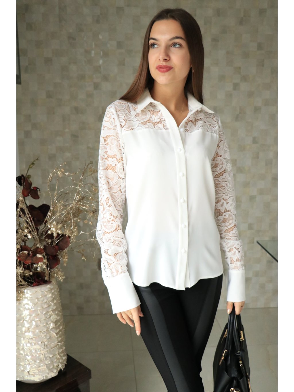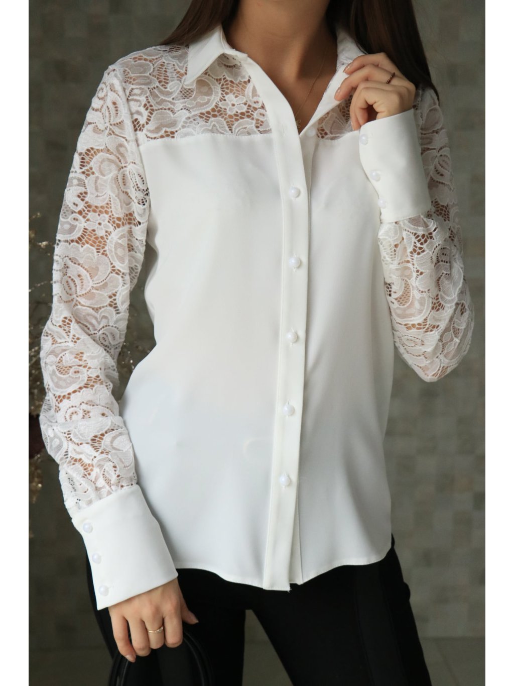 Objevte nadčasovou eleganci s naší nádhernou bílou košilí zdobenou jemnou krajkou. Rafinované krajkové detaily na dlouhých rukávech a horní části hrudníku dodávají tomuto klasickému kousku romantický šarm a zjemňují každý outfit.