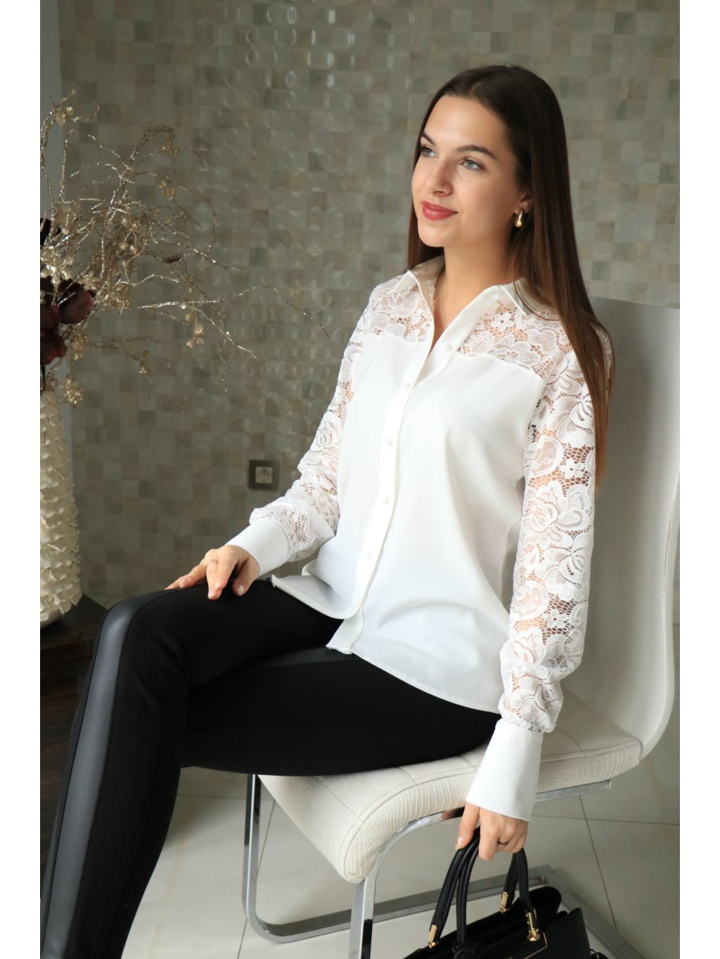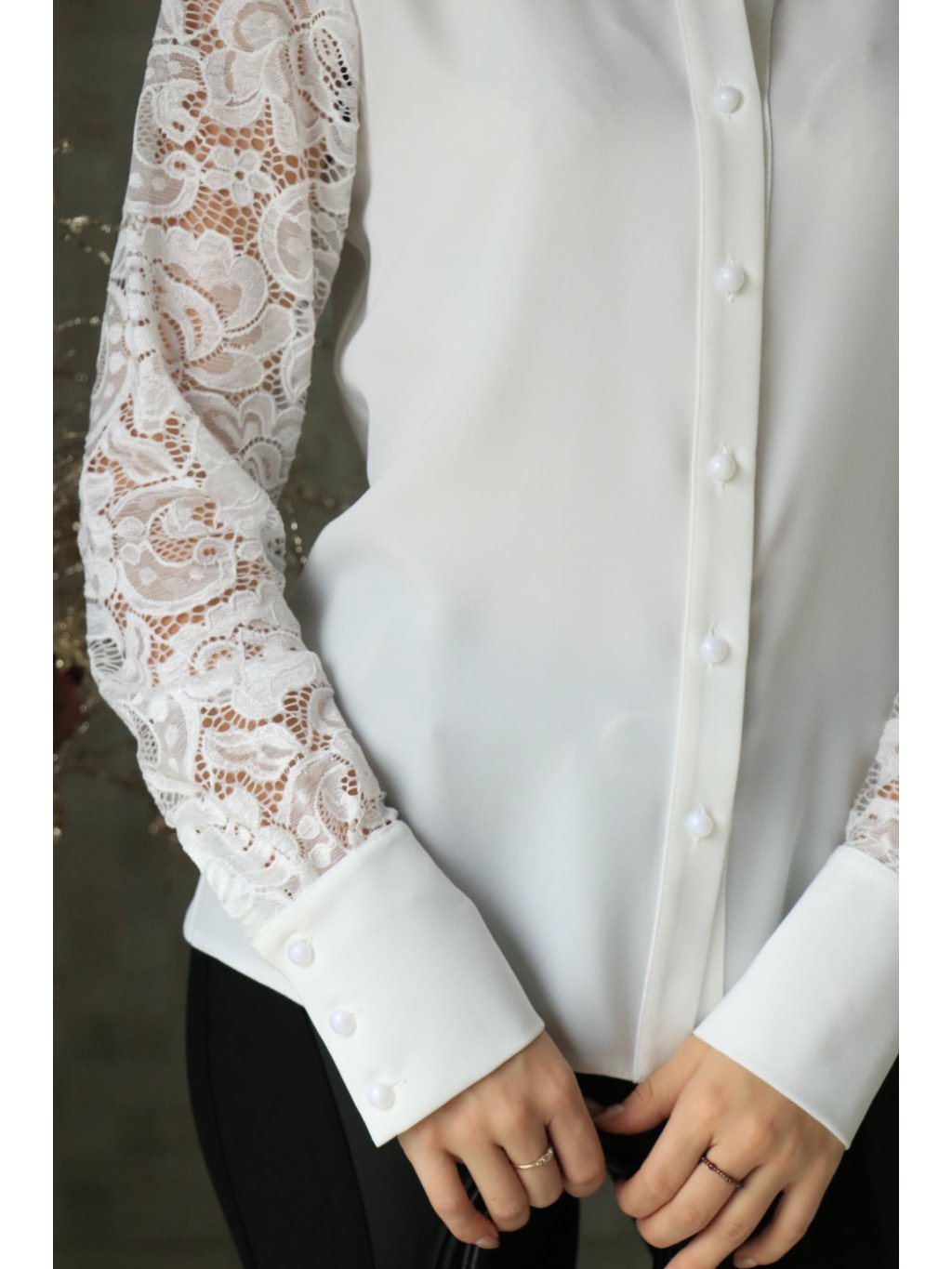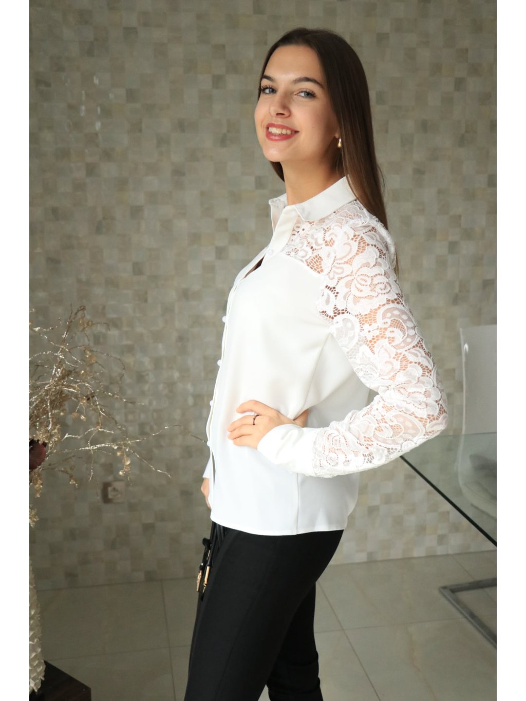 Objevte nadčasovou eleganci s naší nádhernou bílou košilí zdobenou jemnou krajkou. Rafinované krajkové detaily na dlouhých rukávech a horní části hrudníku dodávají tomuto klasickému kousku romantický šarm a zjemňují každý outfit.