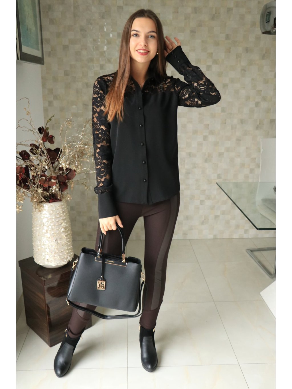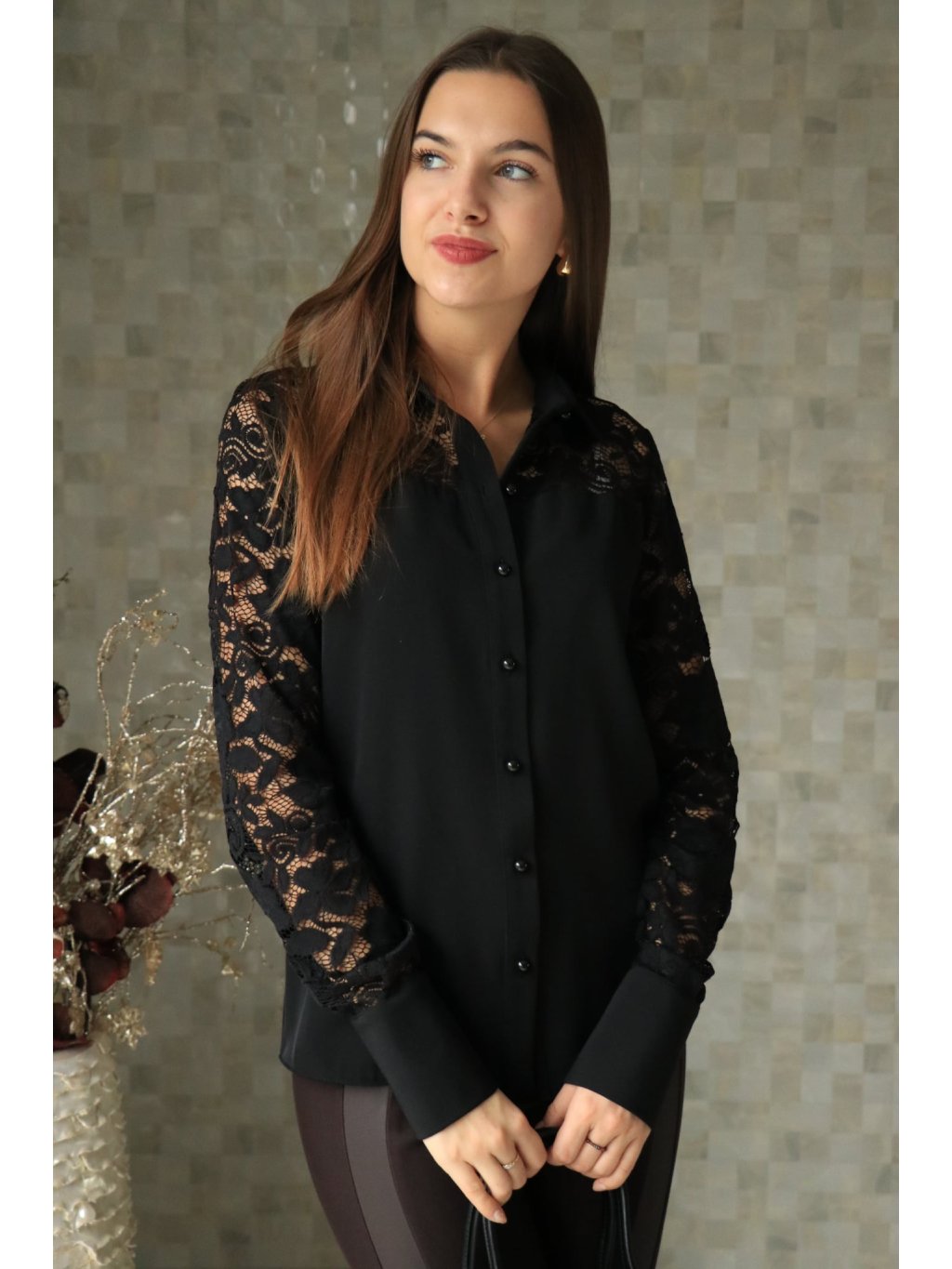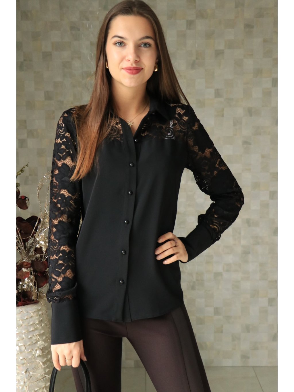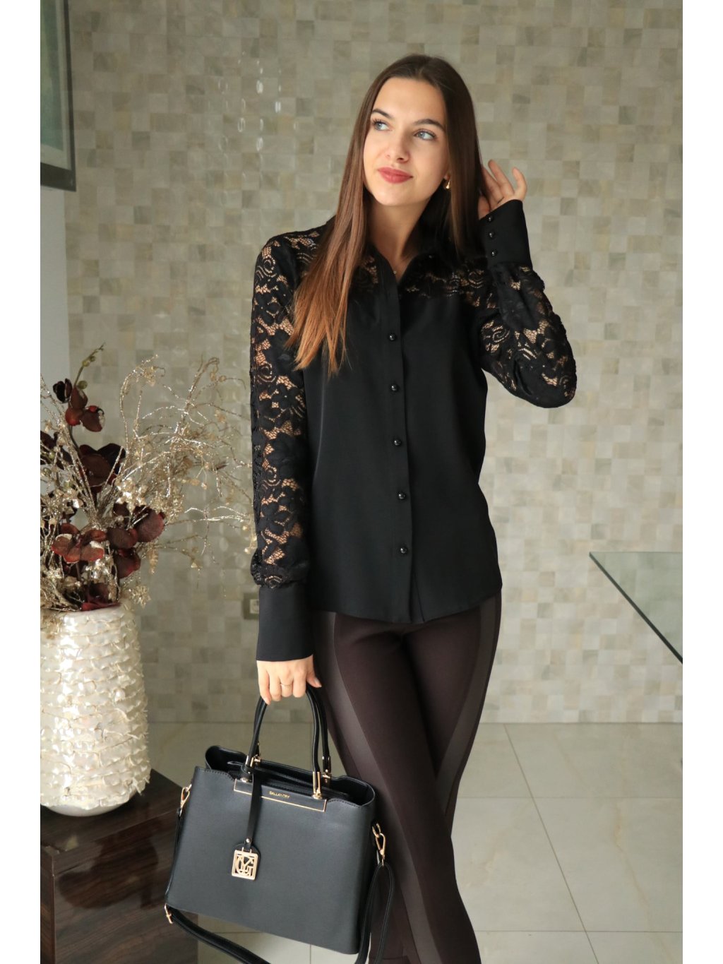 Dodejte svému šatníku nádech sofistikované elegance s naší luxusní černou košilí zdobenou jemnou krajkou. Rafinované krajkové detaily na dlouhých rukávech a horní části hrudníku dodávají tomuto kousku romantický a zároveň sebevědomý charakter.
