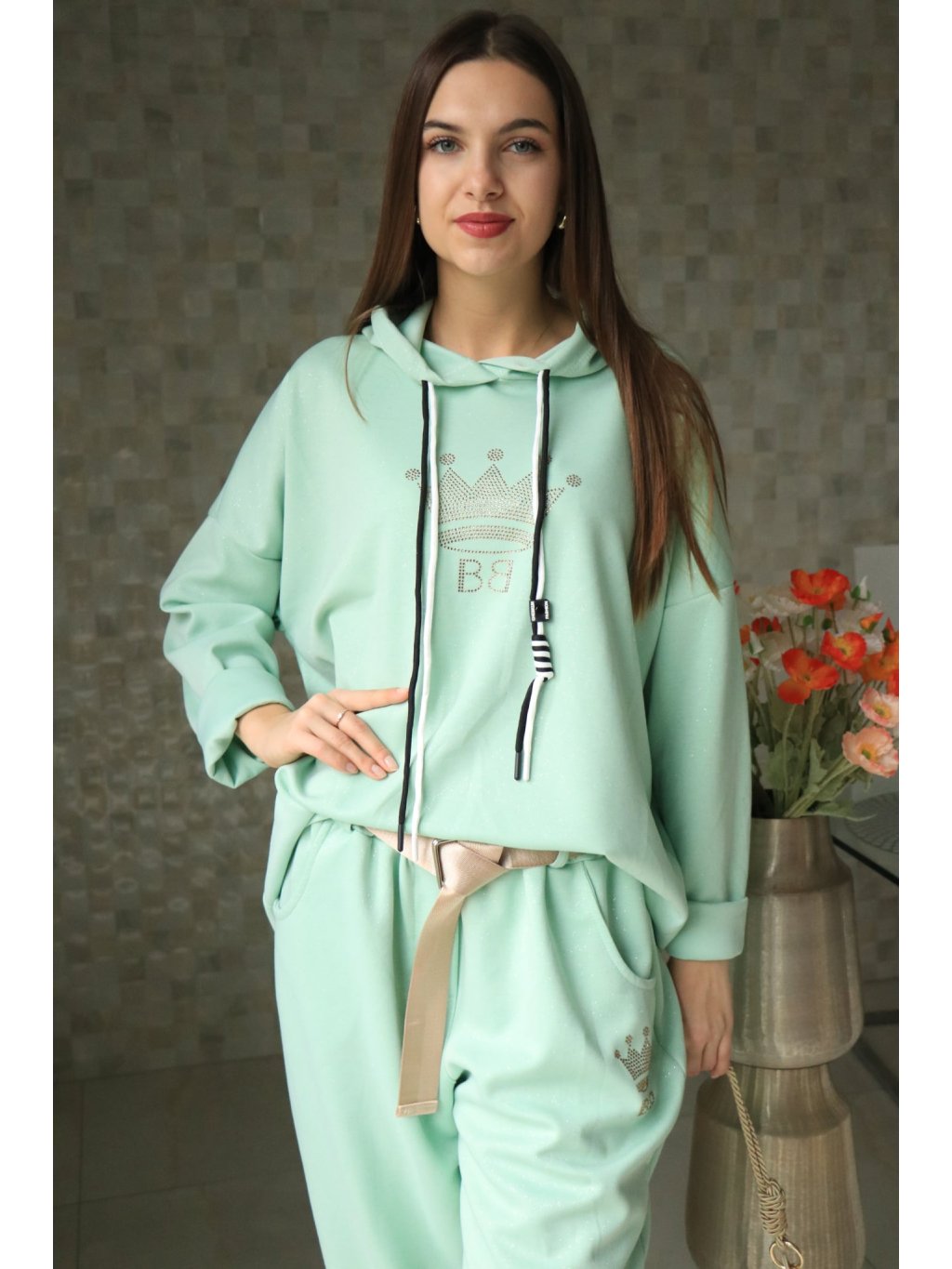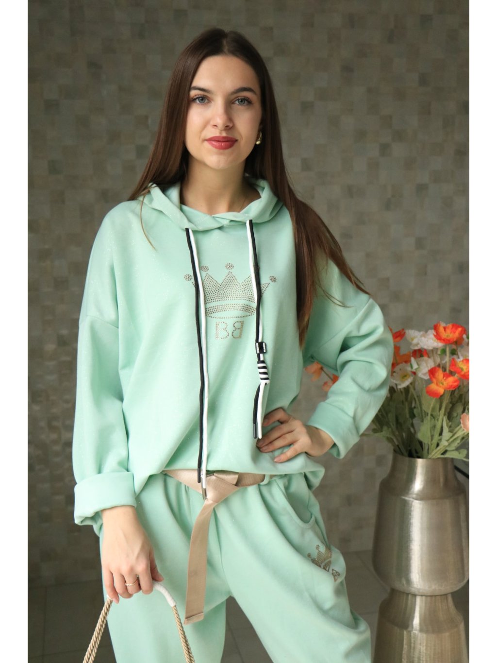💚✨ Mentolová souprava – mikina a kalhoty s třpytkami, styl a pohodlí v jednom ✨💚